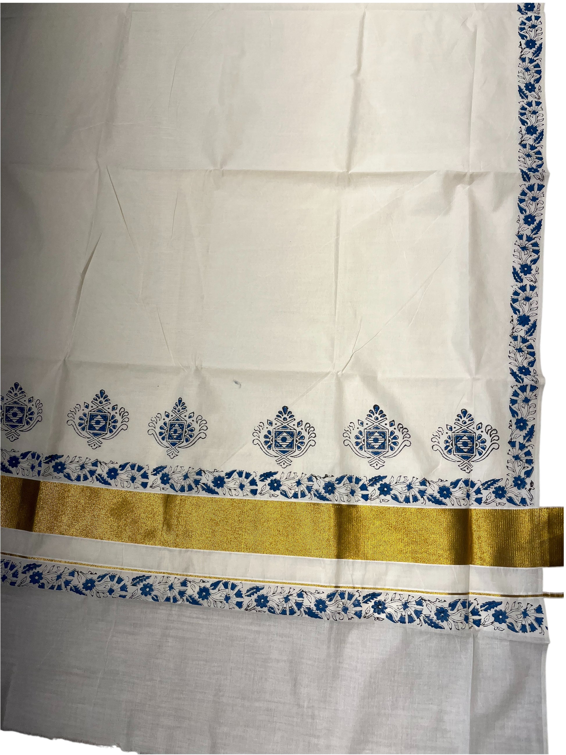 Southloom Cotton Kerala Kasavu Saree with Blue Block Prints On Border