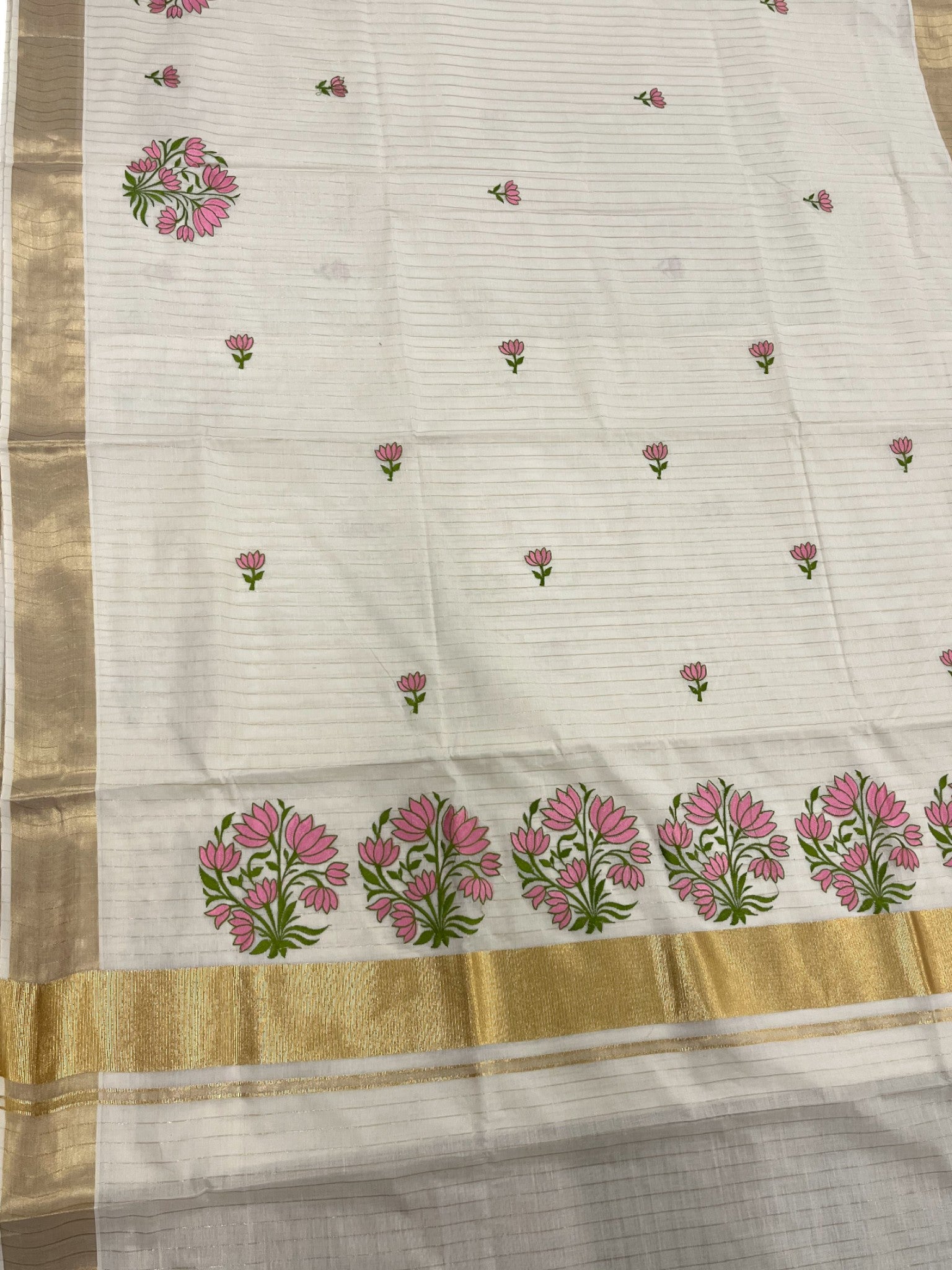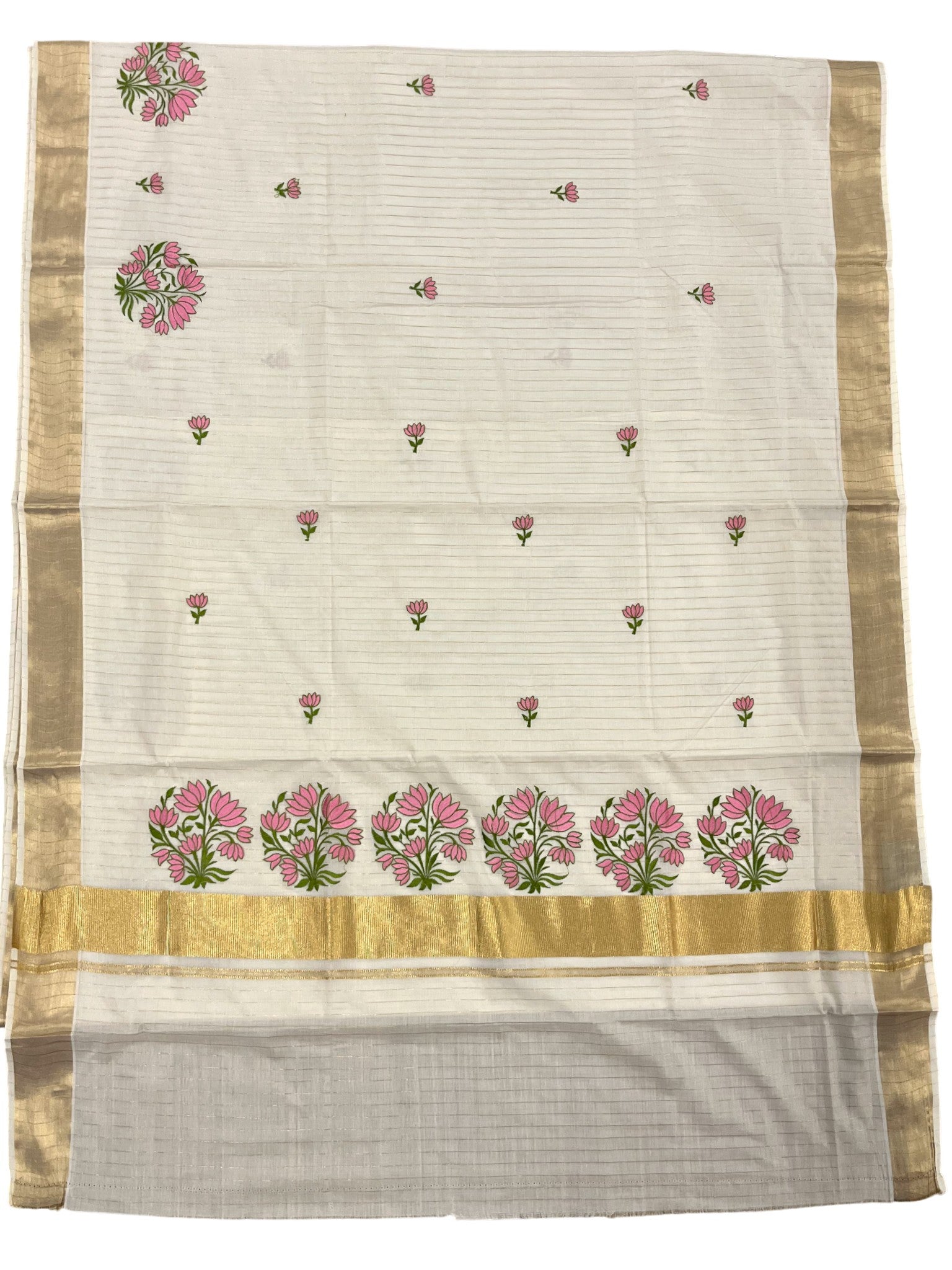 Southloom Kerala Cotton Kasavu Saree Pink Floral Embroidery Design