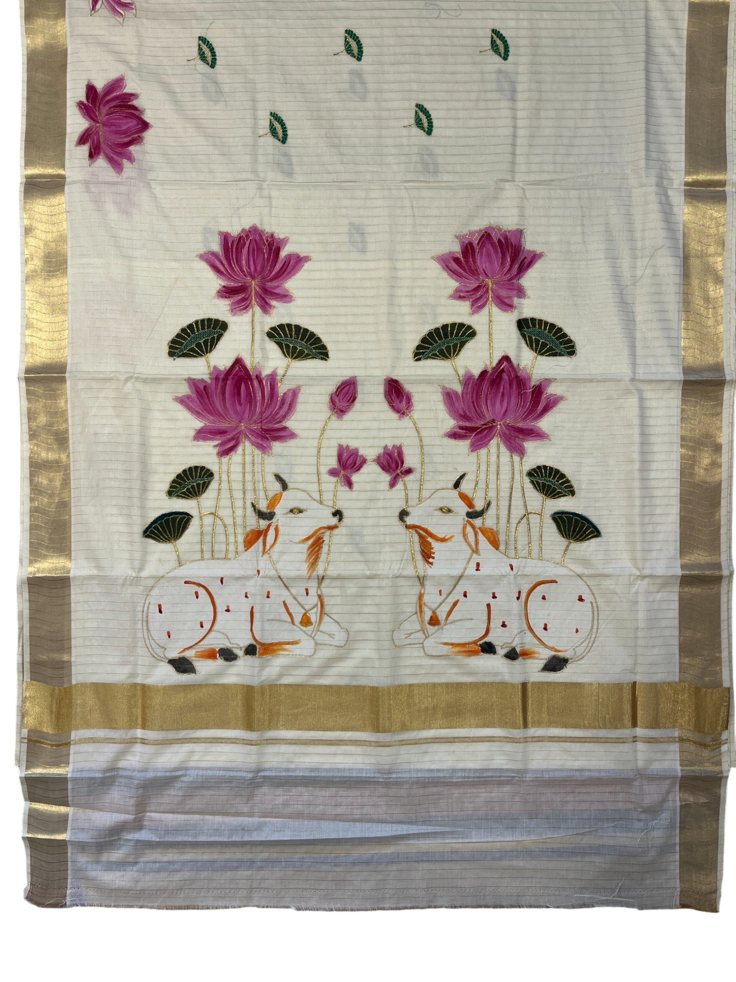 Southloom Cotton Kerala Kasavu Saree with Hand Painted Embroidery Nandi and Lotus Design