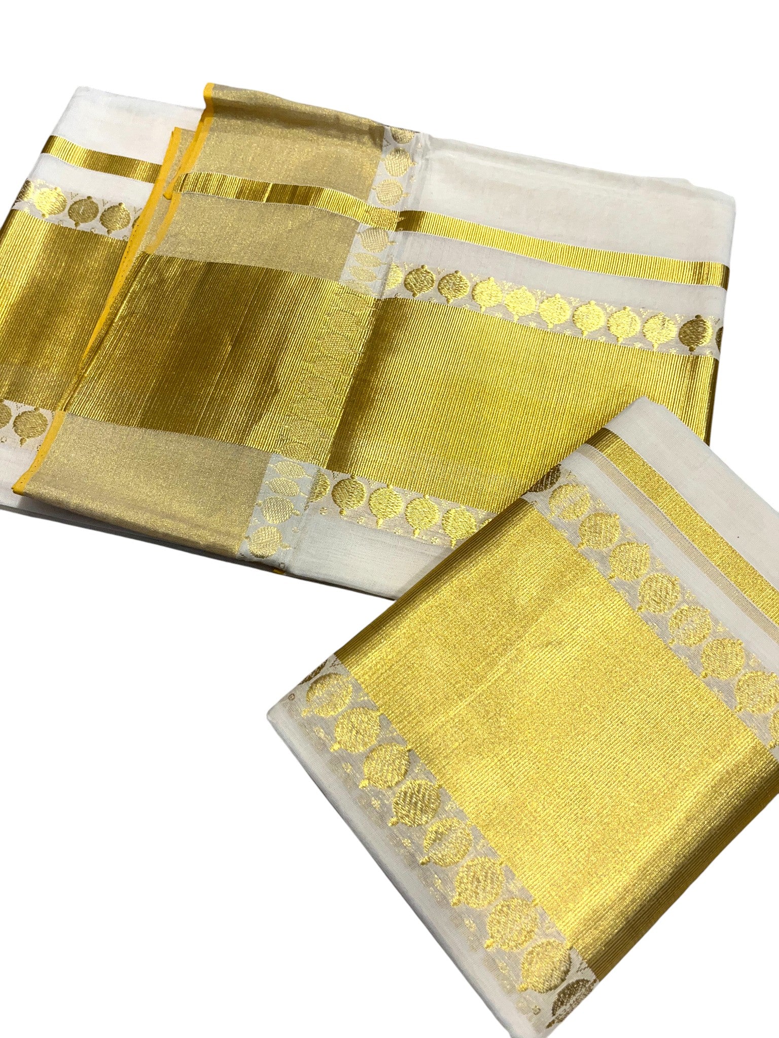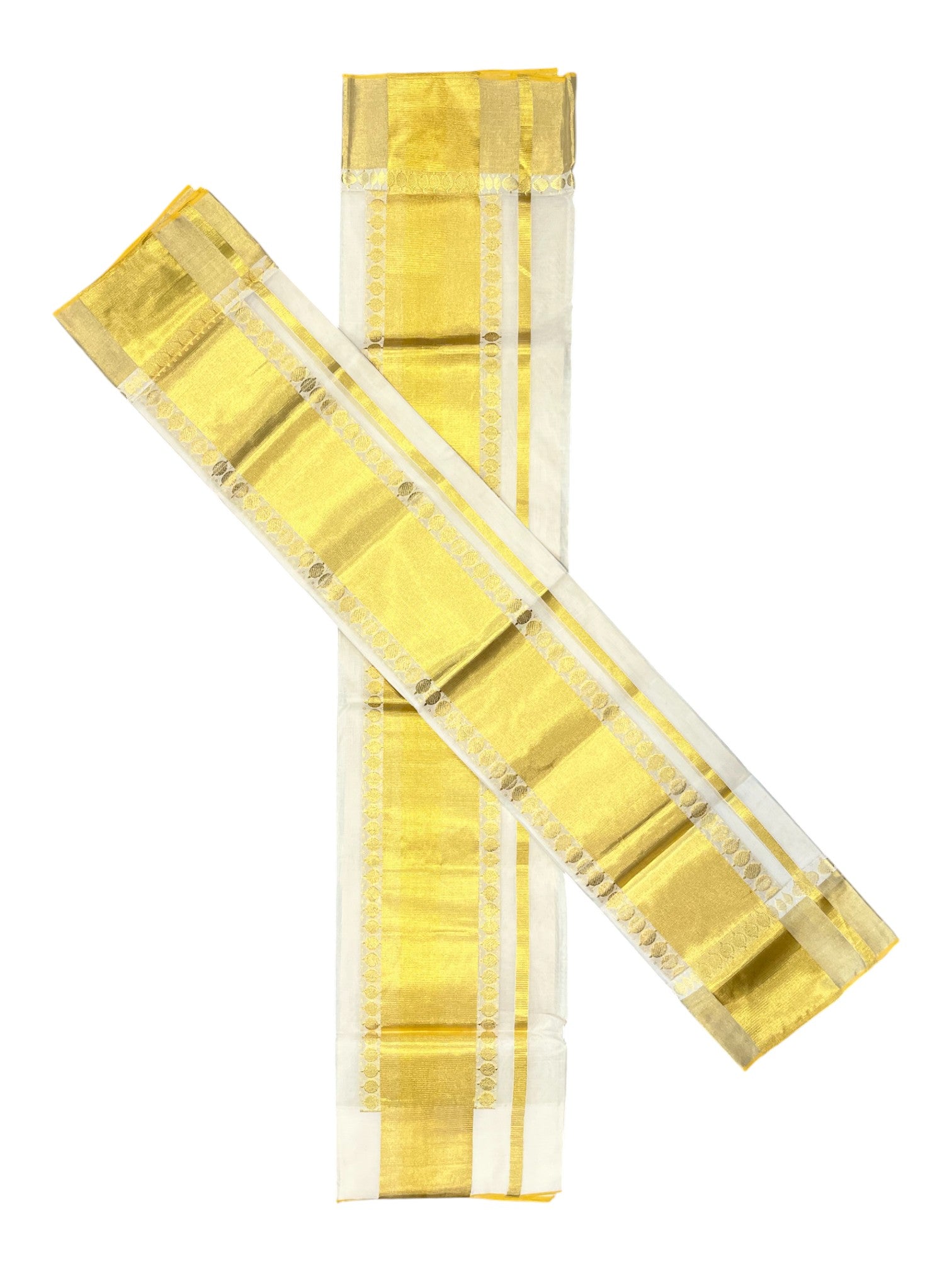 Southloom Handloom Premium Cotton Kasavu Set Mundu With Polka Woven Patterns On Border (Mundum Neriyathum) 2.80 Mtrs