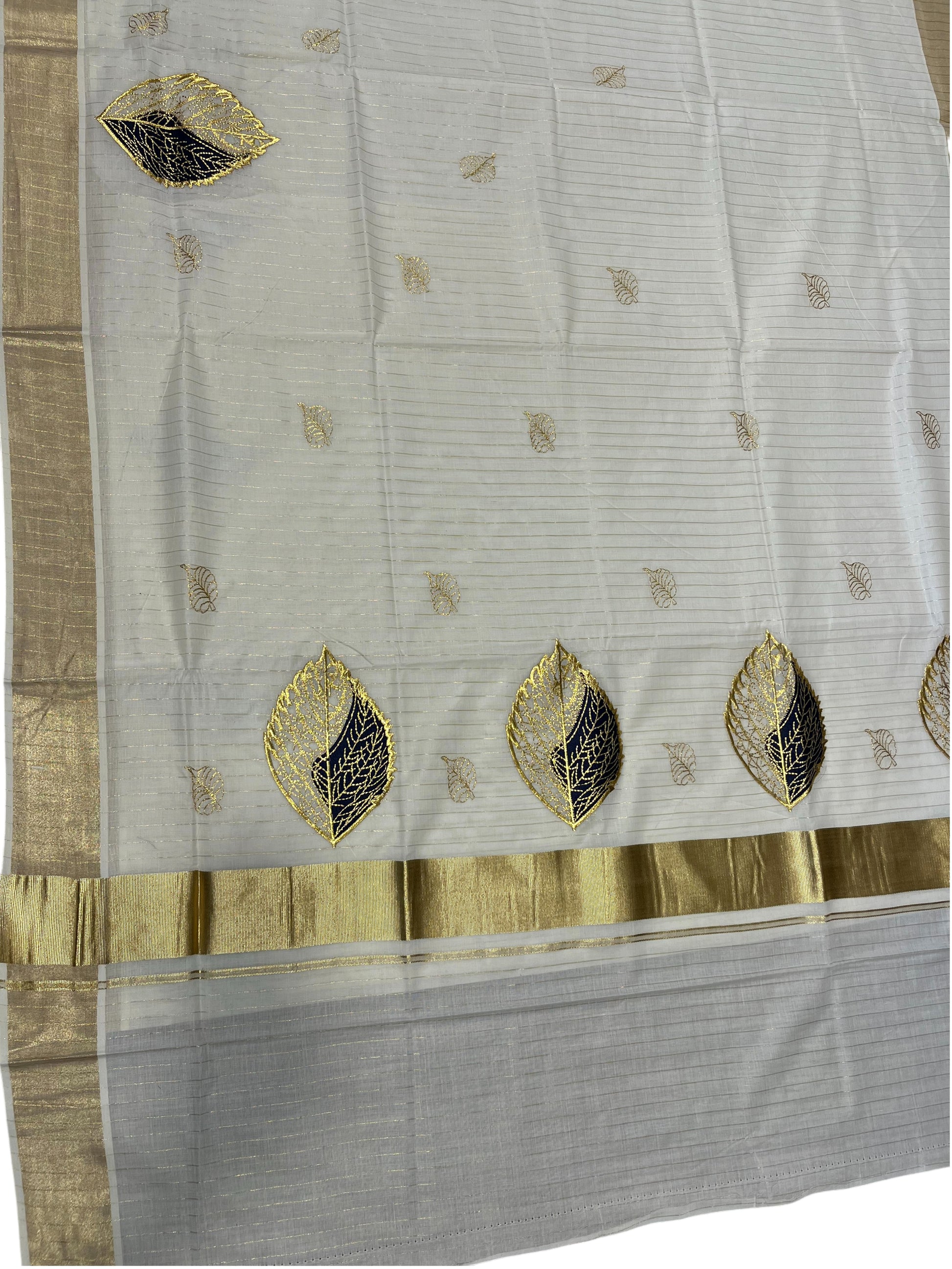Off-white Kerala Saree with Floral Embroidery Designs on Body. Simple saree for everyday wear, may it be to the office or to the temple.