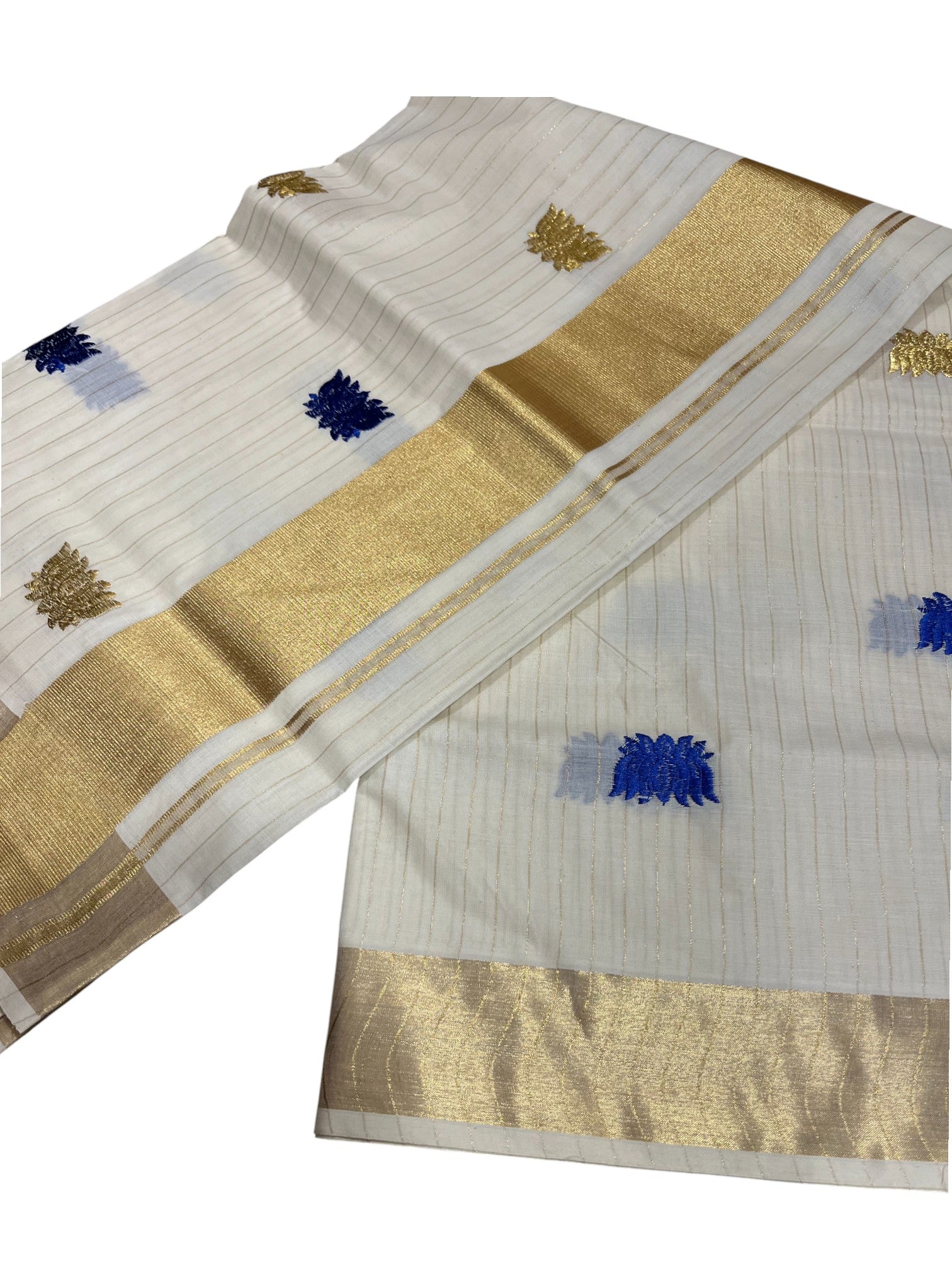 Southloom Kerala Cotton Kasavu Line Saree with Blue Lotus Embroidery Works