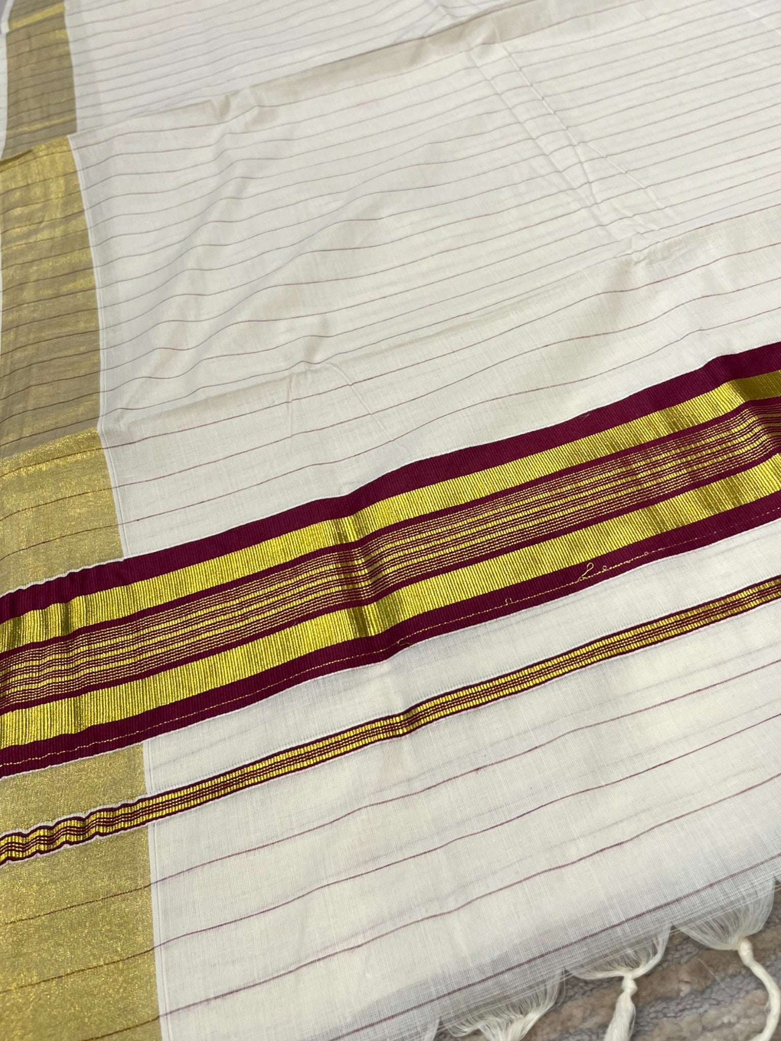 Cotton Kerala Saree with Stripes Designs on Body. Simple saree for everyday wear, may it be to the office or to the temple.