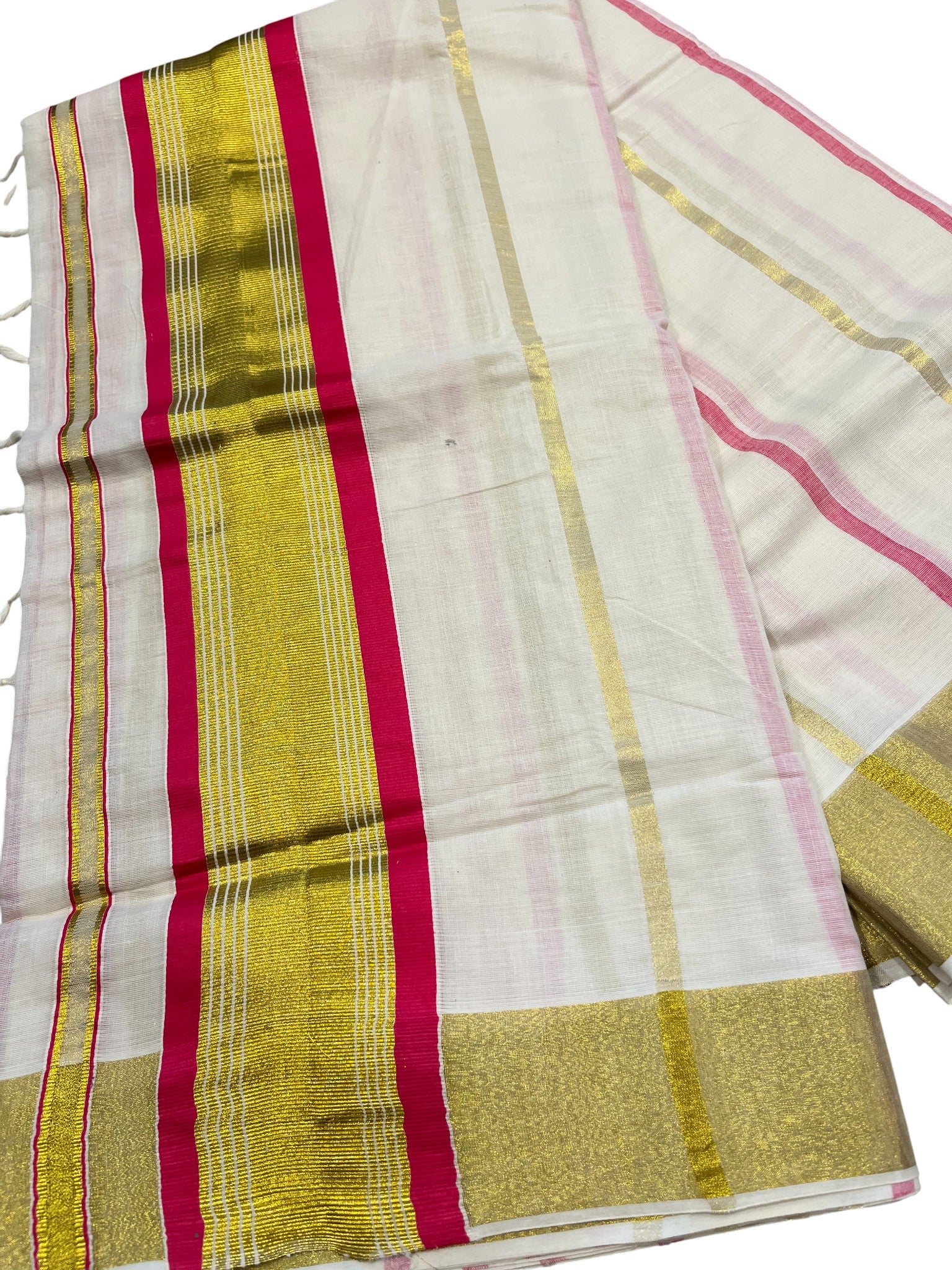 Southloom Kerala Cotton Kasavu Saree with Gold And Pink Lines on Body