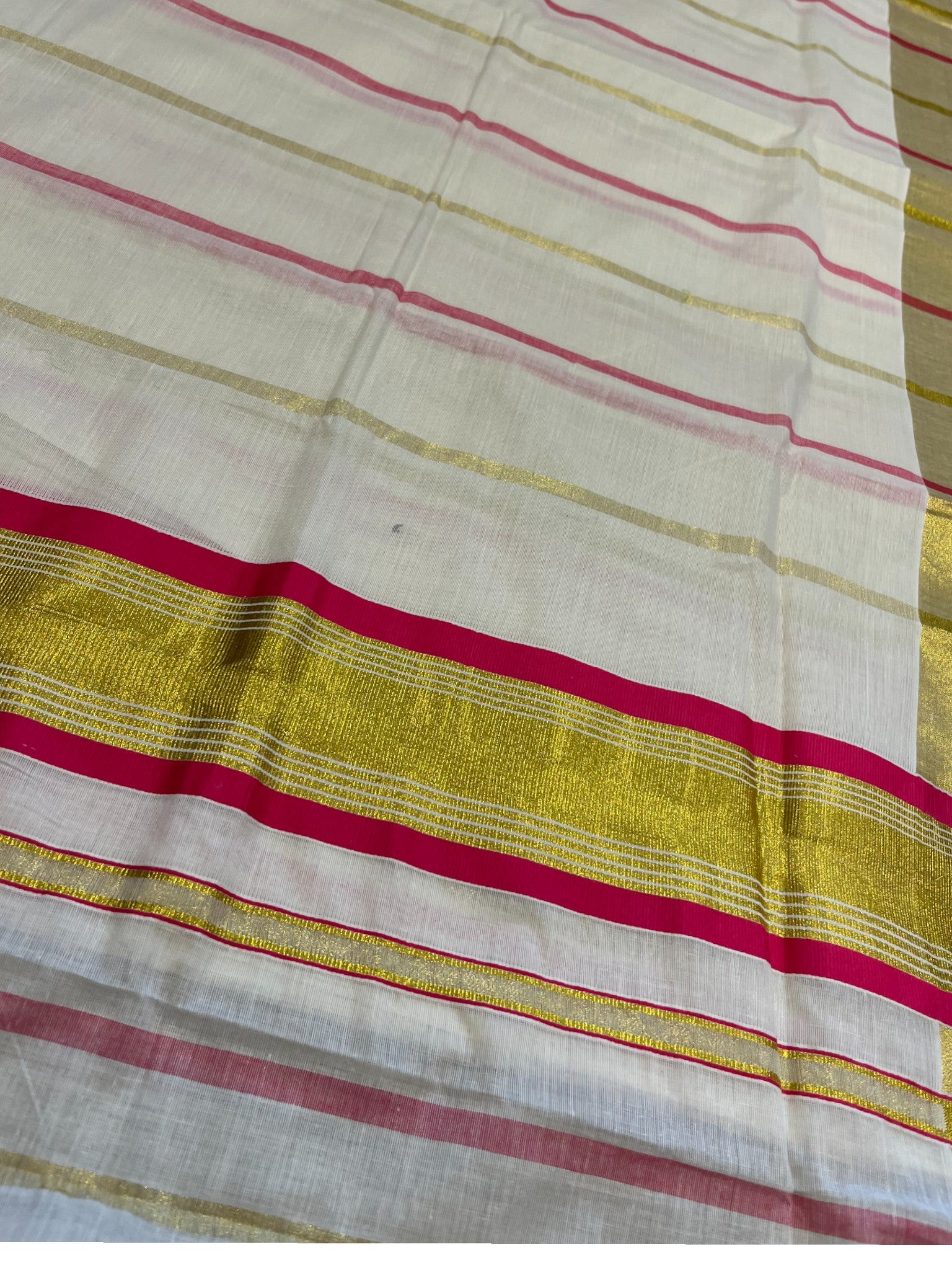 Cotton Kerala Saree with Stripes Designs on Body. Simple saree for everyday wear, may it be to the office or to the temple.