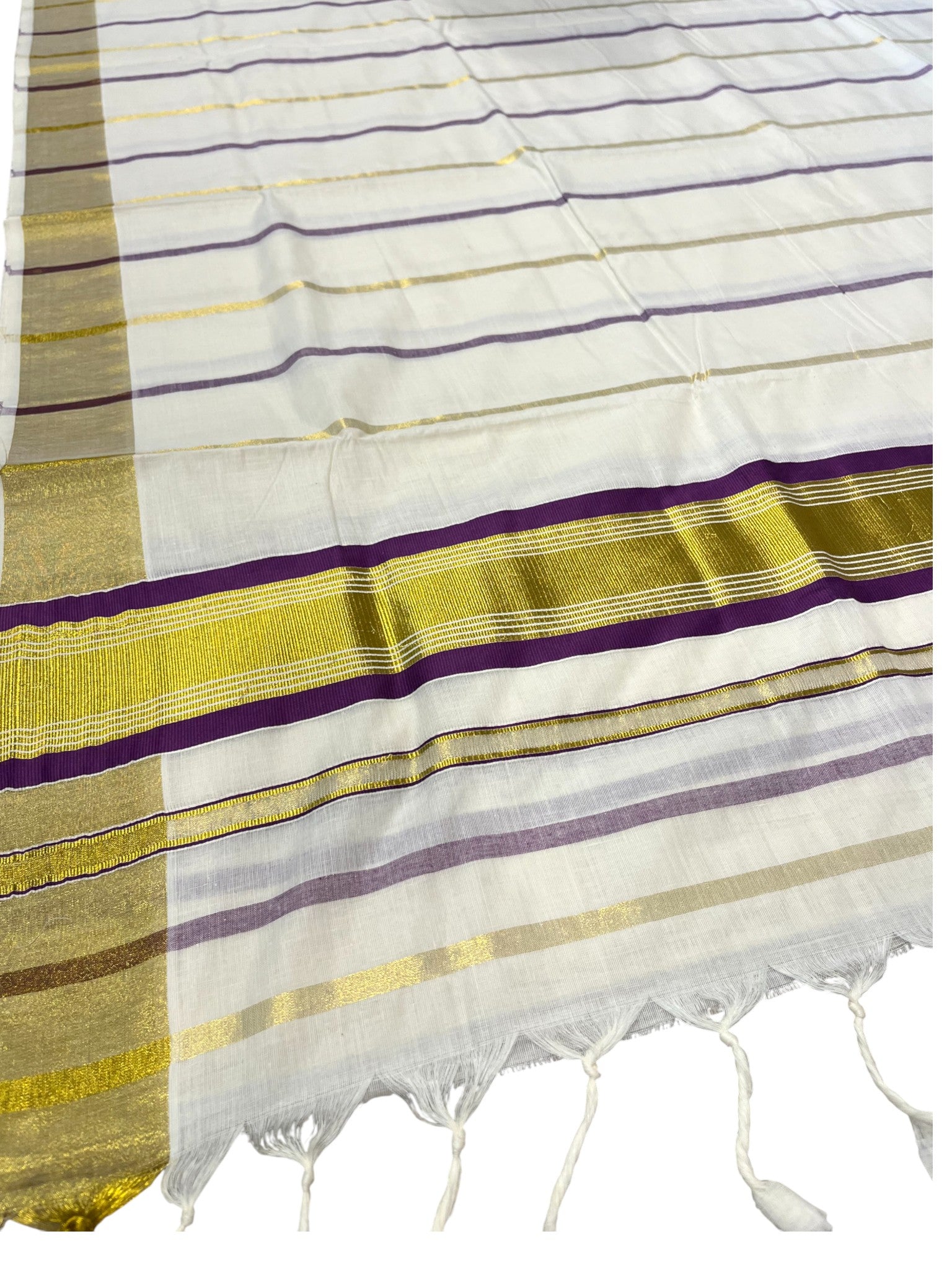 Southloom Kerala Cotton Kasavu Saree with Gold And Purple Lines on Body