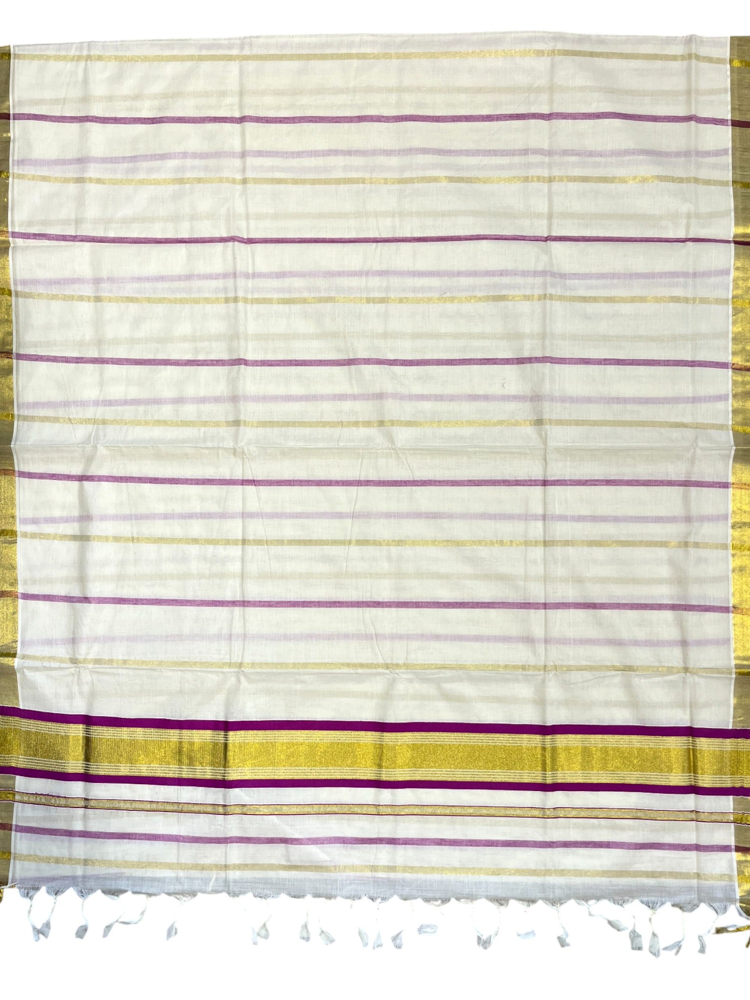 Cotton Kerala Saree with Stripes Designs on Body. Simple saree for everyday wear, may it be to the office or to the temple.