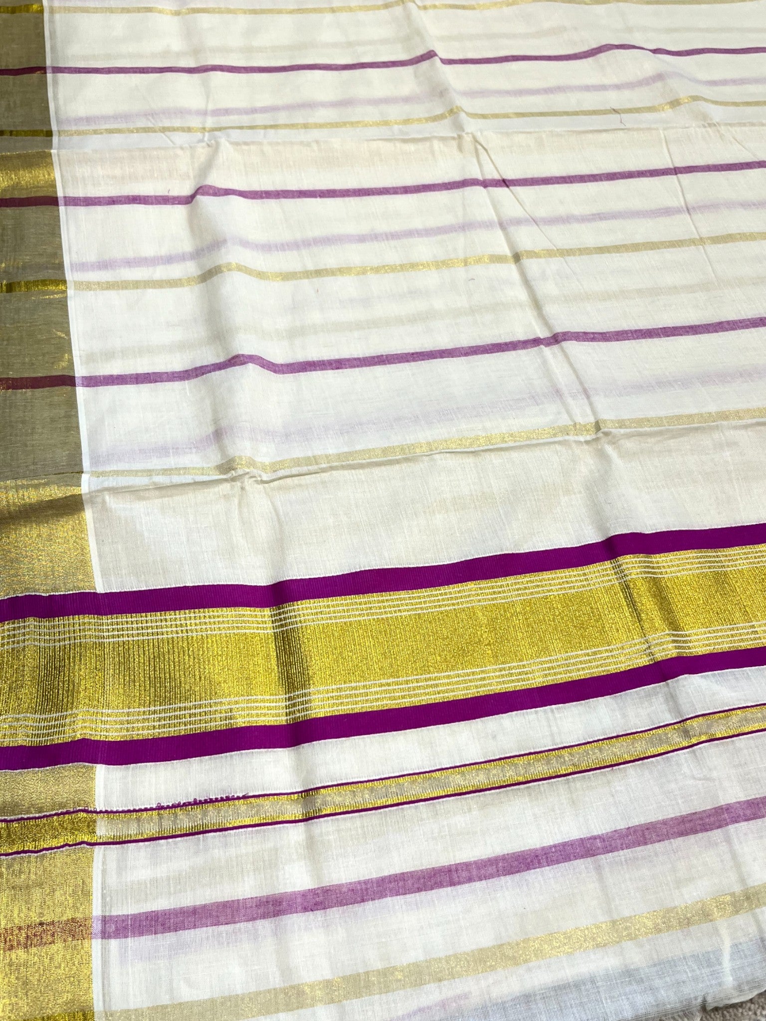 Southloom Kerala Cotton Kasavu Saree with Gold And Purple Lines on Body