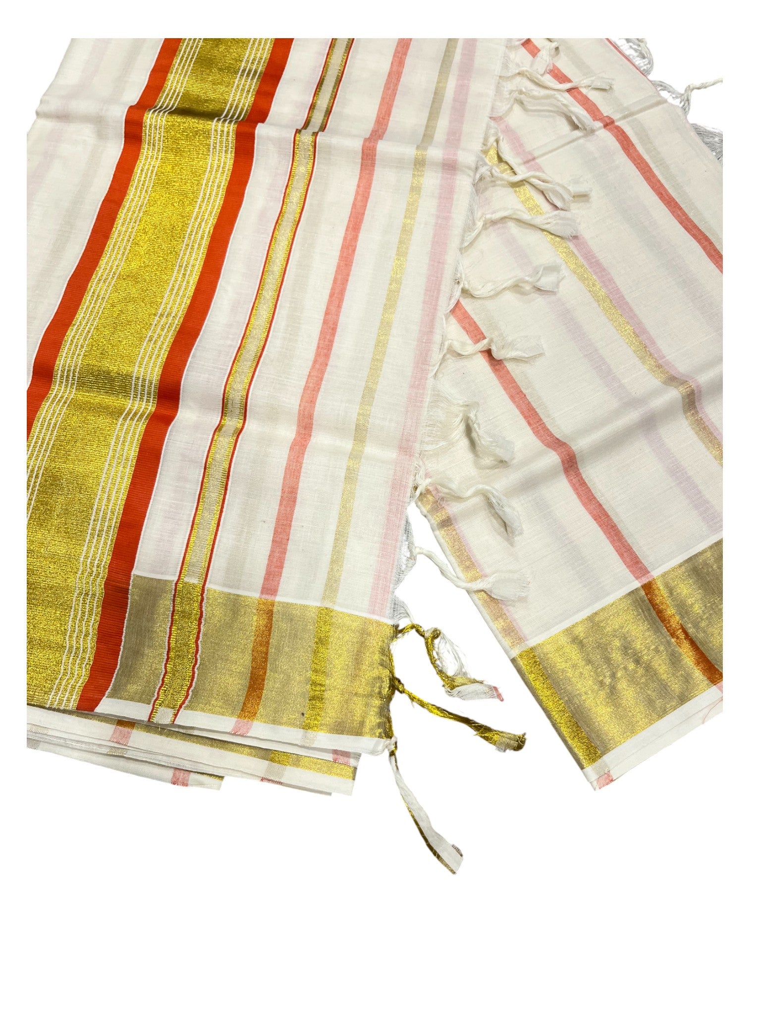 Southloom Kerala Cotton Kasavu Saree with Gold And Red Lines on Body