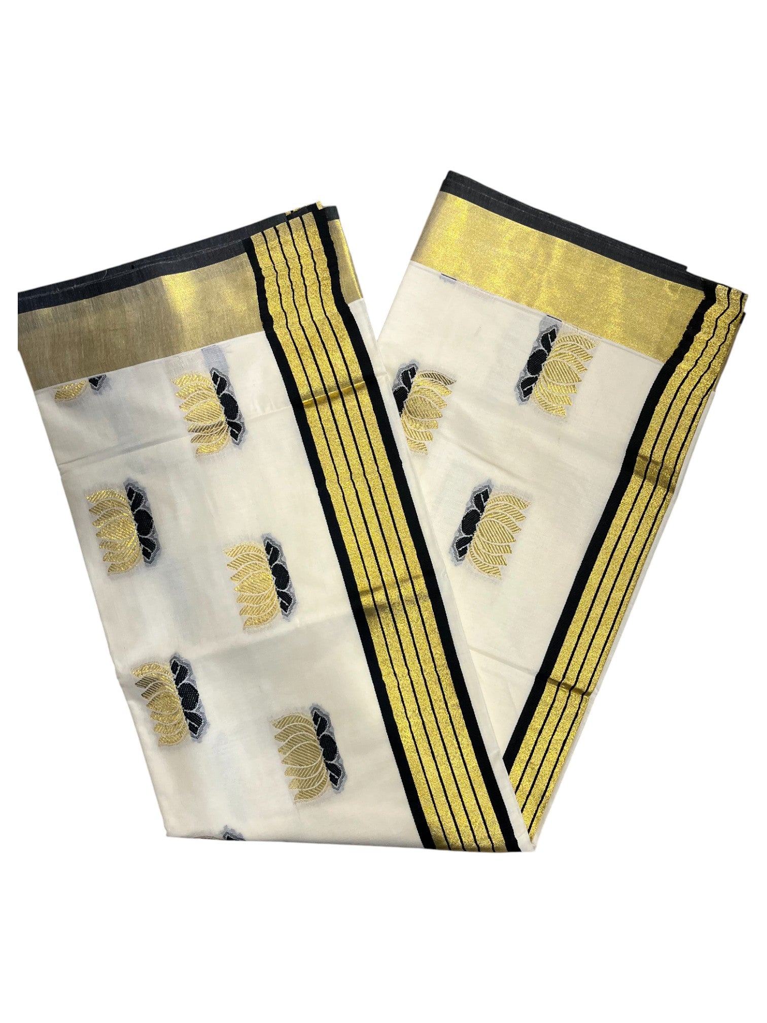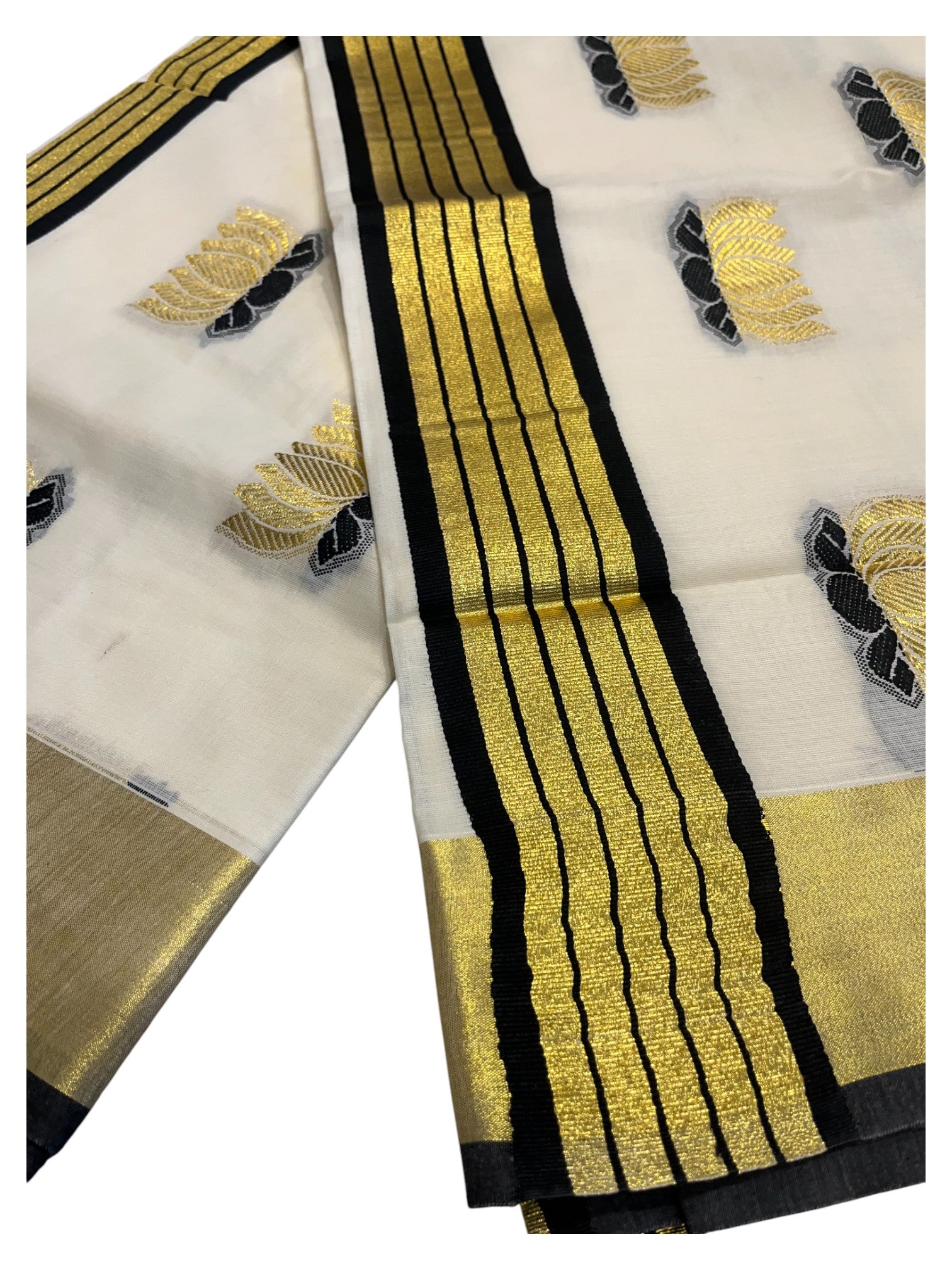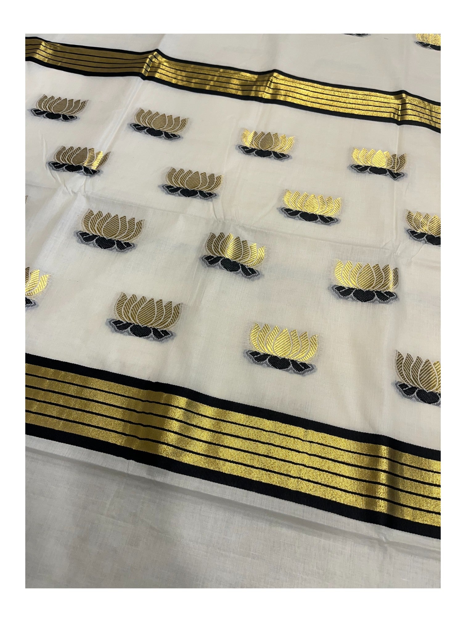 Southloom Kerala Cotton Kasavu Saree with Lotus Woven Work in Black