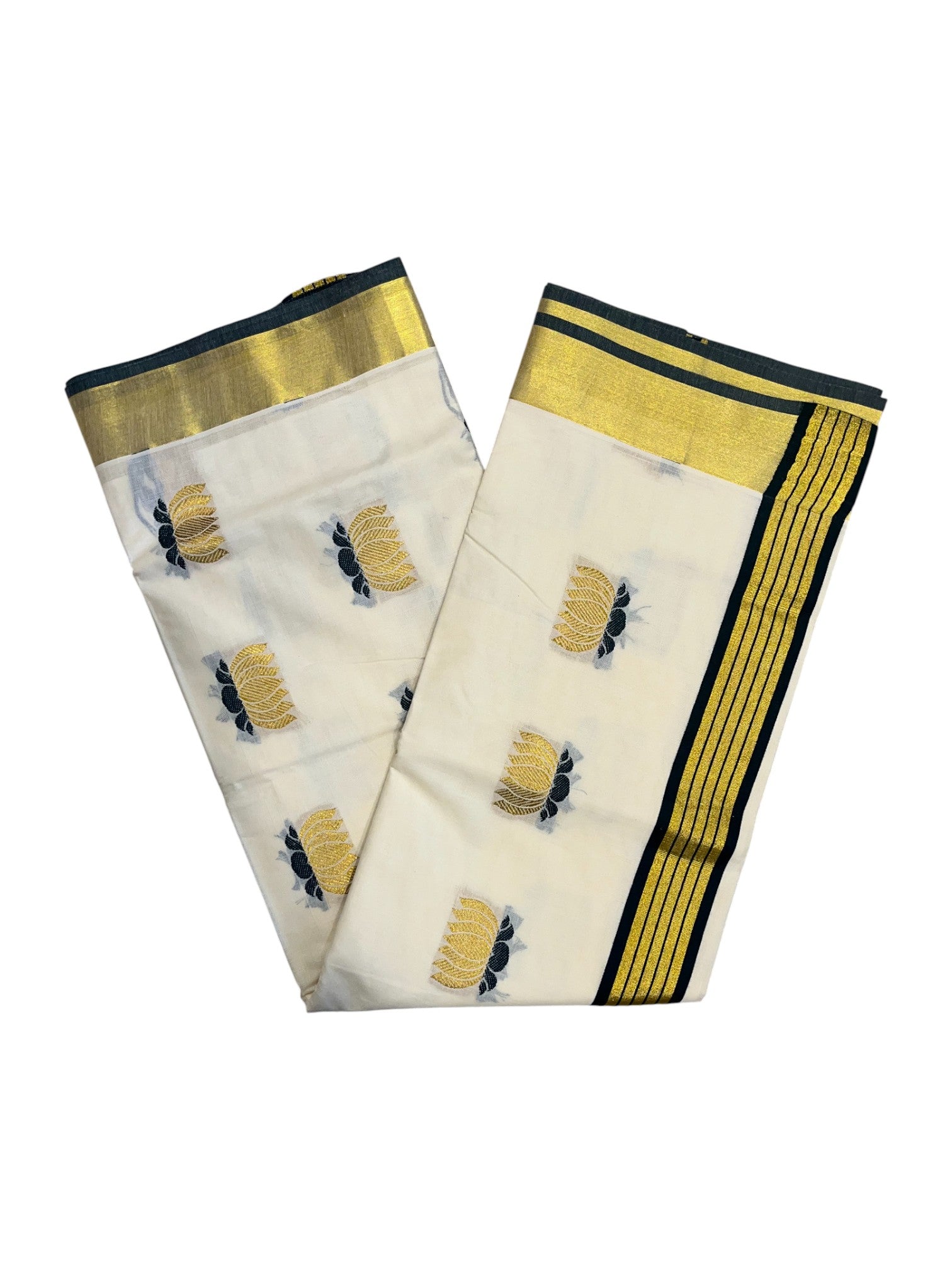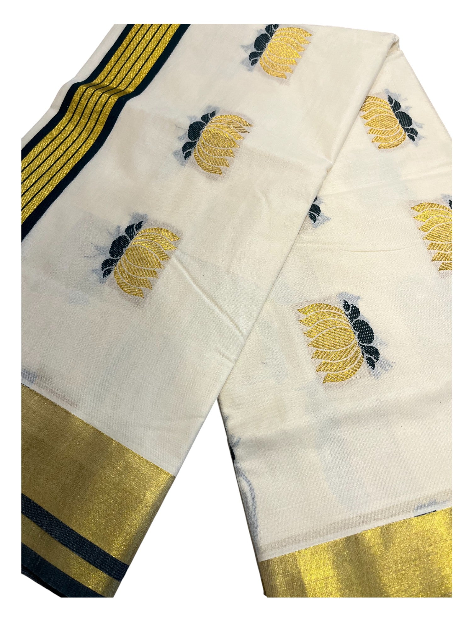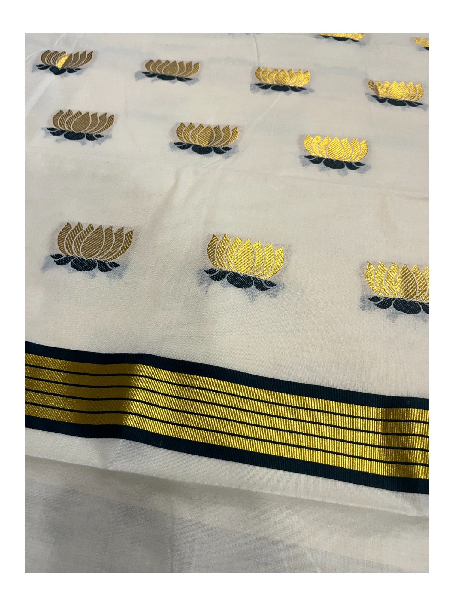 Southloom Kerala Cotton Kasavu Saree with Lotus Woven Work in Green