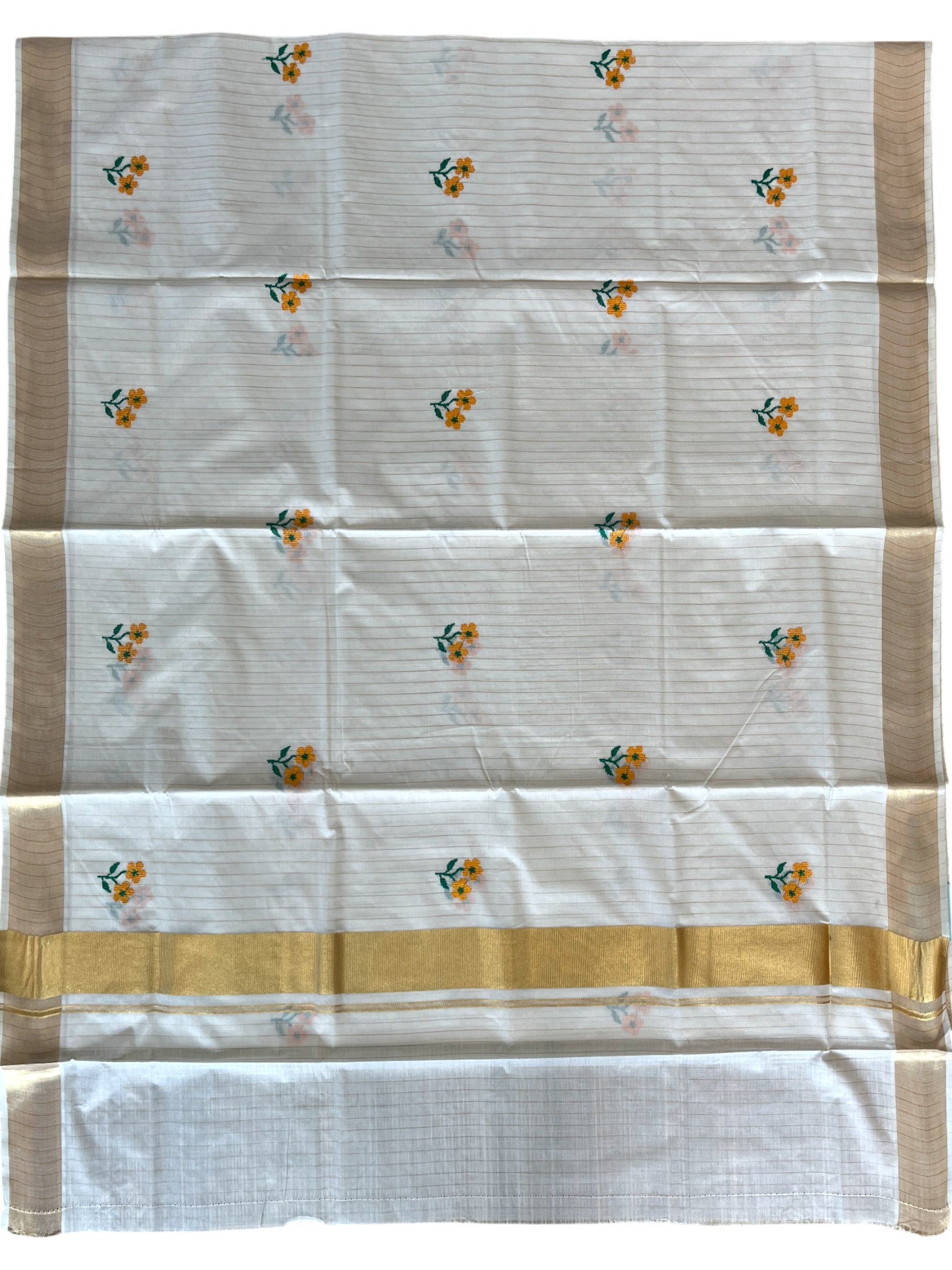 Southloom Kerala Cotton Kasavu Stripes Saree with Yellow Floral Embroidery Work