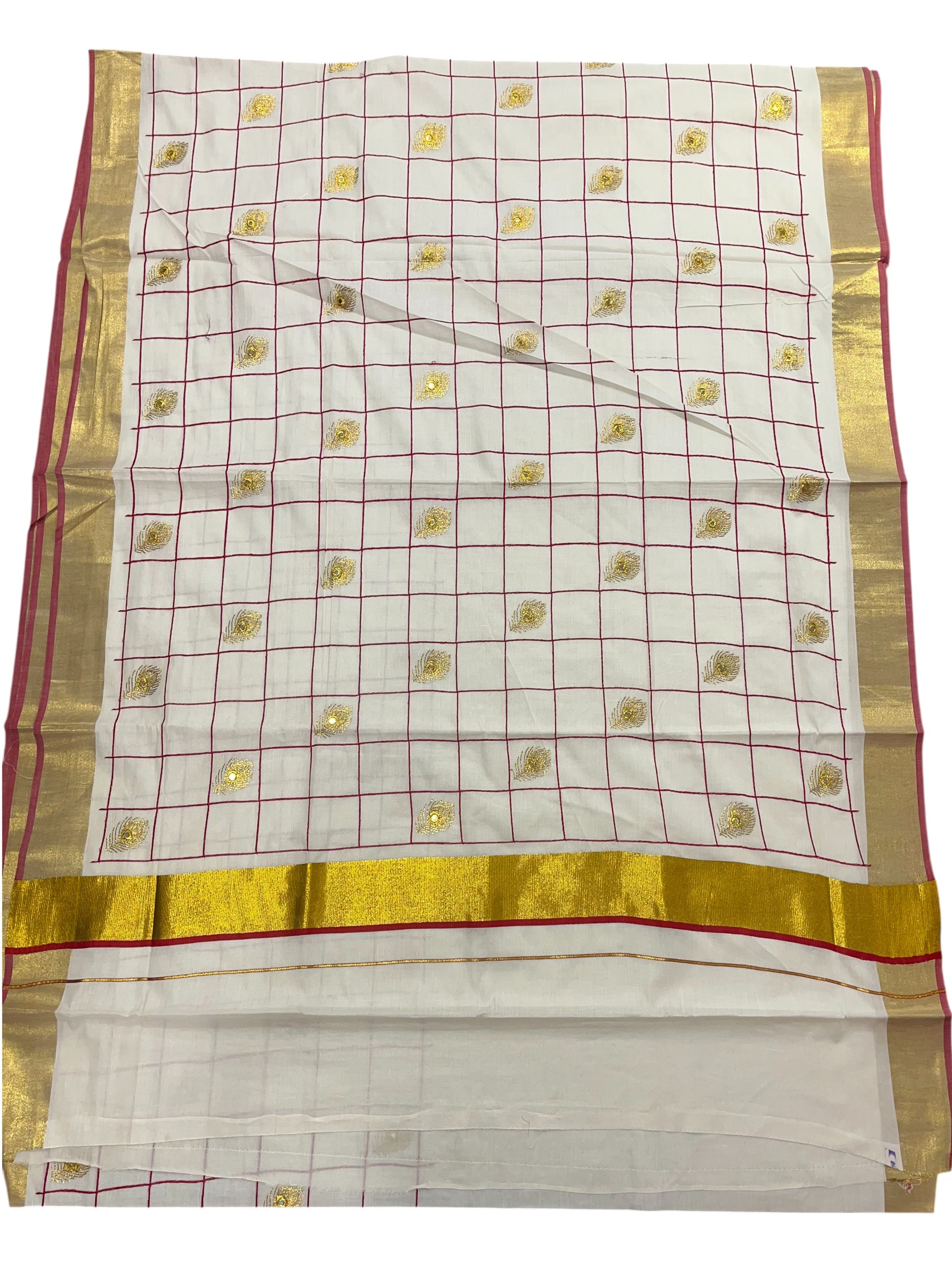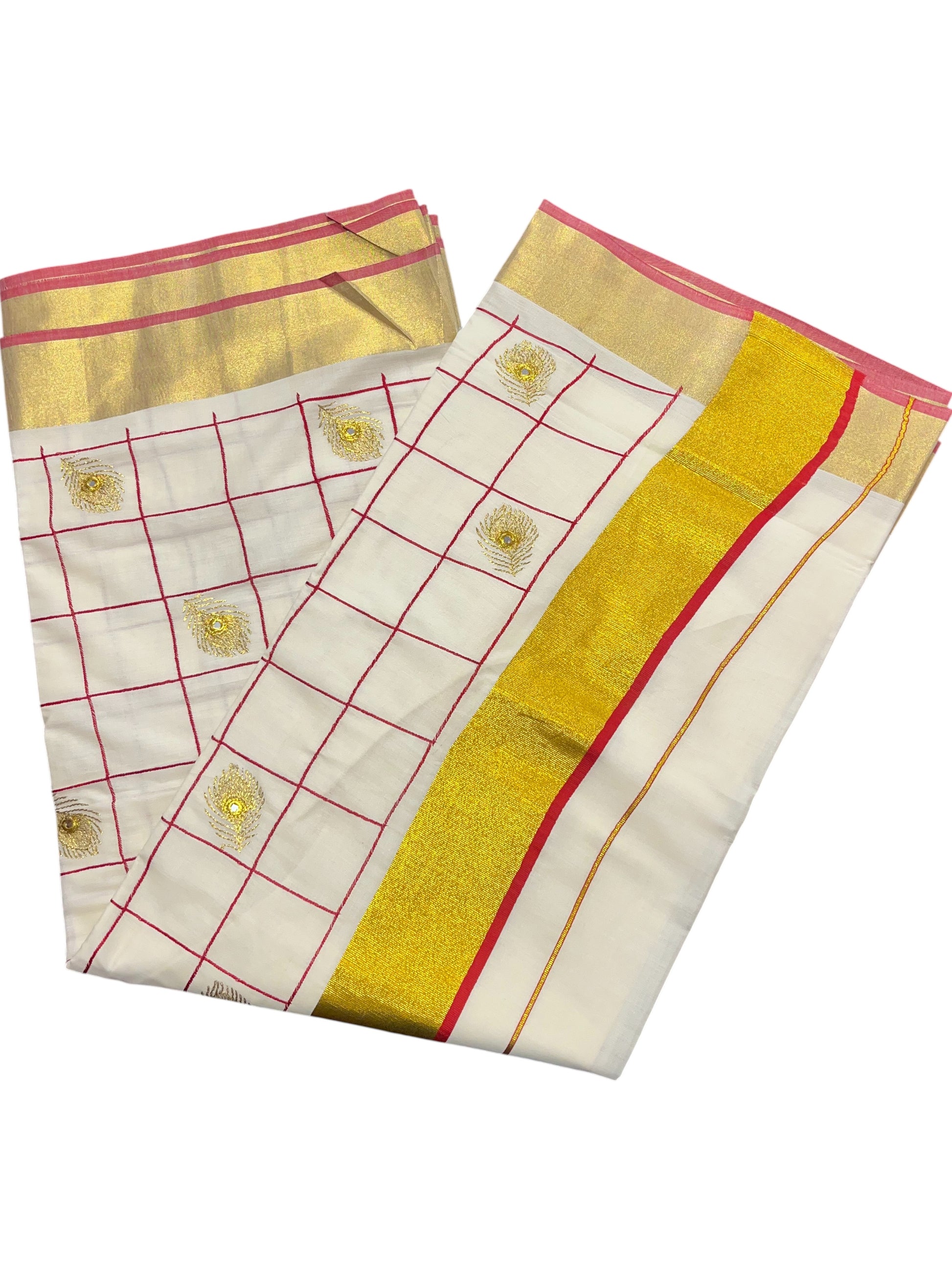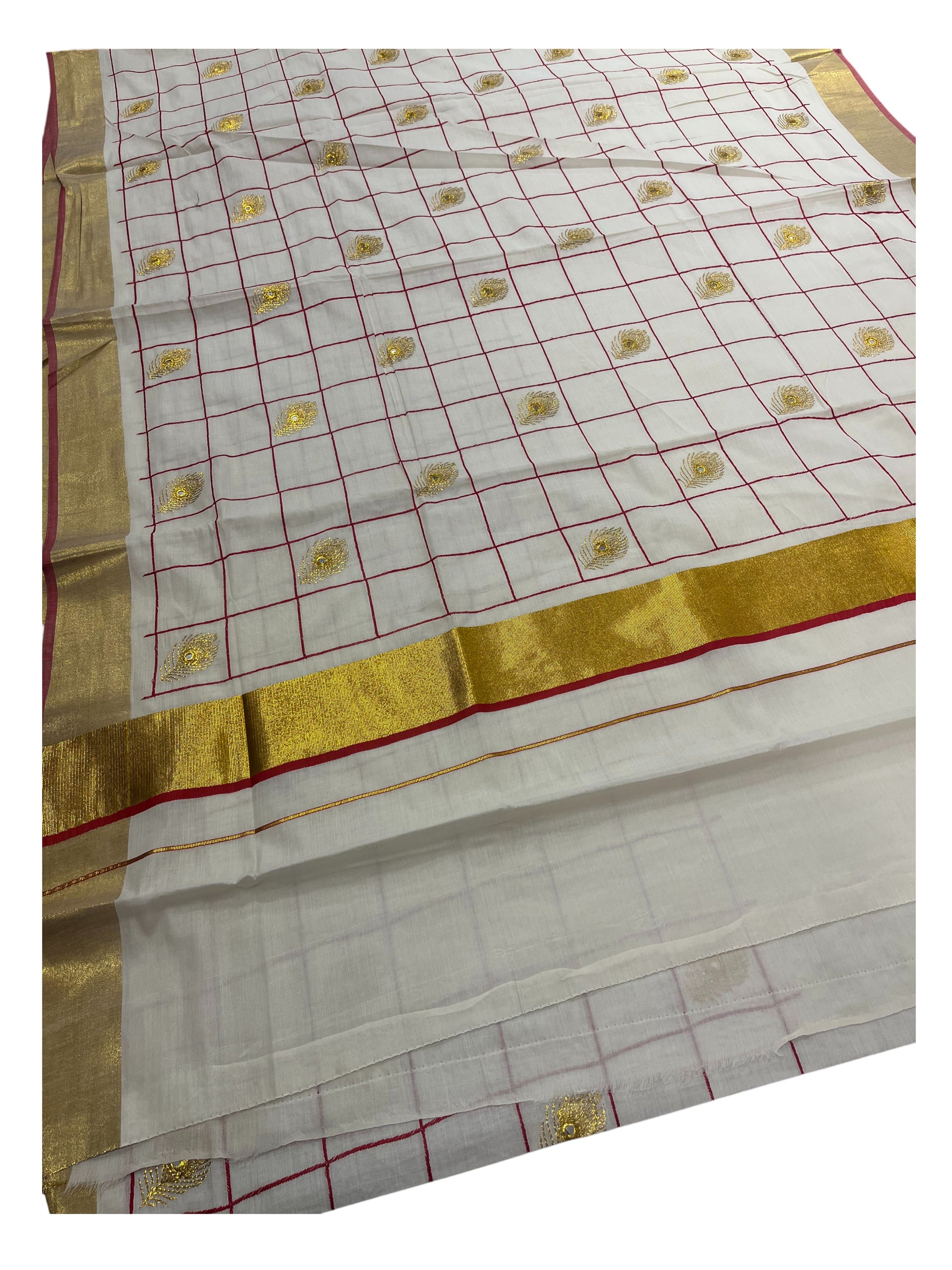 Southloom Kerala Cotton Saree with Red and Golden Peacock feather Embroidery Works