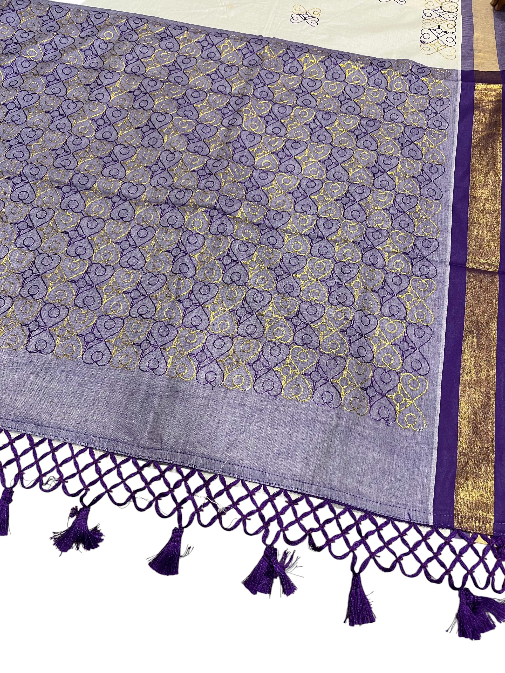 Southloom Kerala Cotton Saree with Violet and Golden Embroidery Works