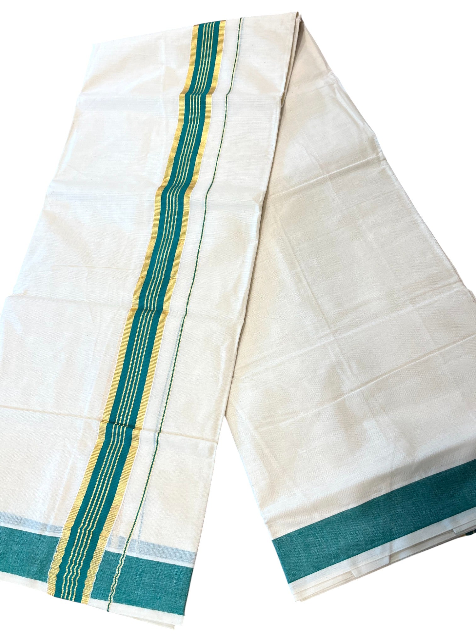 Southloom Kerala Pure Cotton Double Mundu with Gold Lines & Green Border (South Indian Dhoti)