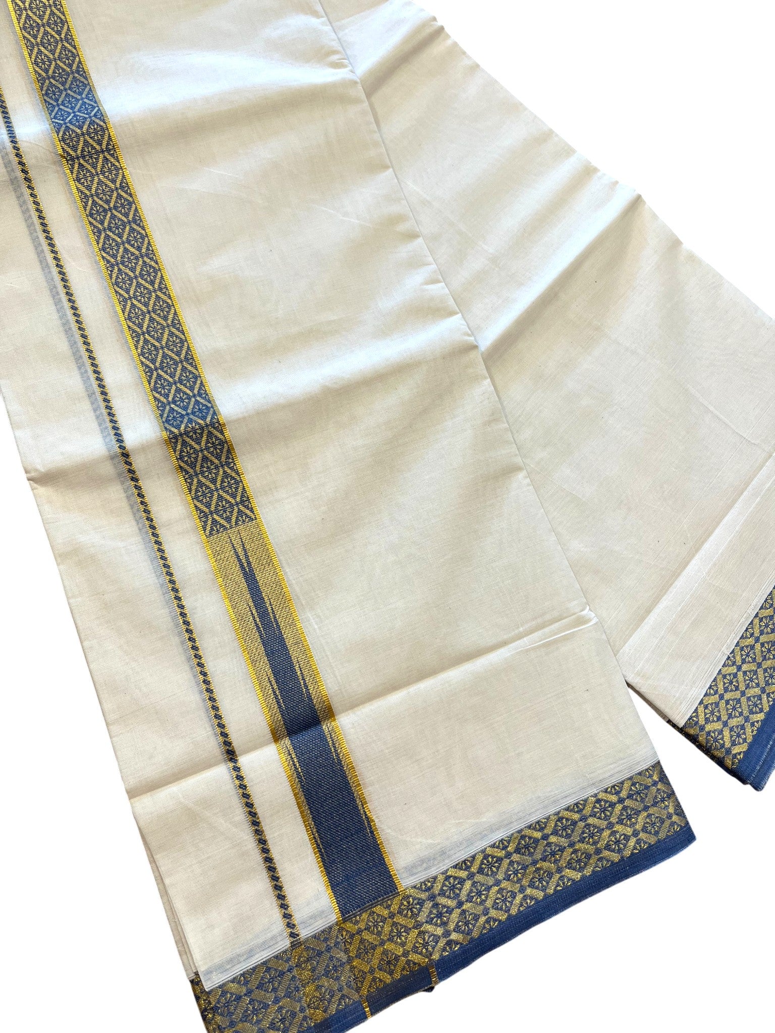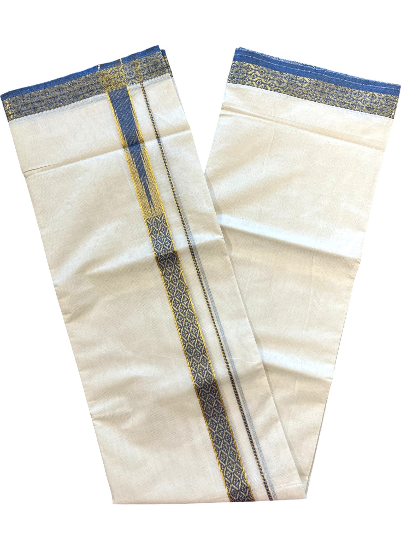 Southloom Kerala Pure Cotton Double Mundu with Kasavu Kara and Blue Border (South Indian Dhoti)