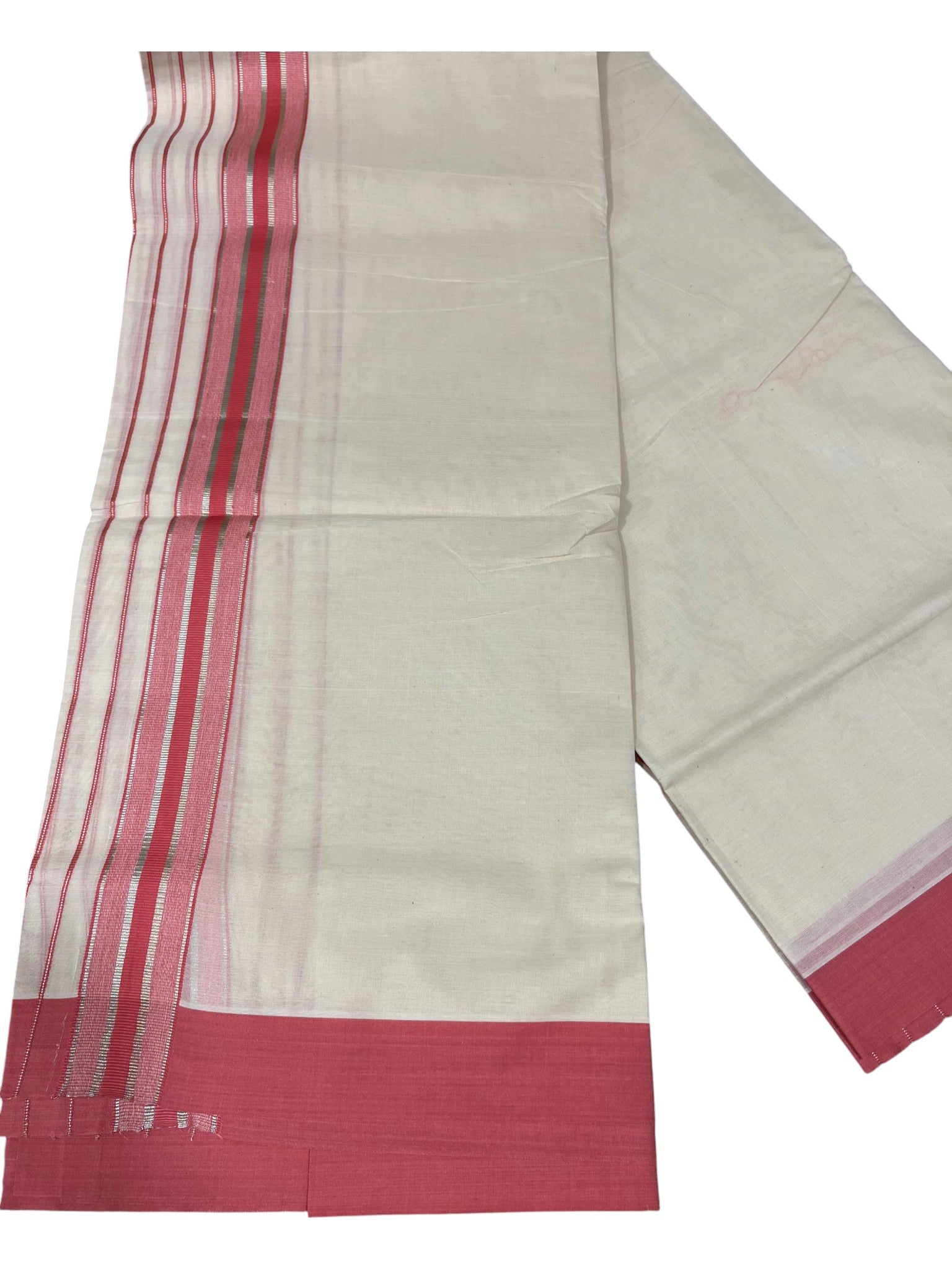 Southloom Kerala Pure Cotton Double Mundu with Pink And Silver Lines Border (South Indian Dhoti)