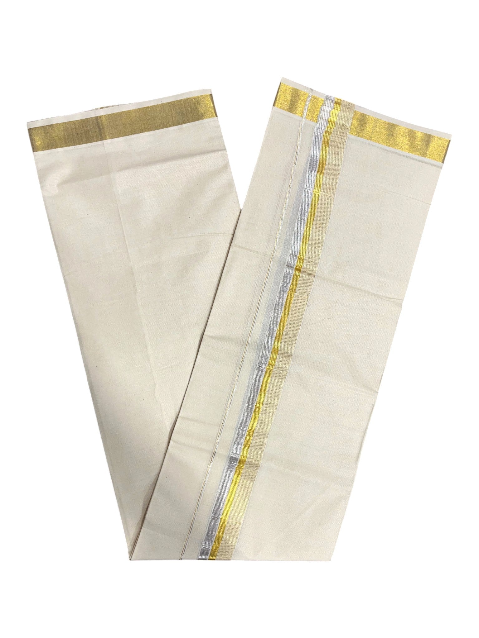 Southloom Kerala Pure Cotton Double Mundu with Silver Lines and Gold Border (South Indian Dhoti)