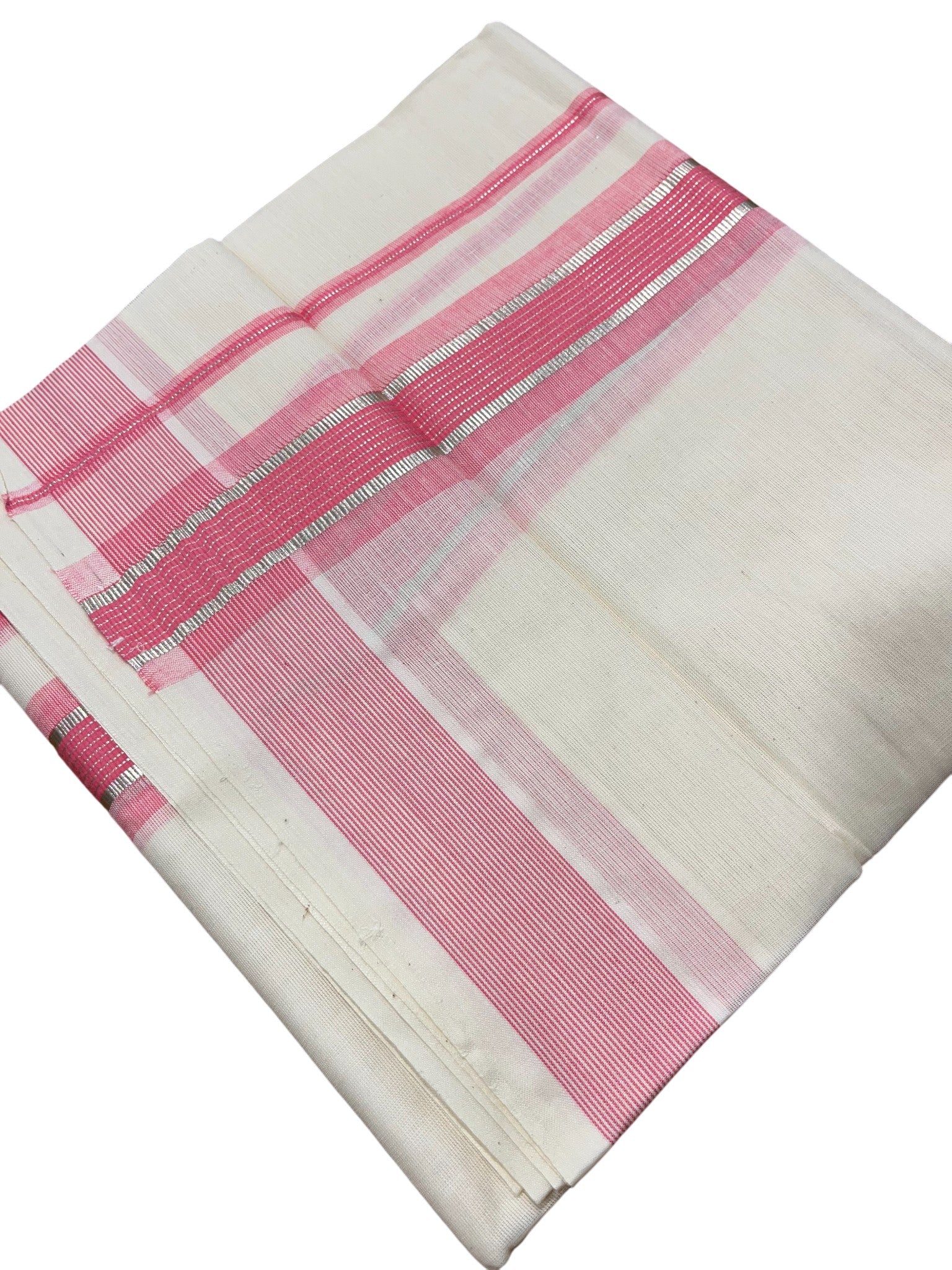 Southloom Kerala Pure Cotton Double Mundu with Silver Lines & Pink Border (South Indian Dhoti)