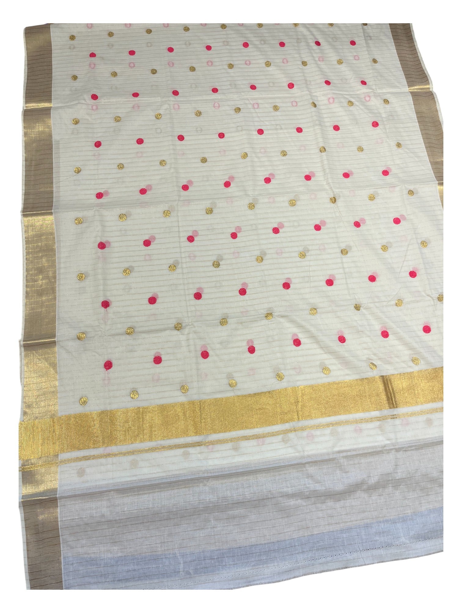 Southloom Kerala Pure Cotton Saree with Gold&Pink Polka Embroidery Works on Body