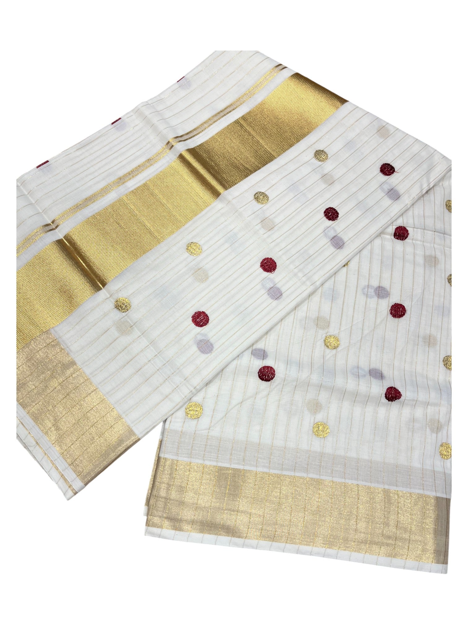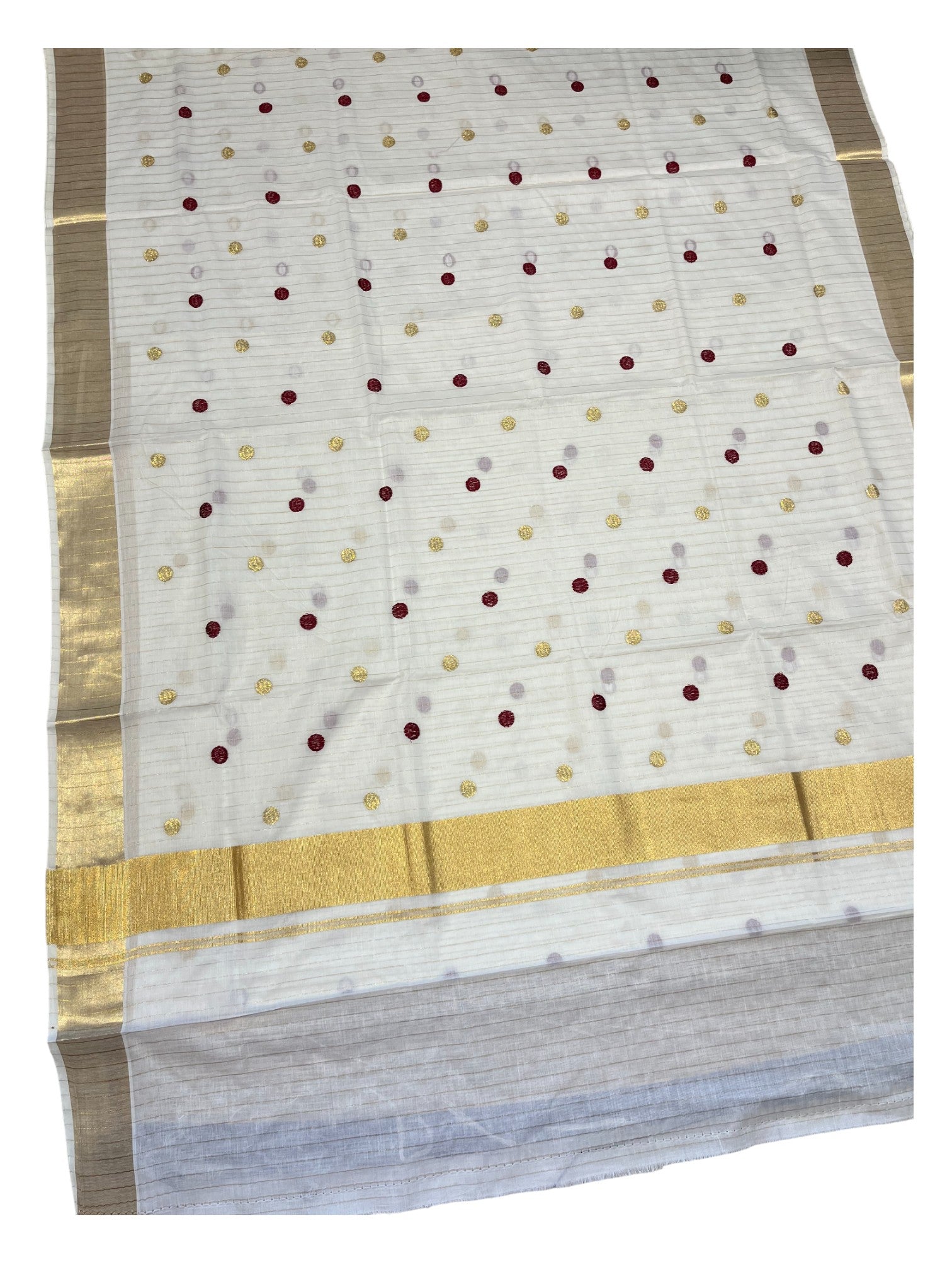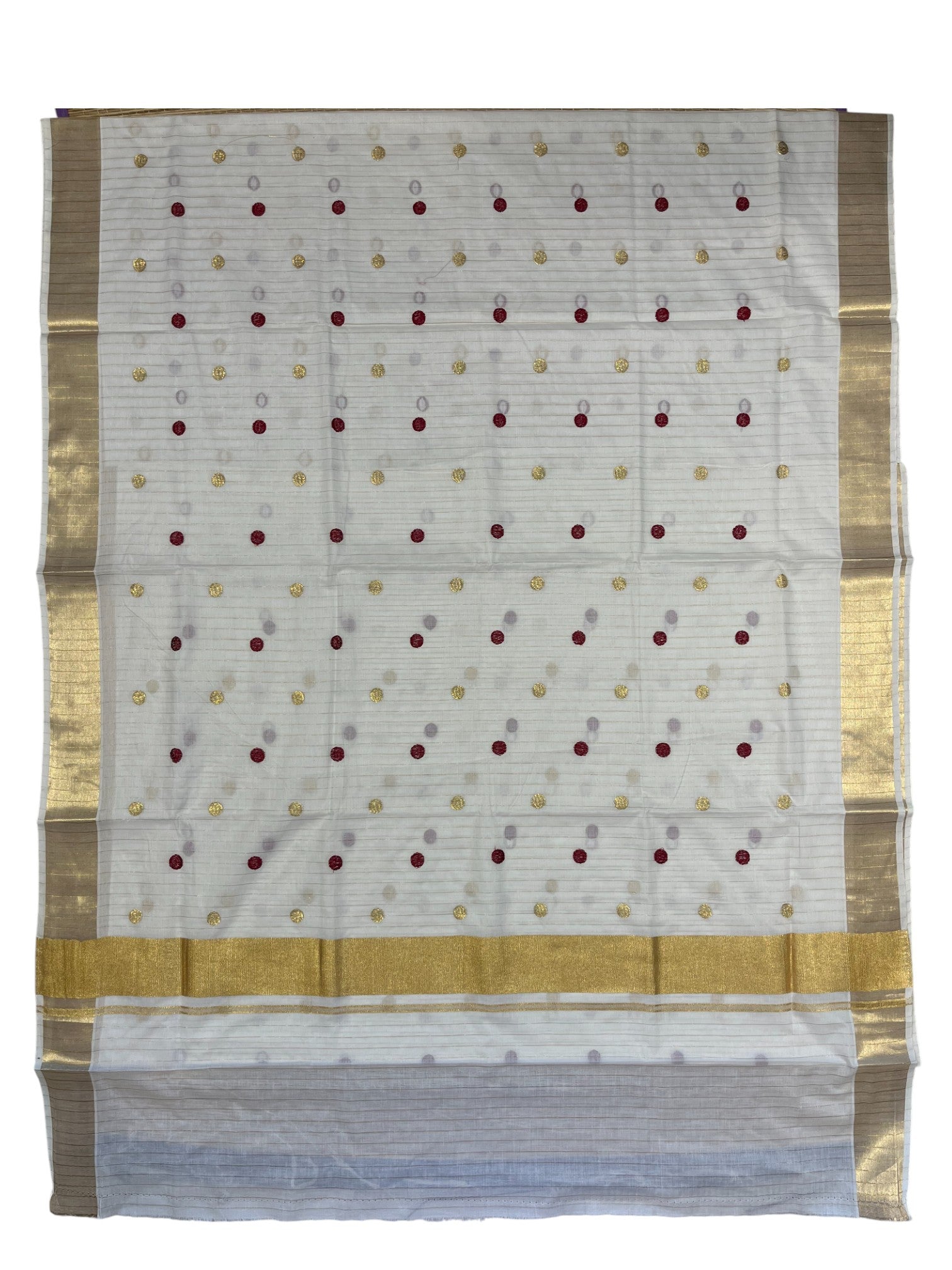 Southloom Kerala Pure Cotton Saree with Gold&Maroon Polka Embroidery Works on Body