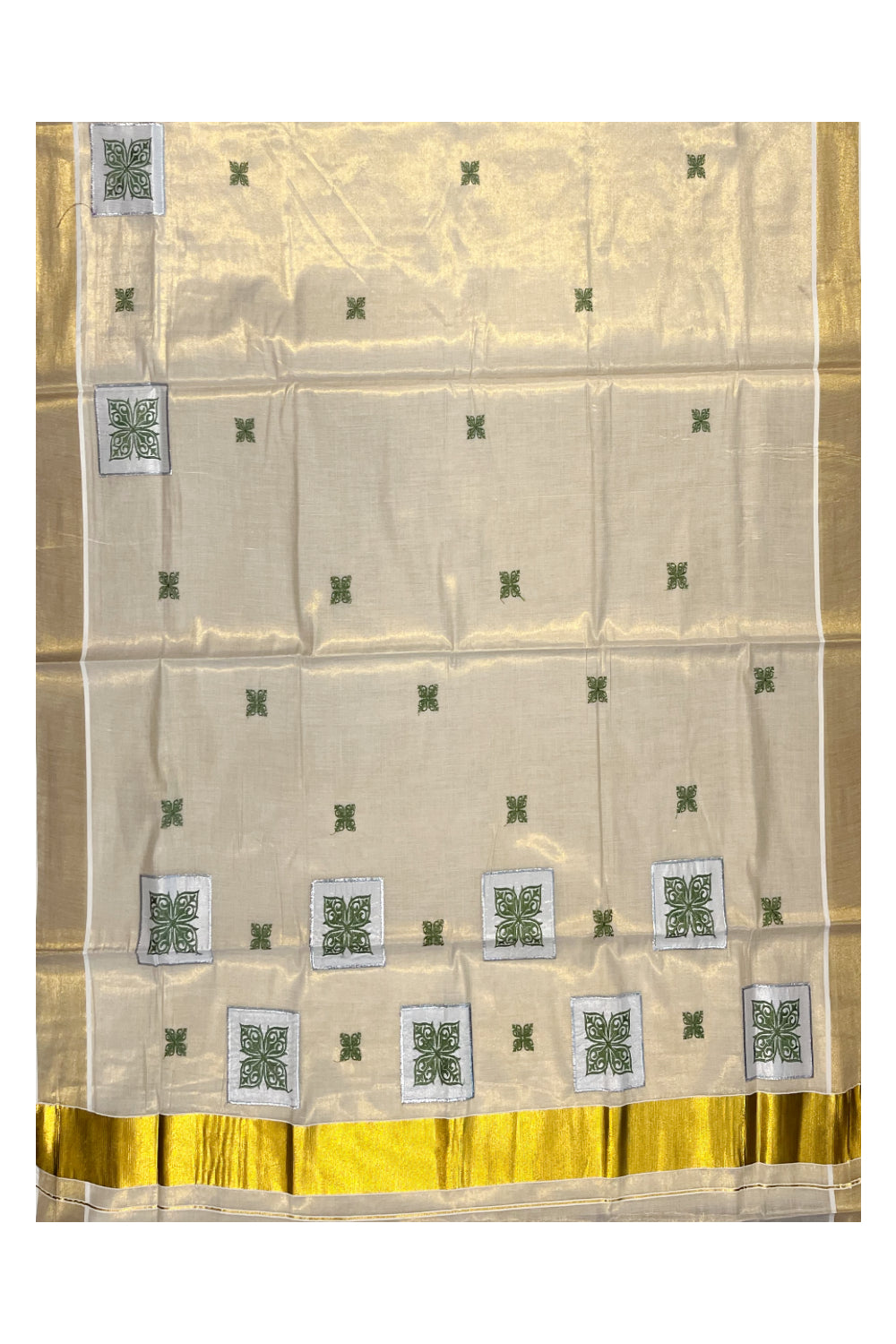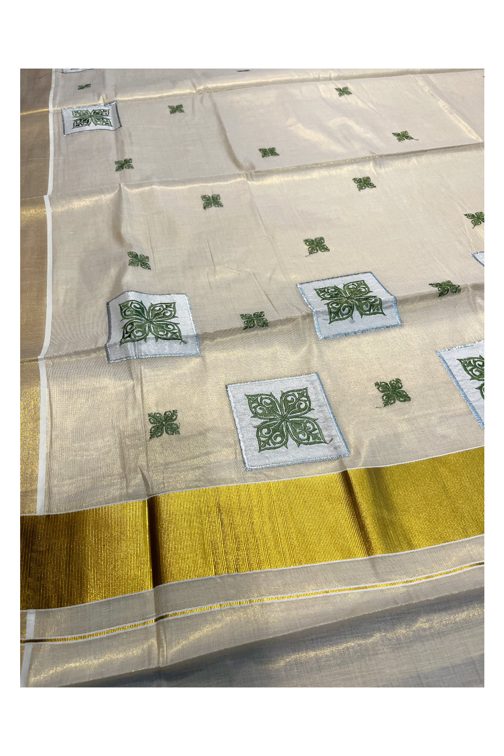 Southloom Kerala Tissue Kasavu Saree with Green Appliq Work
