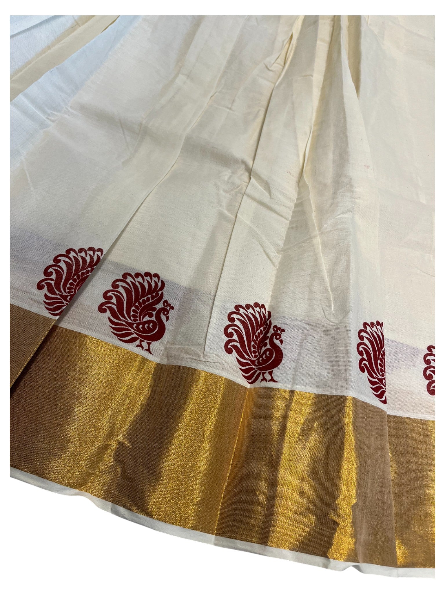 Southloom Kerala Cotton Kasavu Pavada Blouse with Hand Printed Work for Kids