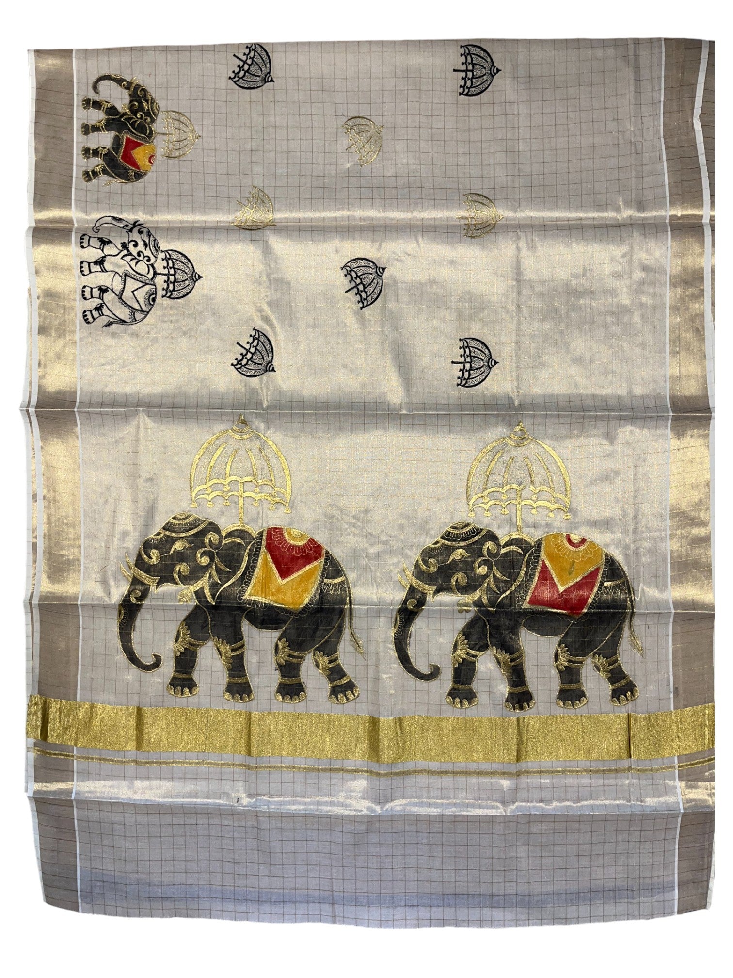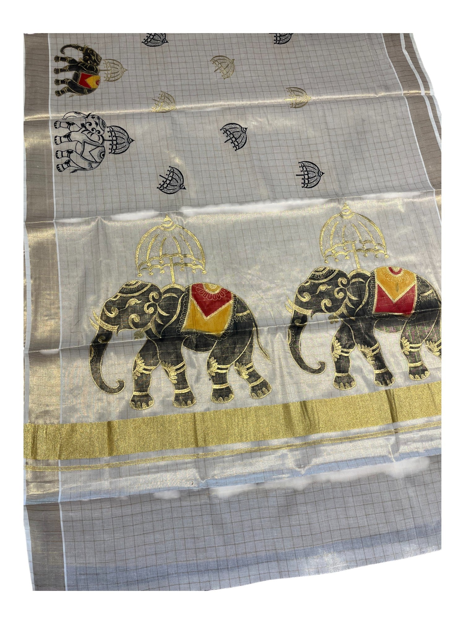 Southloom Kerala Tissue Kasavu Cheack Saree with Embroidery Wor in Elephant Print