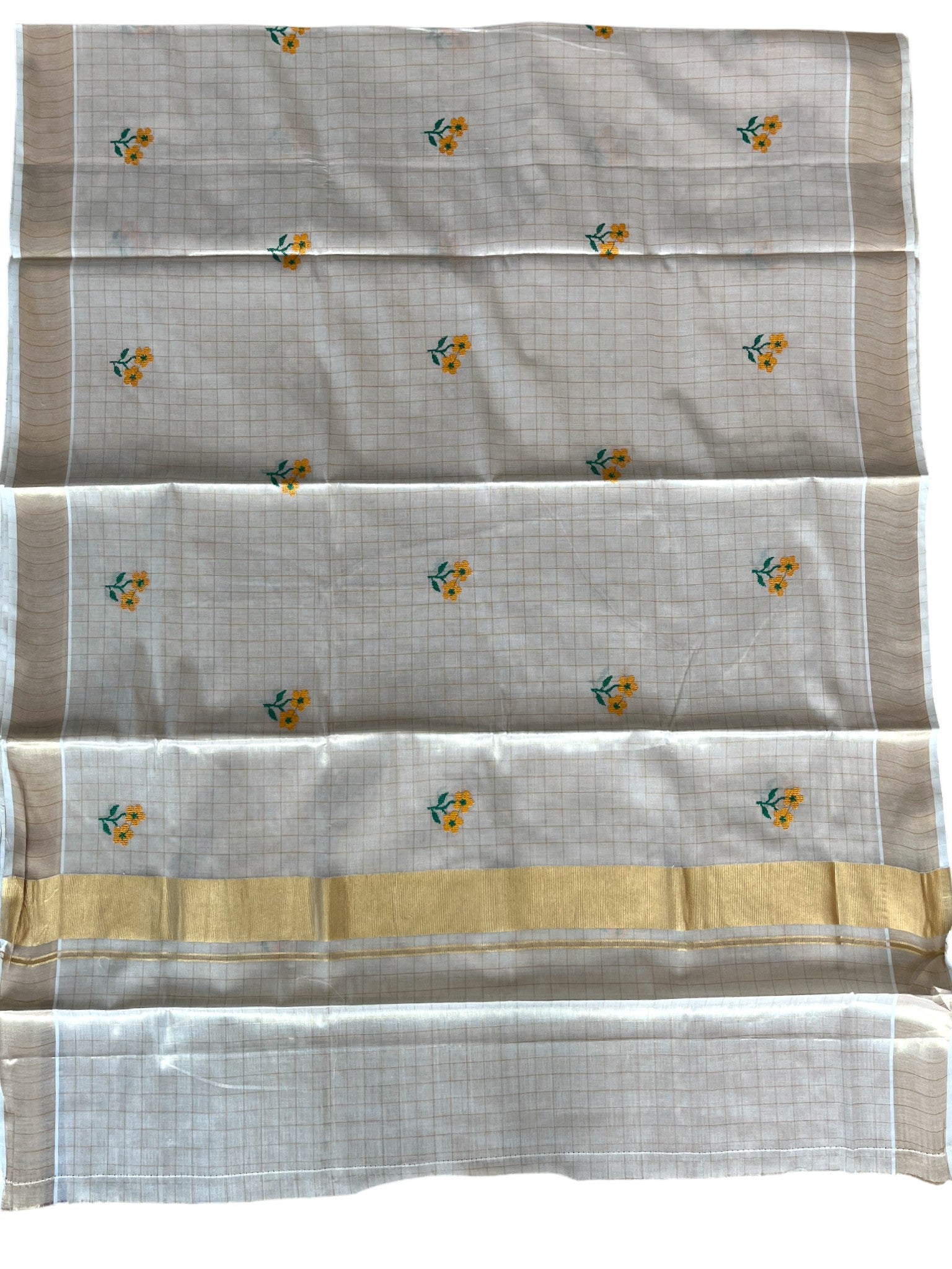 Southloom Kerala Tissue Kasavu Check Saree With Floral Embroidery Work
