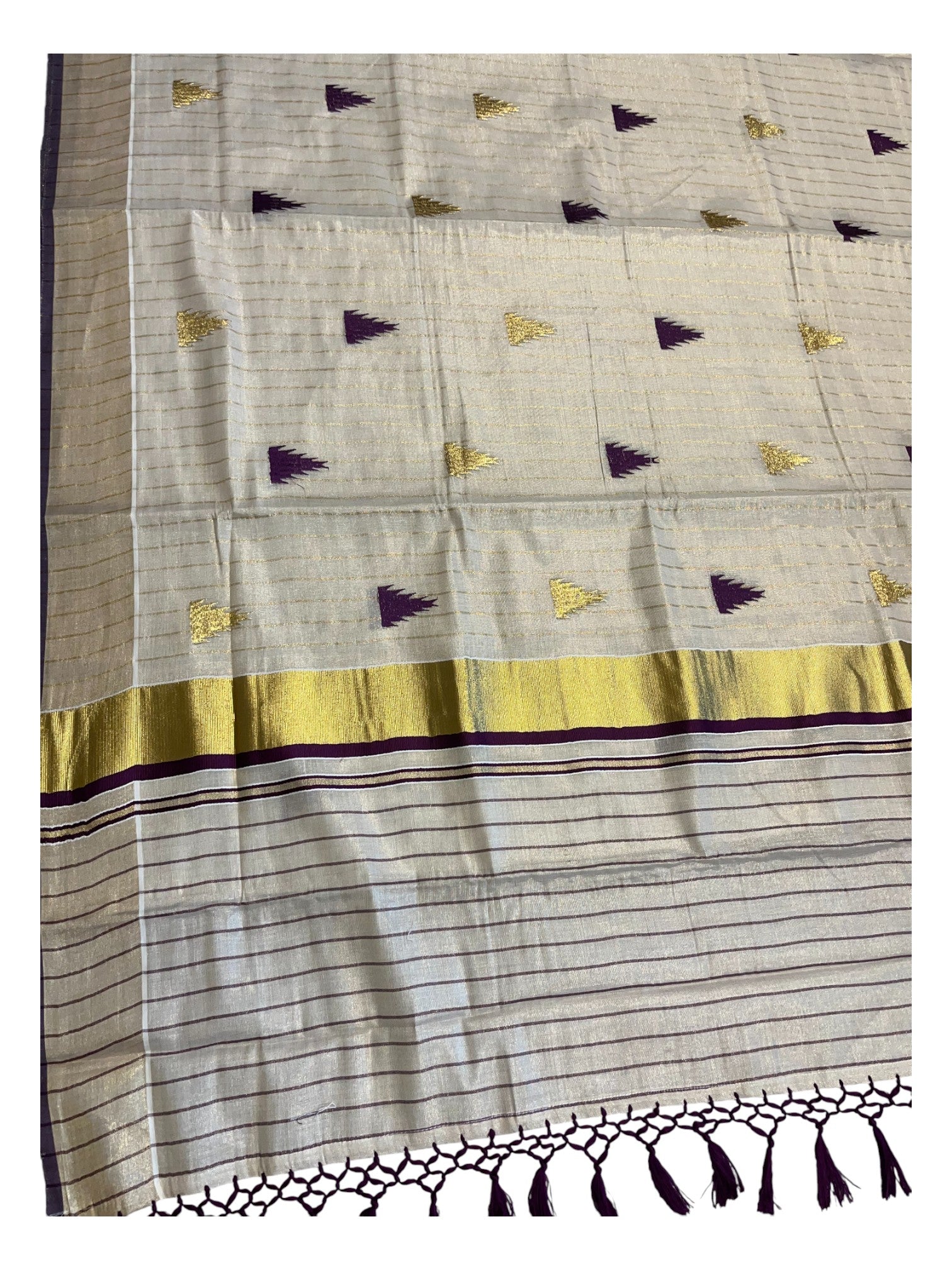 Southloom Kerala Tissue Kasavu Line Saree with Purple Temple Embroidery Works
