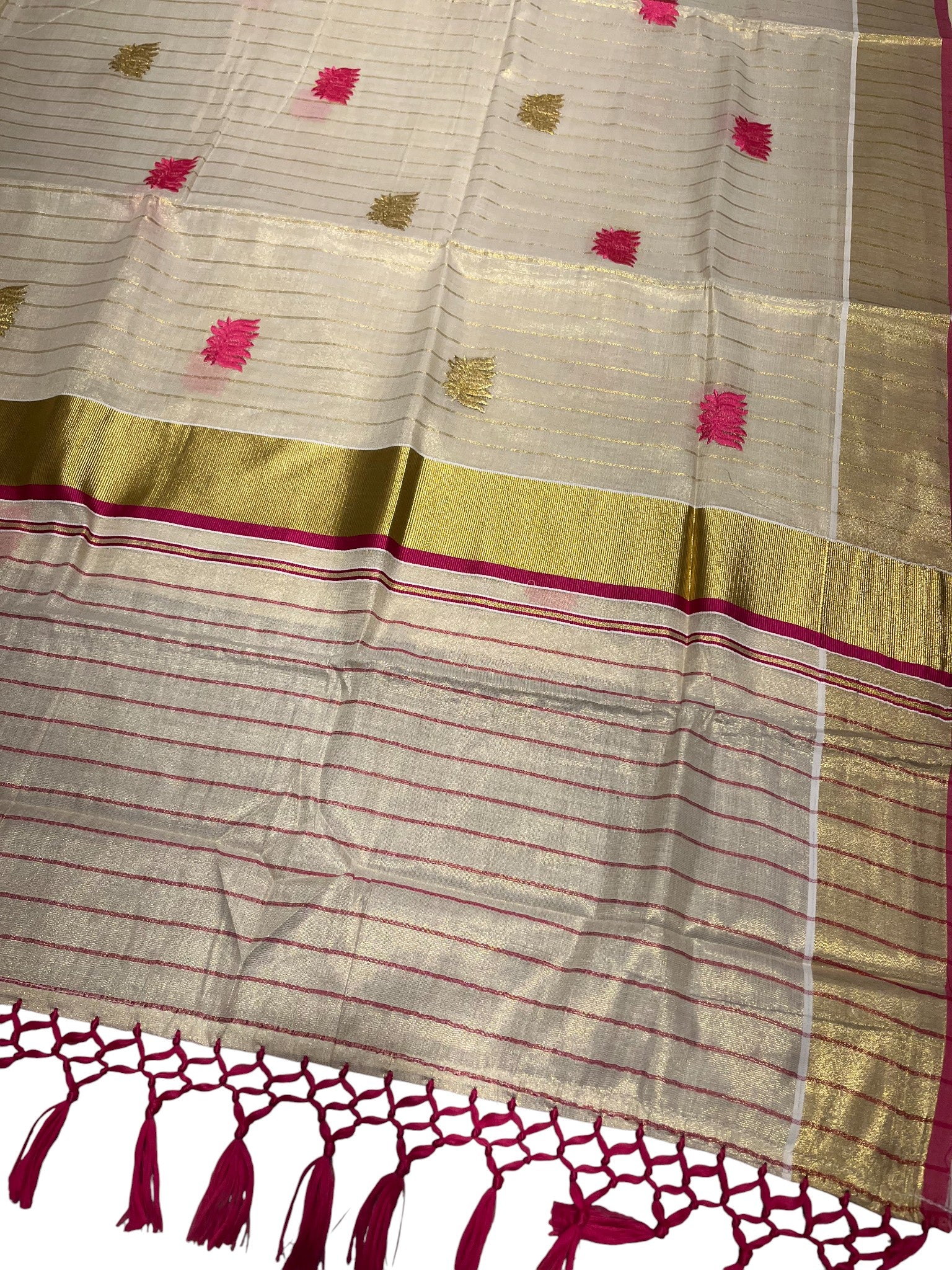 Southloom Kerala Tissue Kasavu Line Saree with Pink Lotus Embroidery Works