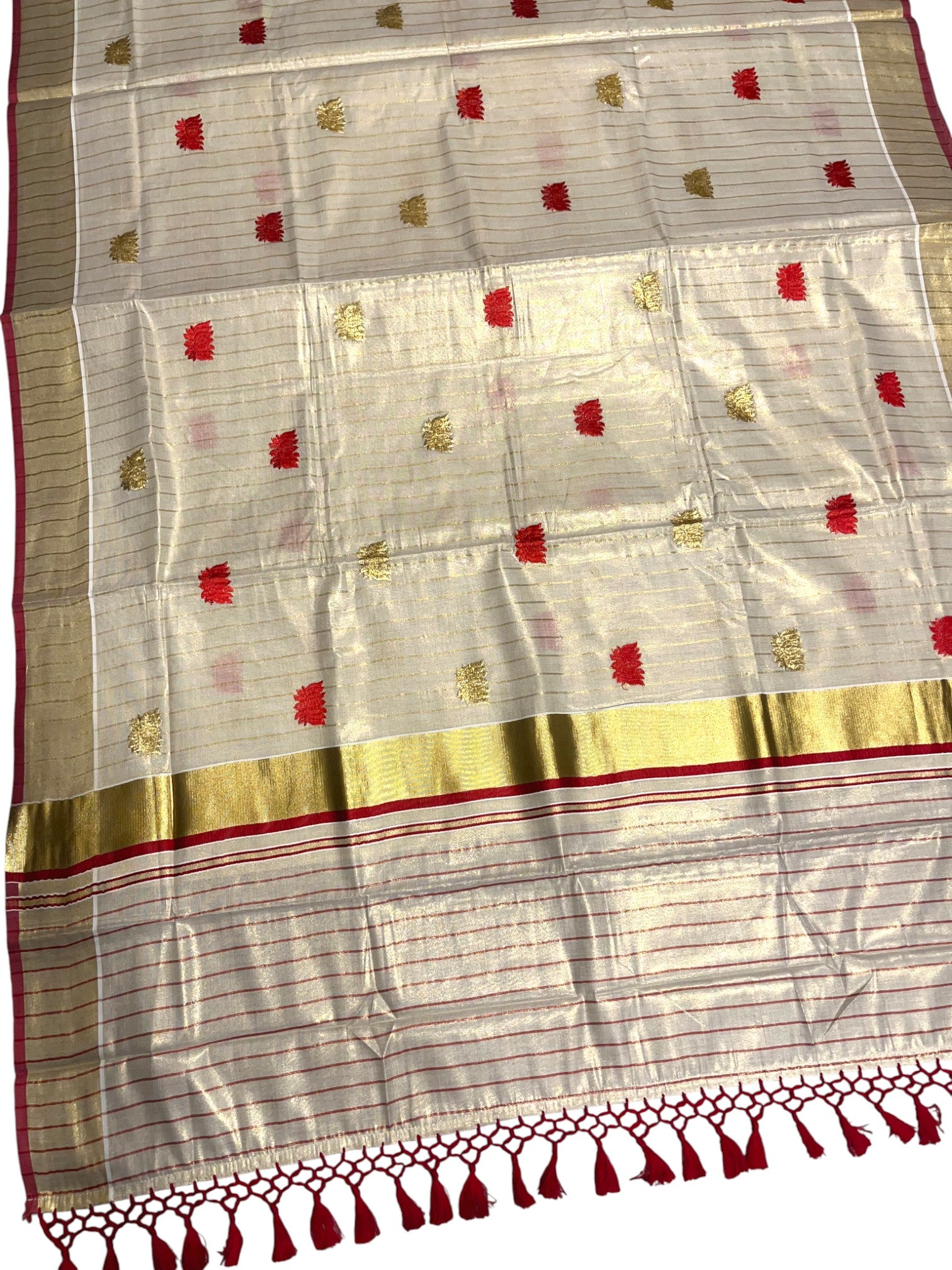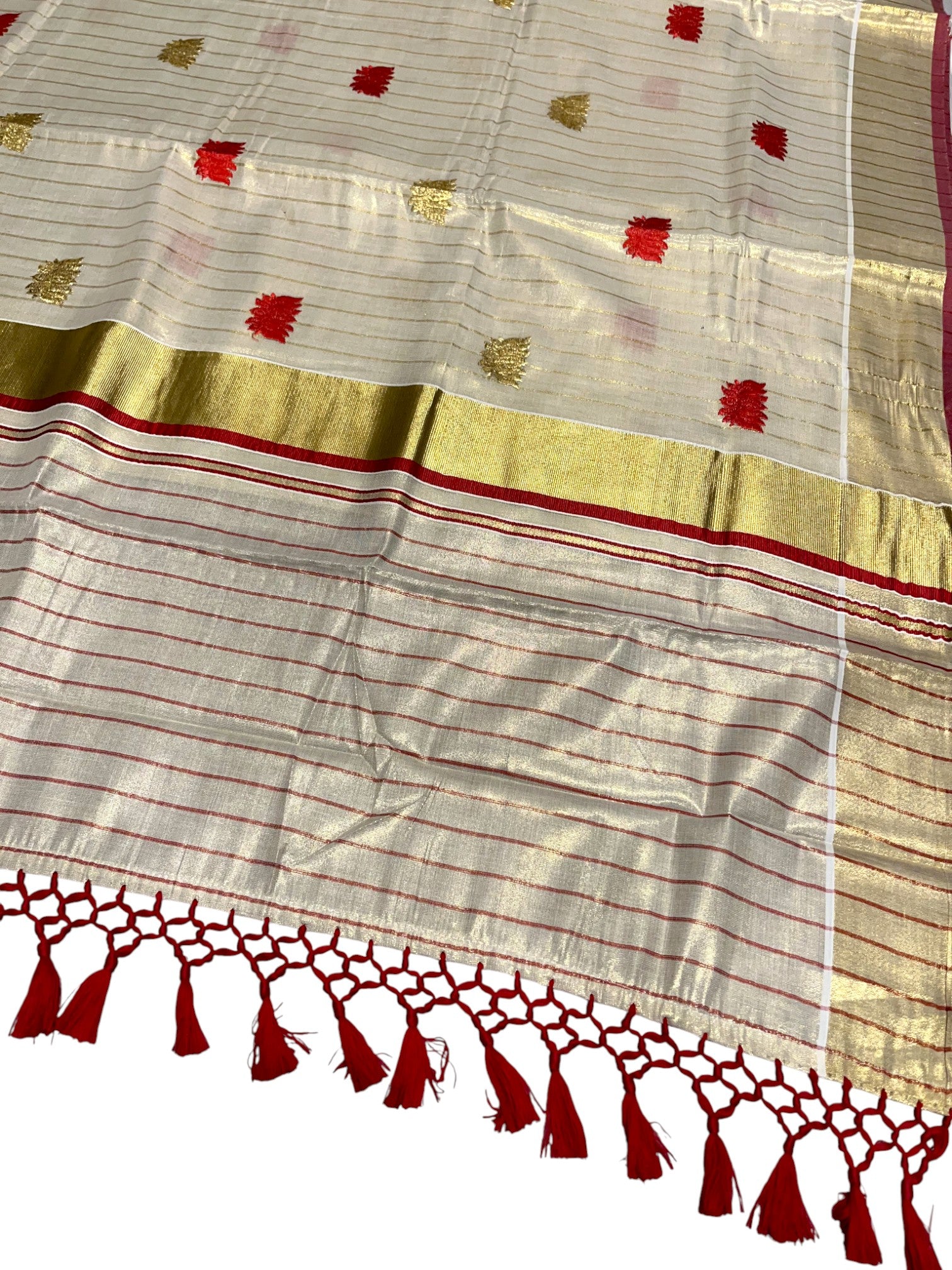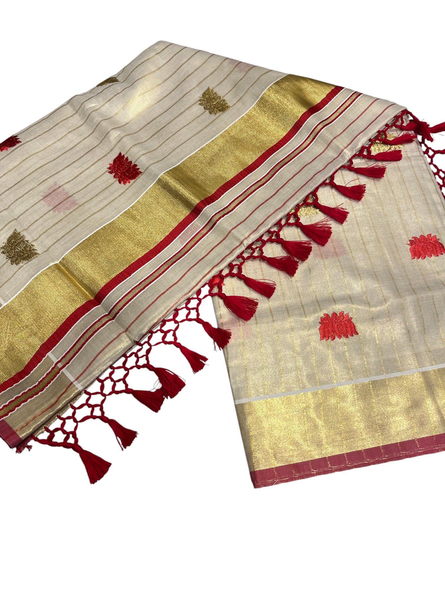 Southloom Kerala Tissue Kasavu Line Saree with Red Lotus Embroidery Works