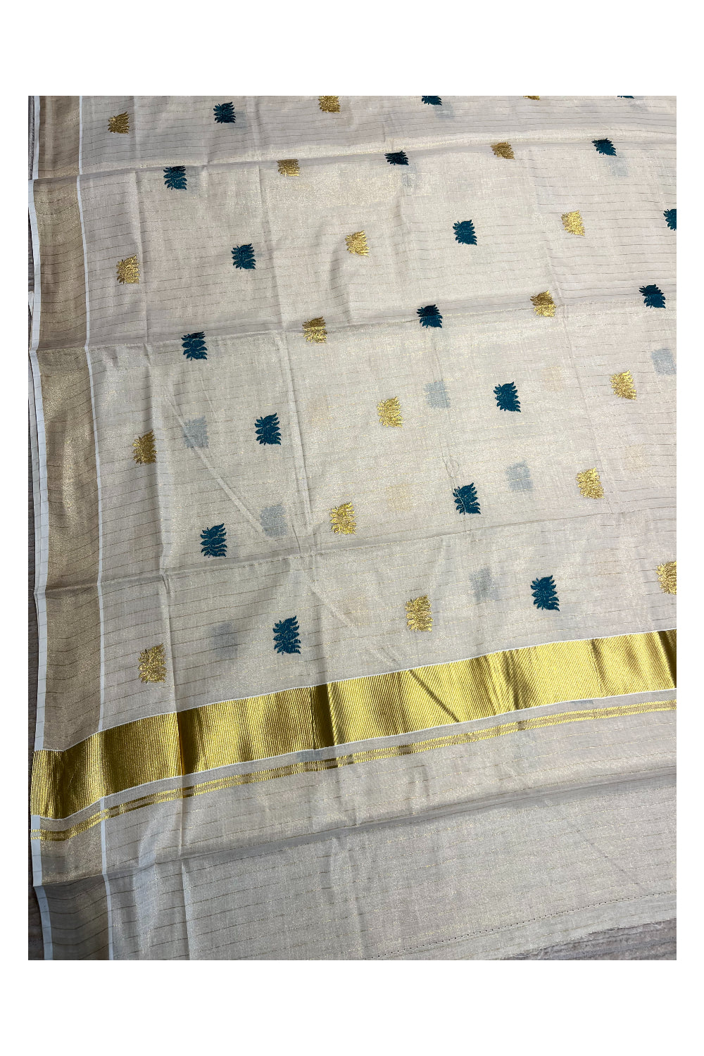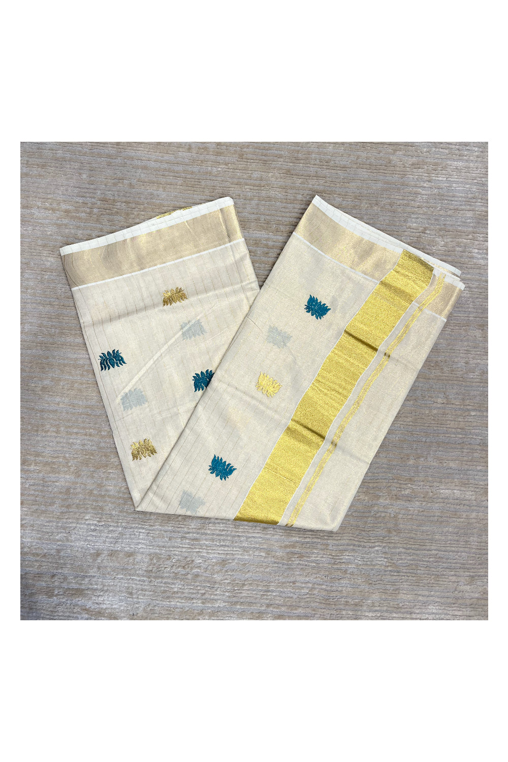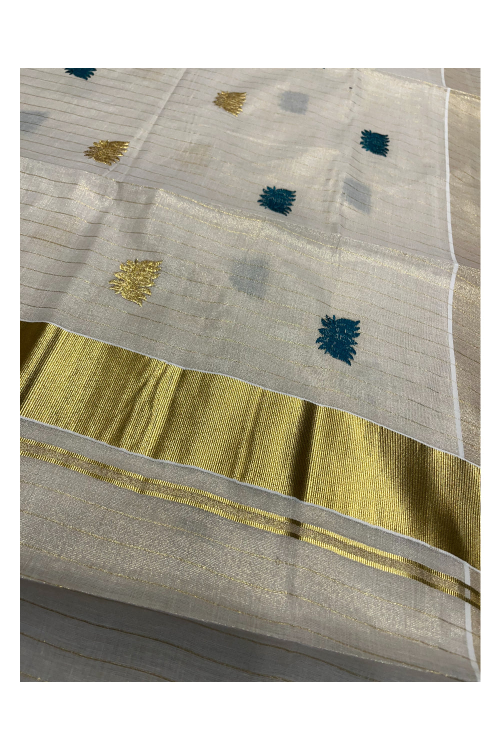 Southloom Kerala Tissue Kasavu Lines Saree with Peacock Green Lotus Embroidery Works
