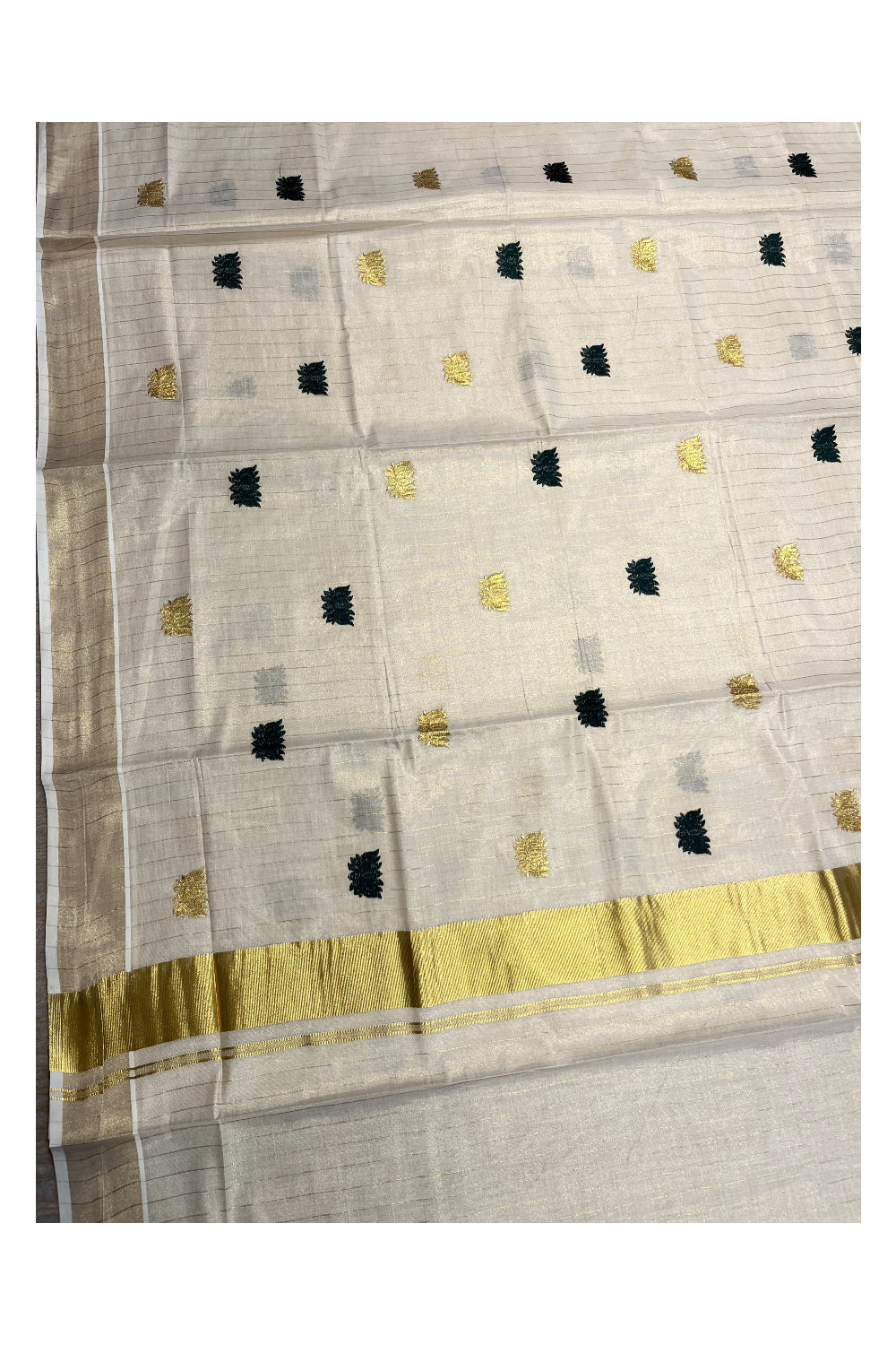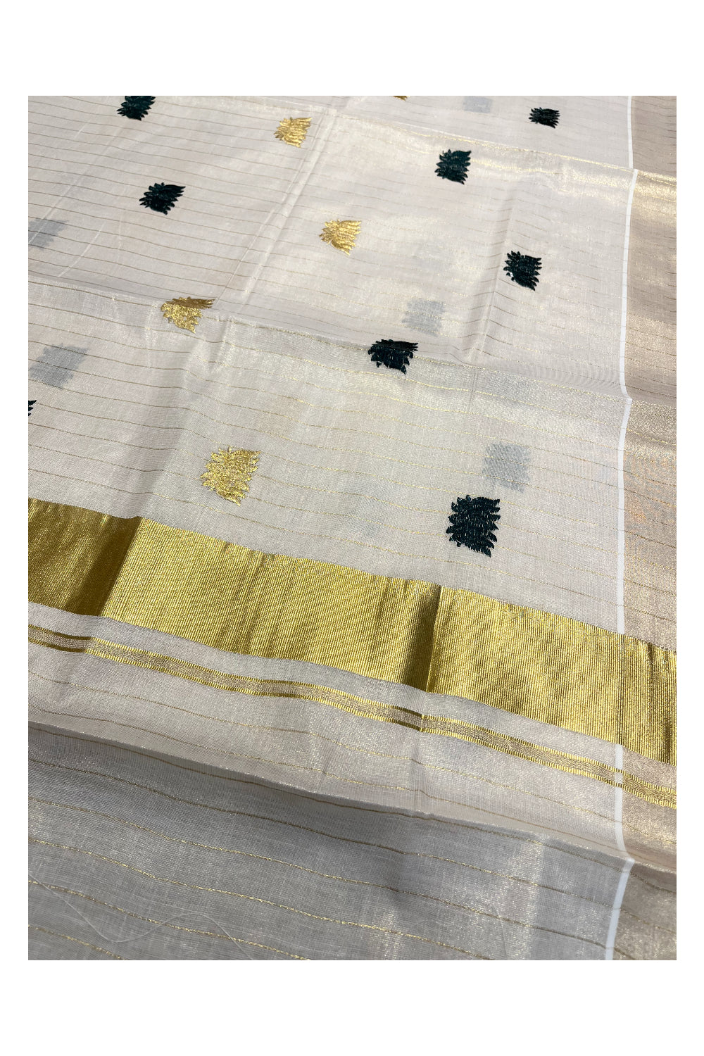 Southloom Kerala Tissue Kasavu Lines Saree with Green Lotus Embroidery Works