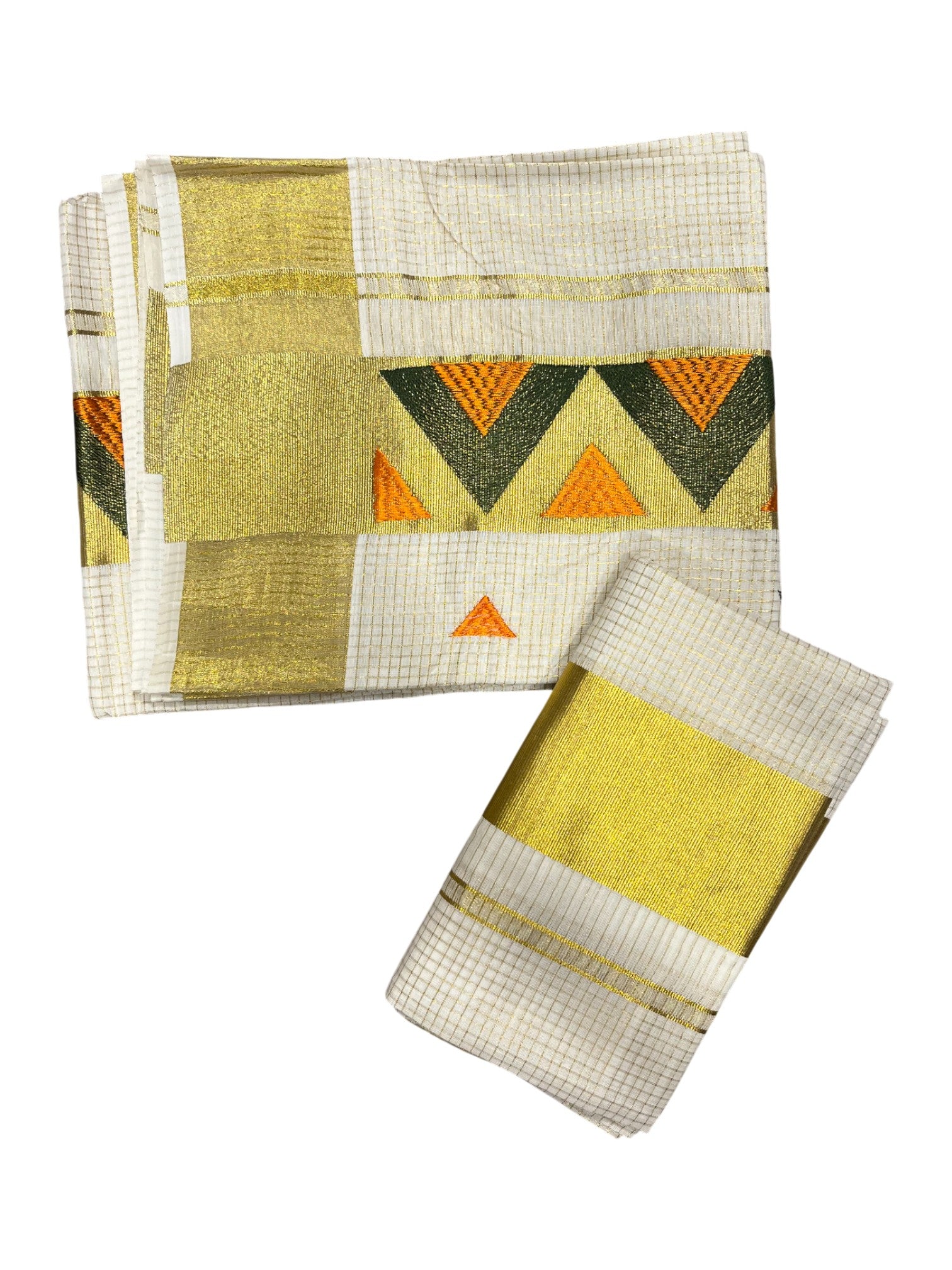 southloom Kerala TIssue Kasavu Mundum Neriyathum (Set Mundu) with Green Orange Embroidery Designs in Kasavu Border