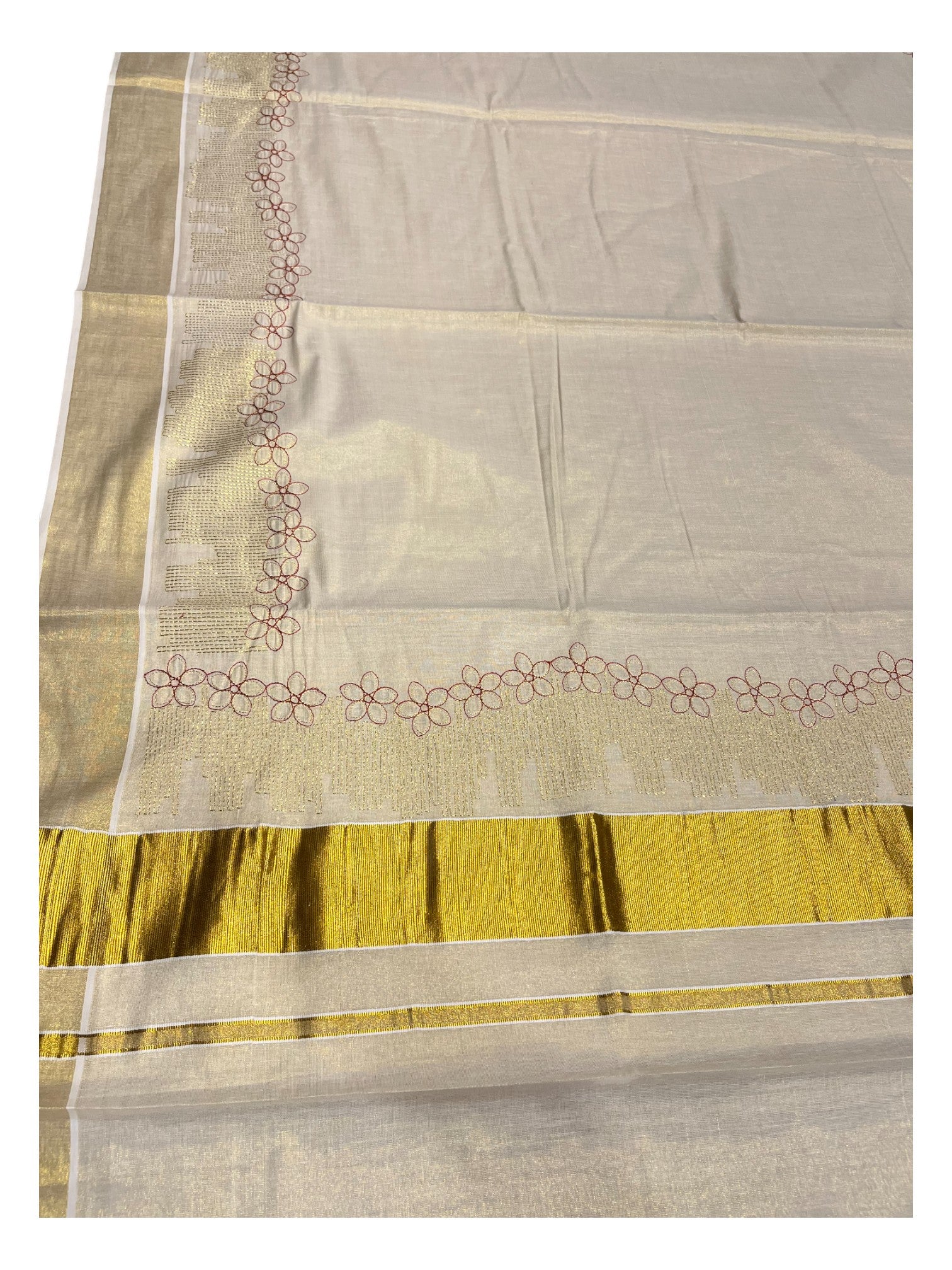 Tissue Kerala Saree with Embroidery Designs on Body. Simple saree for everyday wear, may it be to the office or to the temple.