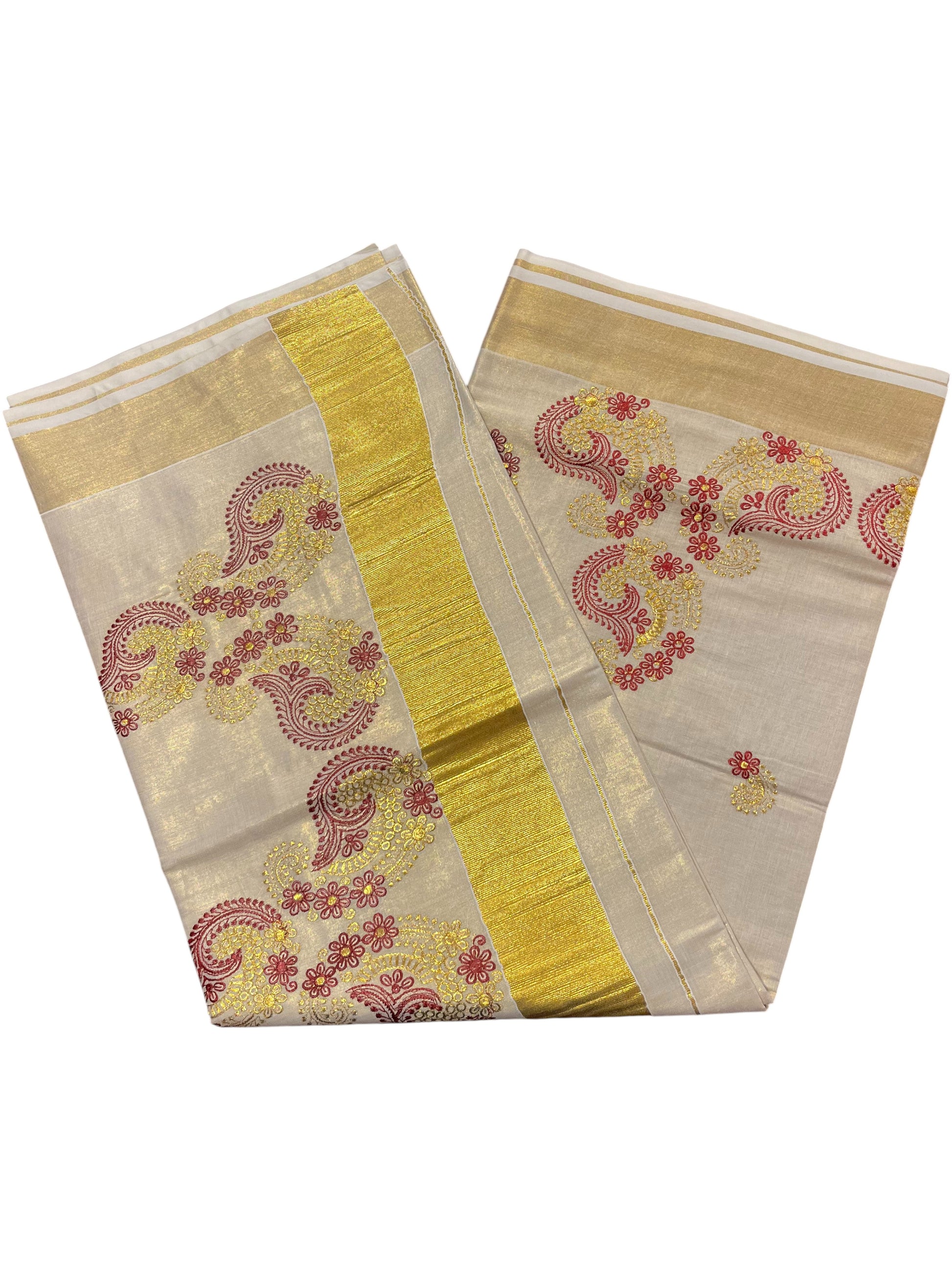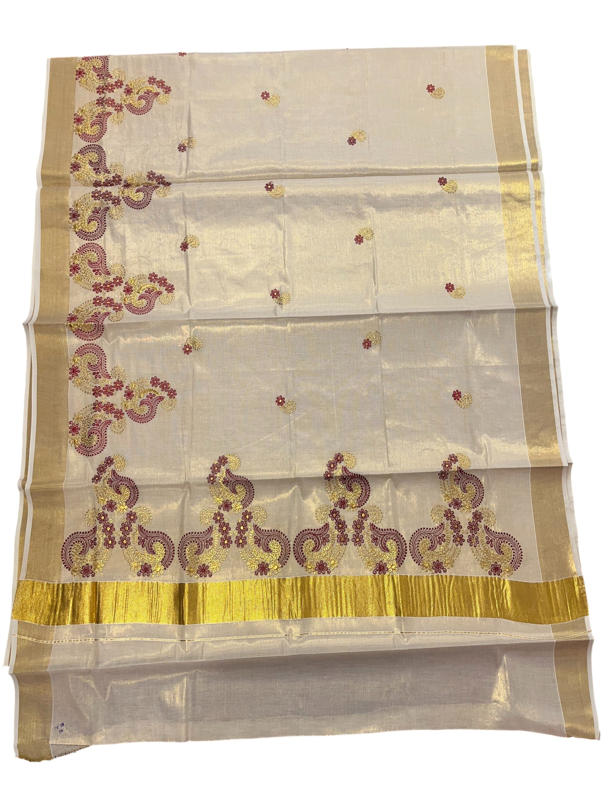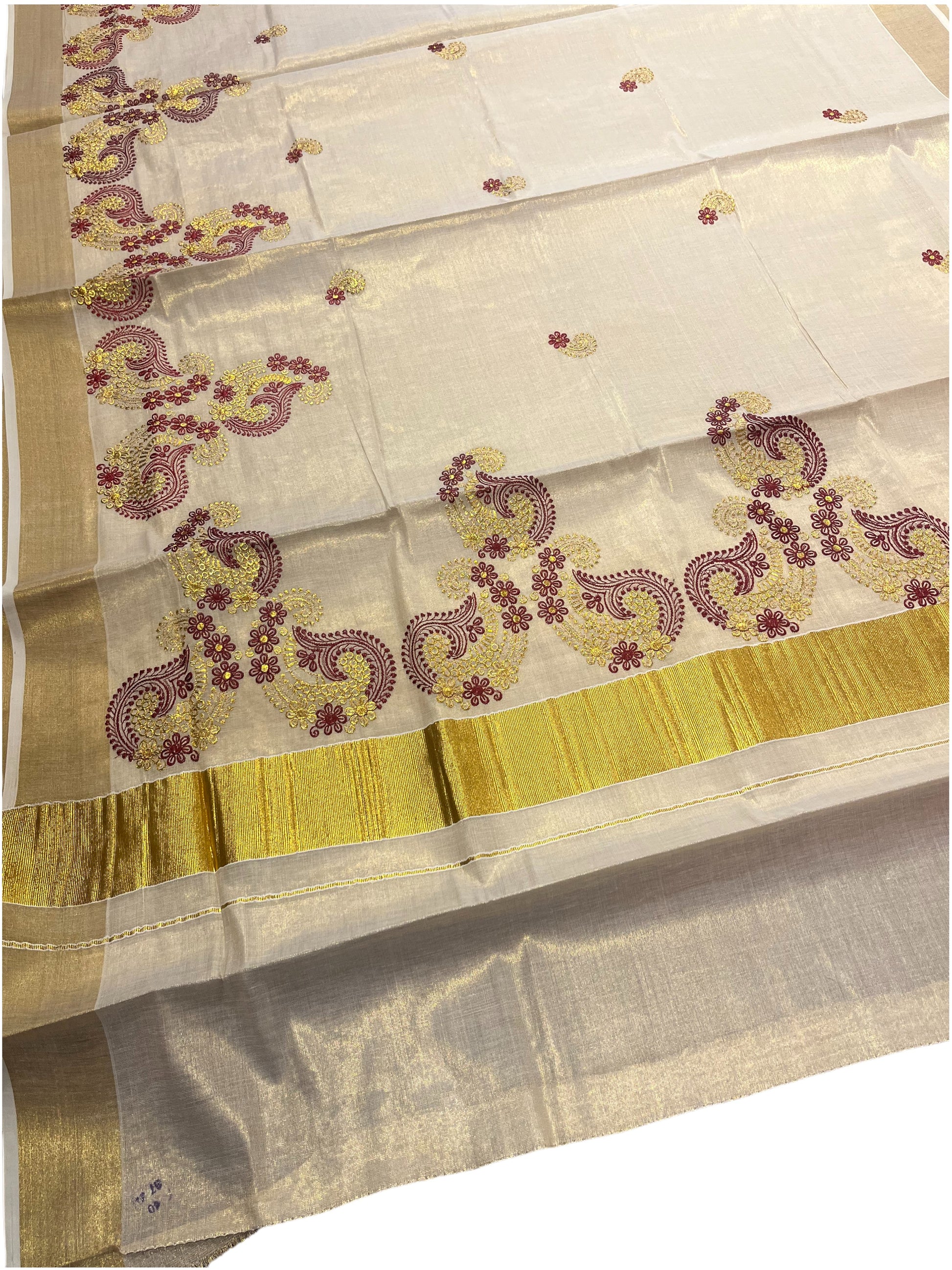 Tissue Kerala Saree with Embroidery Designs on Body. Simple saree for everyday wear, may it be to the office or to the temple.