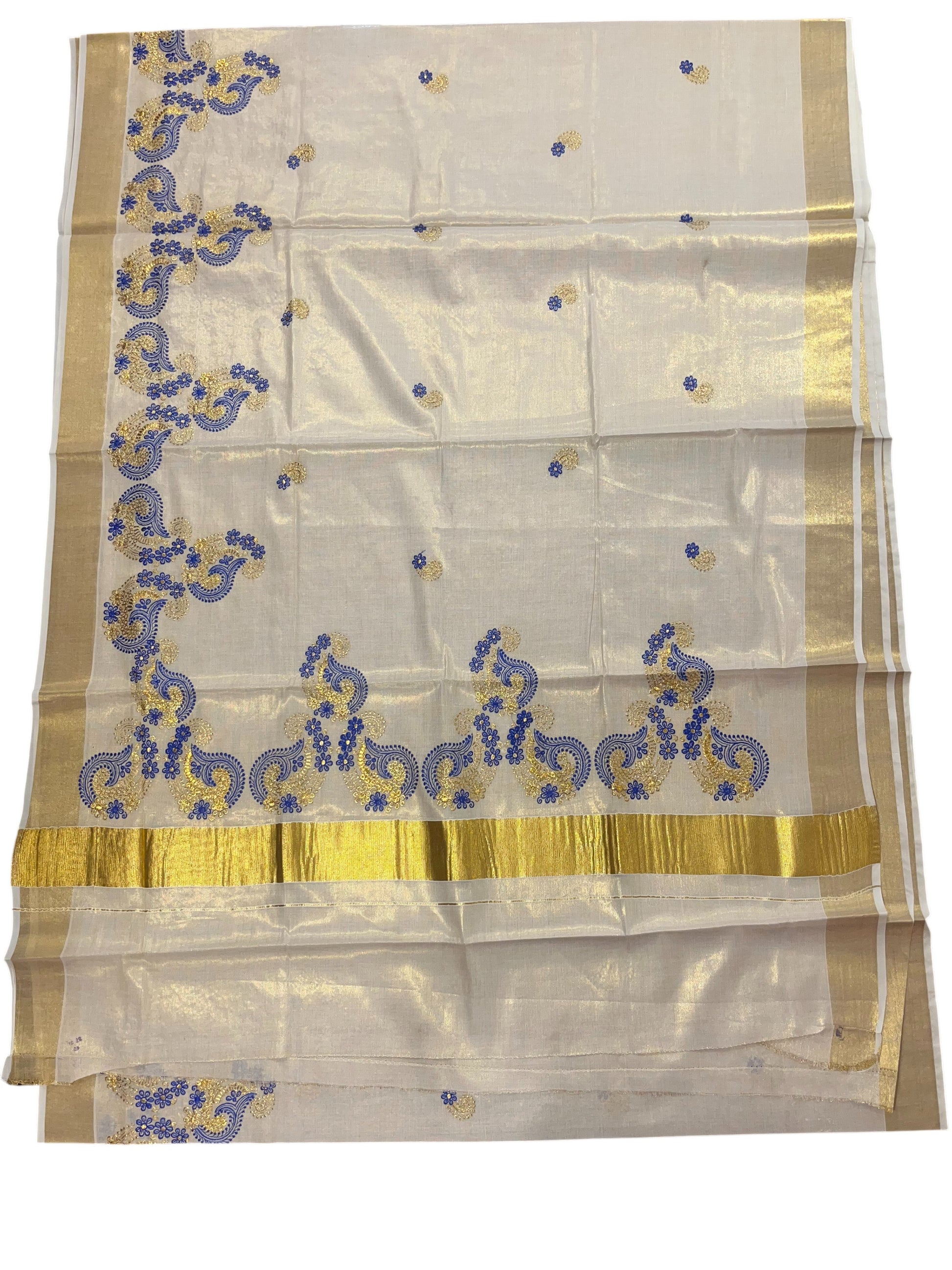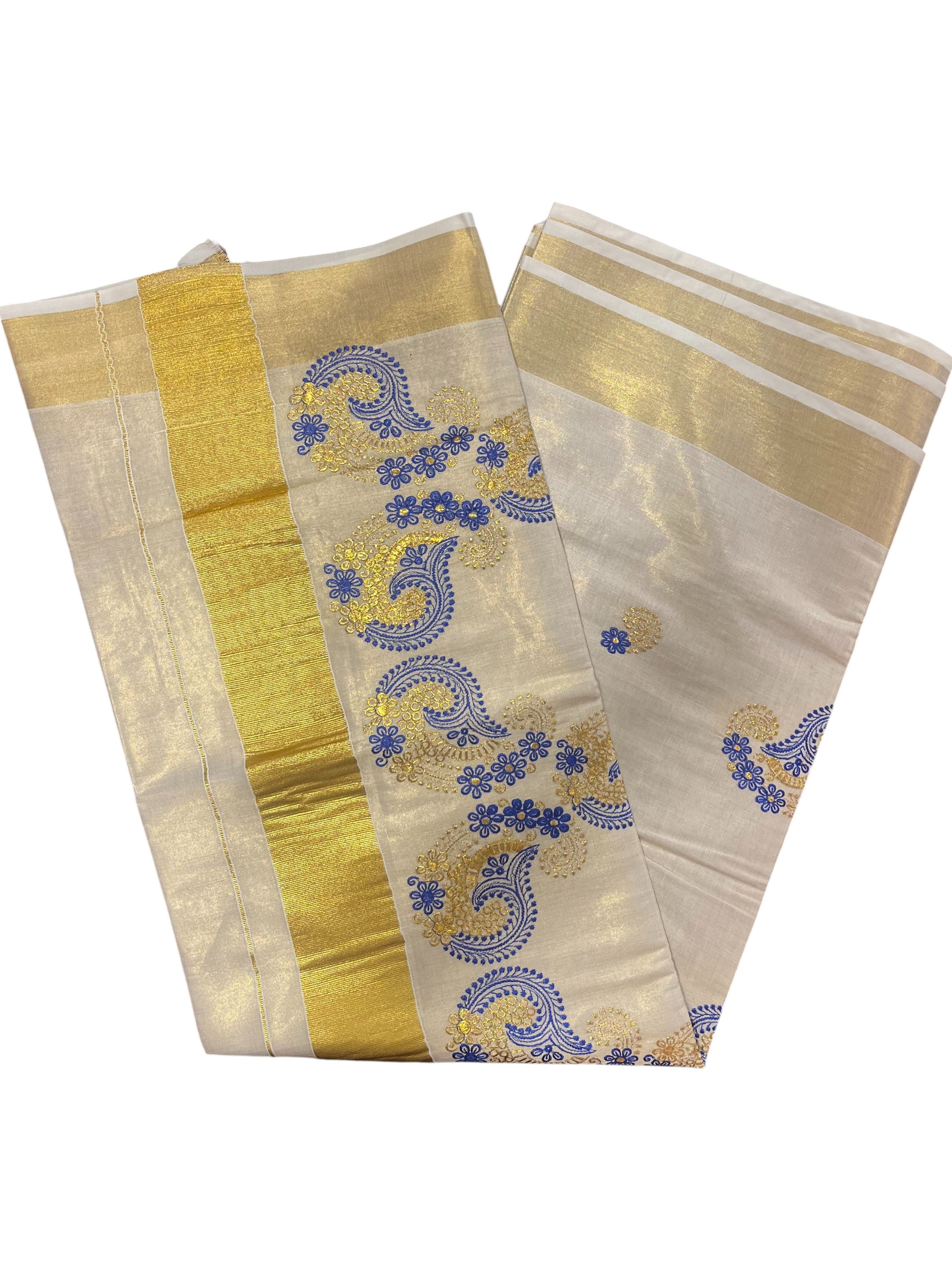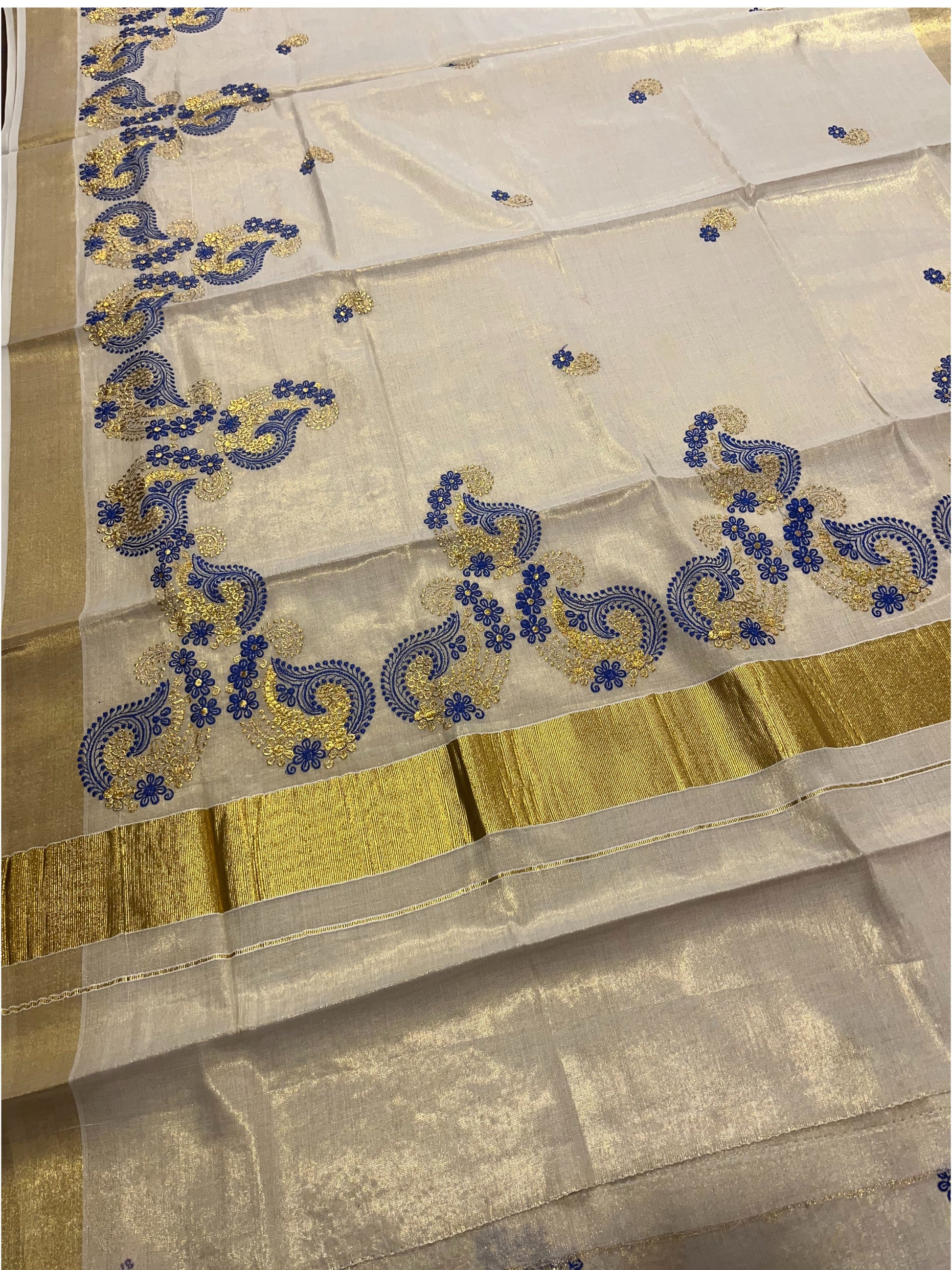 Southloom Kerala Tissue Kasavu Plain Saree with Gold and Blue Embroidery Works
