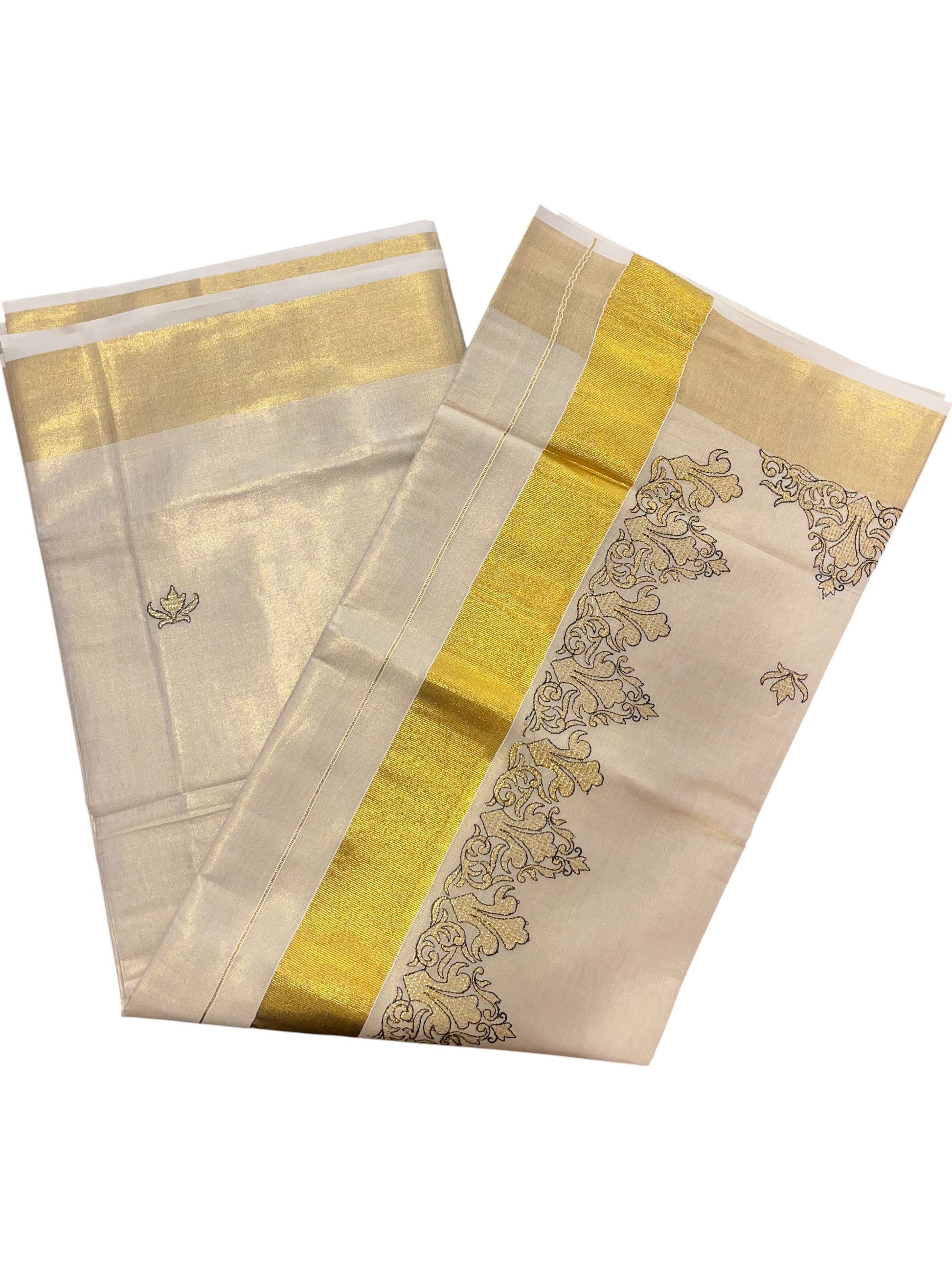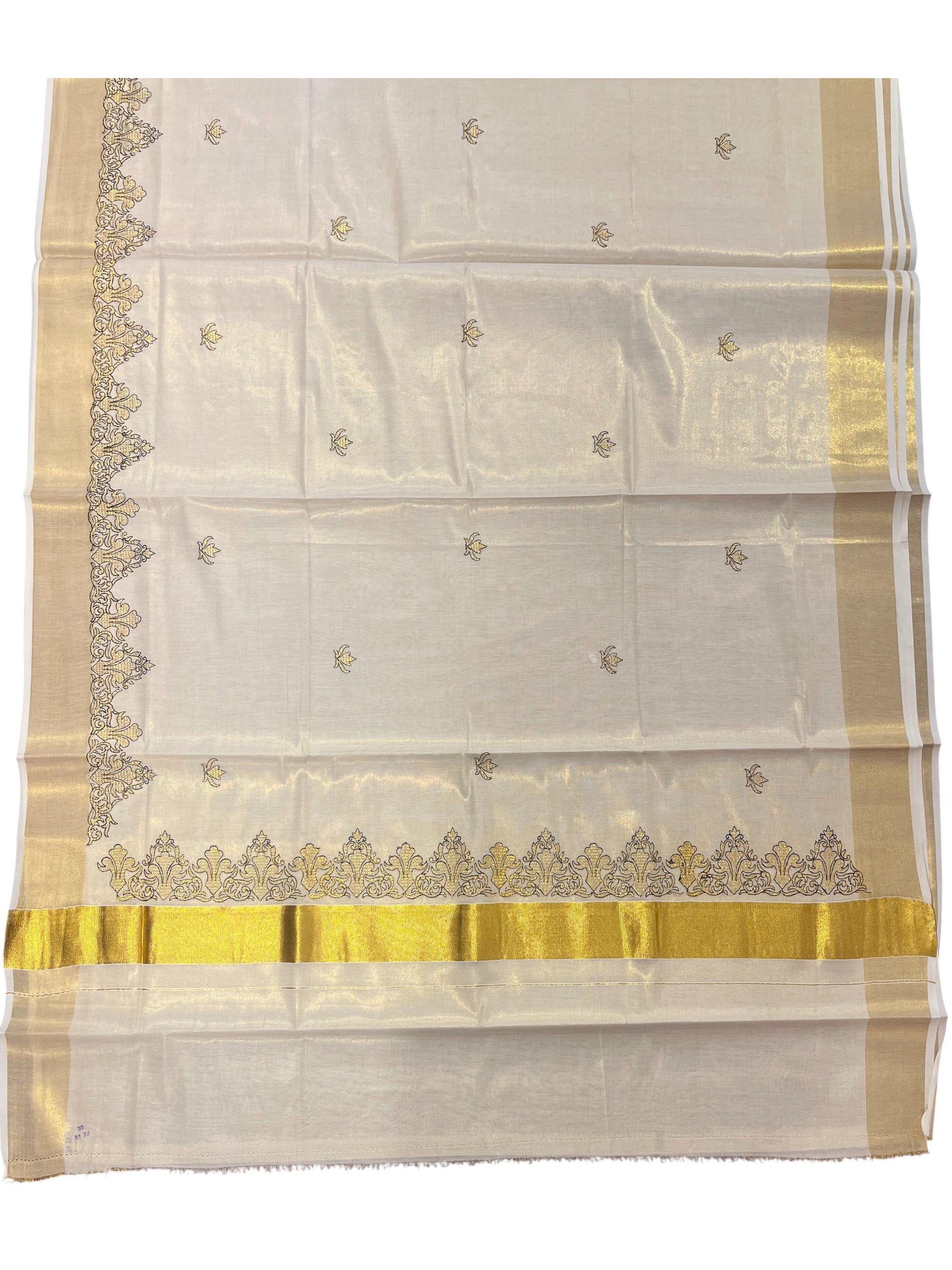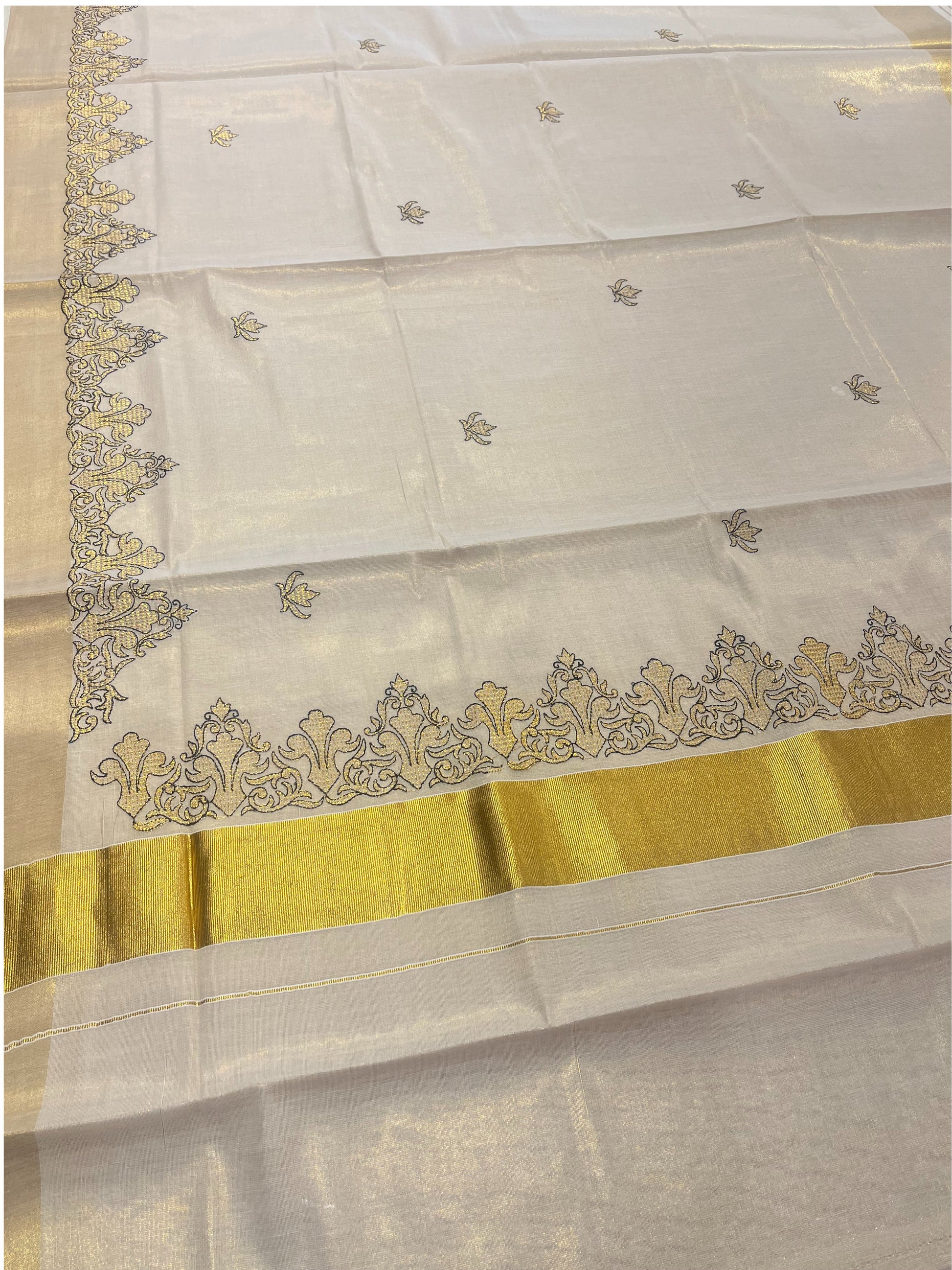 Tissue Kerala Saree with Embroidery Designs on Body. Simple saree for everyday wear, may it be to the office or to the temple.