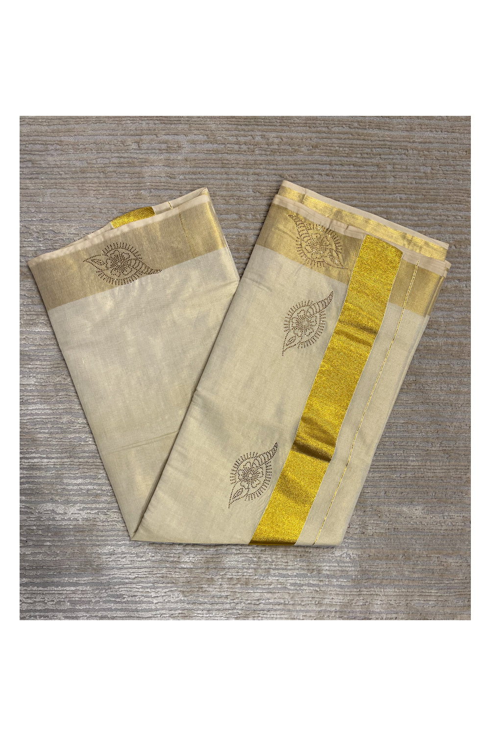 Tissue Kerala Saree with Embroidery Designs on Body. Simple saree for everyday wear, may it be to the office or to the temple.