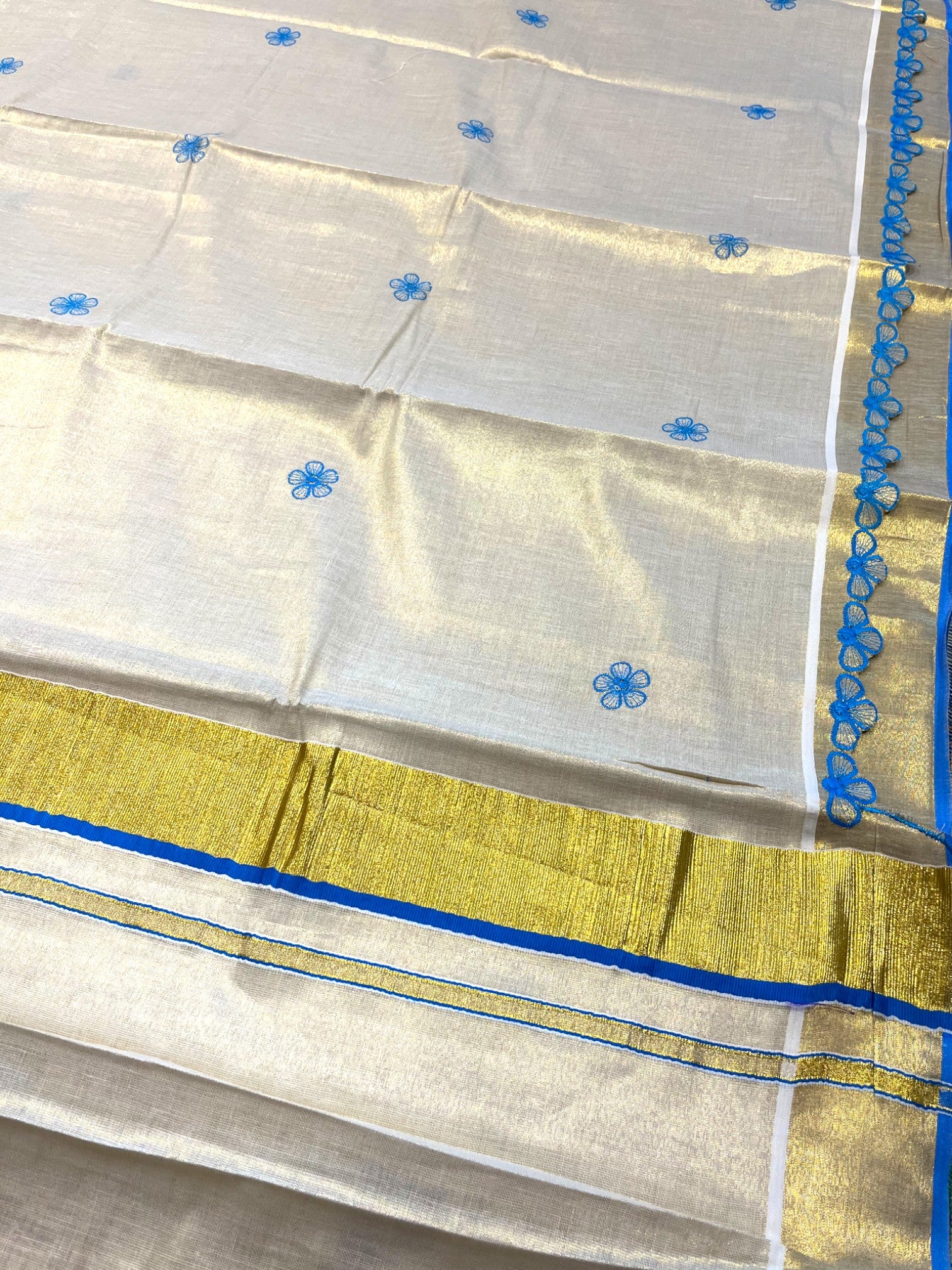 Southloom Kerala Tissue Kasavu Saree with Blue Floral Embroidery on Body and Border