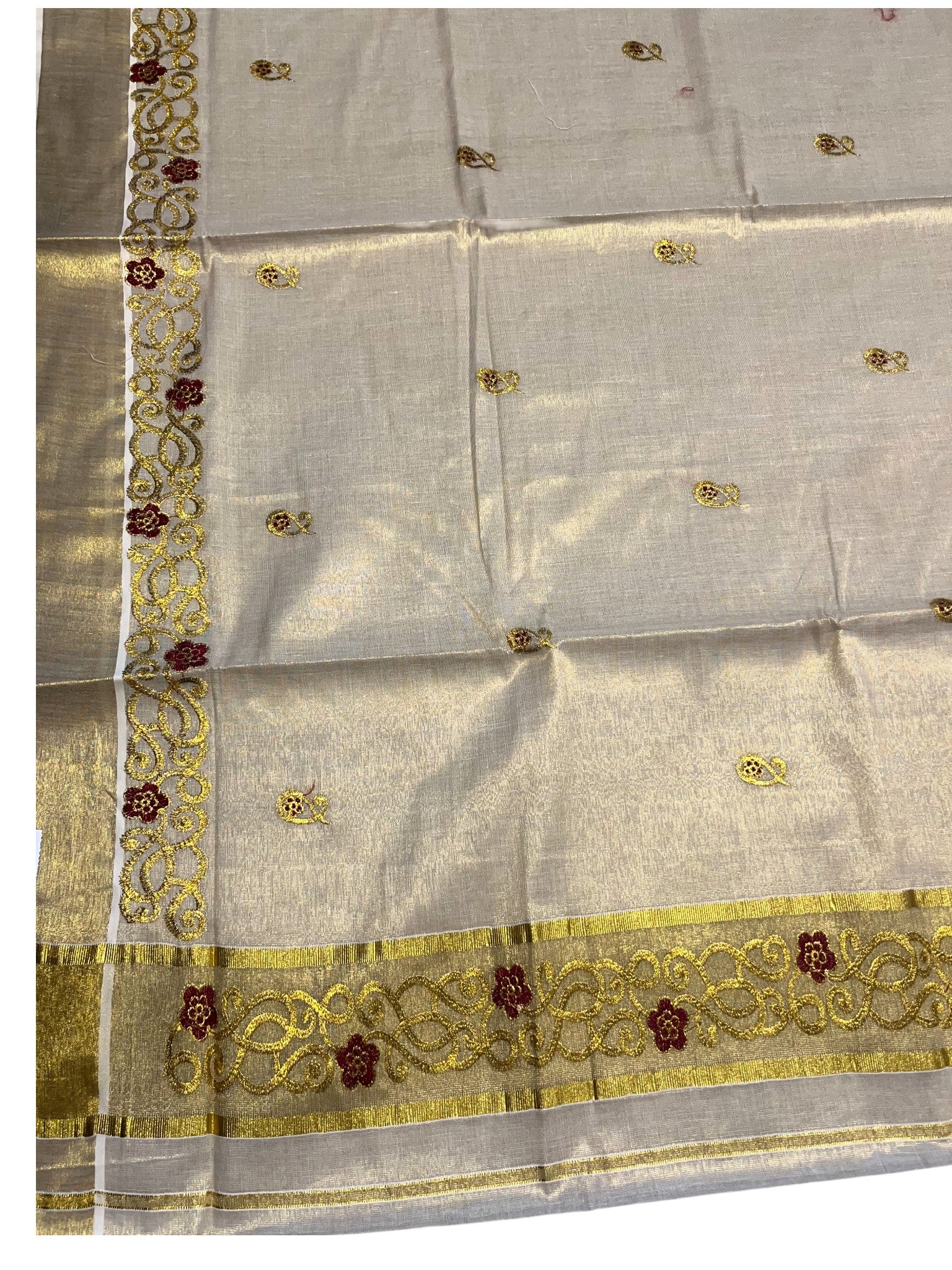 Tissue Kerala Saree with Embroidery Designs on Body. Simple saree for everyday wear, may it be to the office or to the temple.