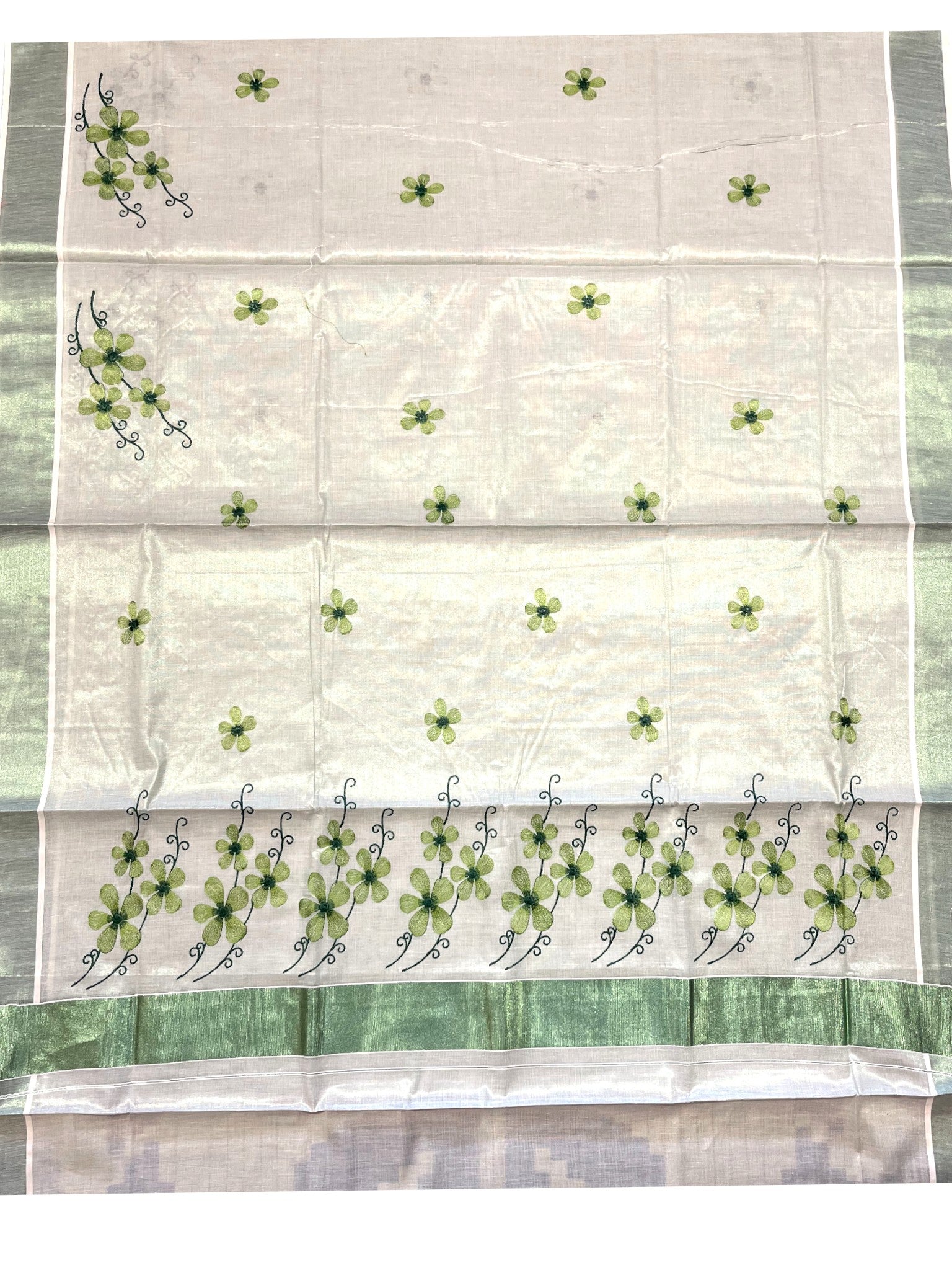 Southloom Kerala Tissue Kasavu Saree with Green Floral Embroidery on Body and Border