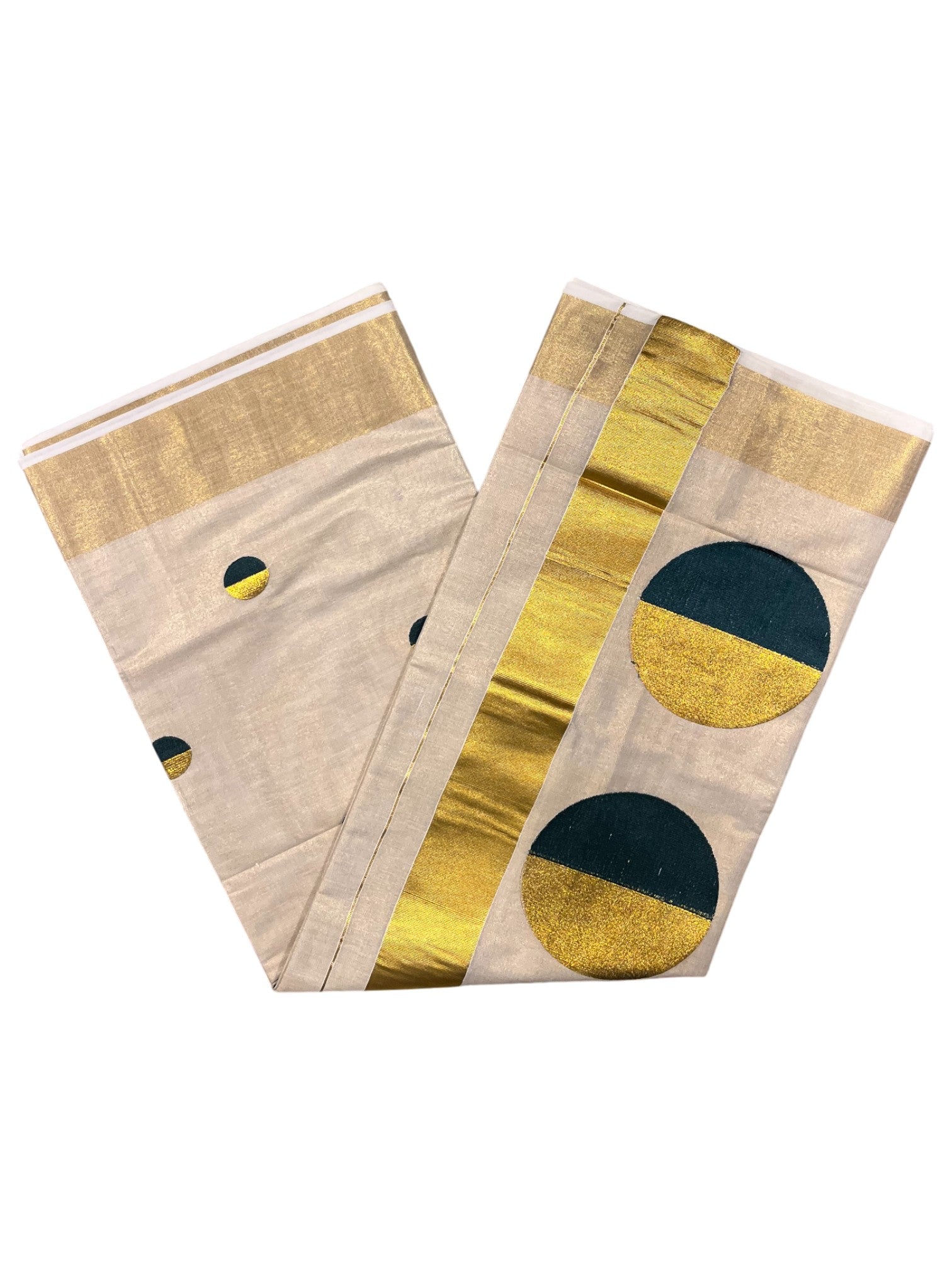 Southloom Kerala Tissue Kasavu Saree With Green Polka Dots Embroidery on Body