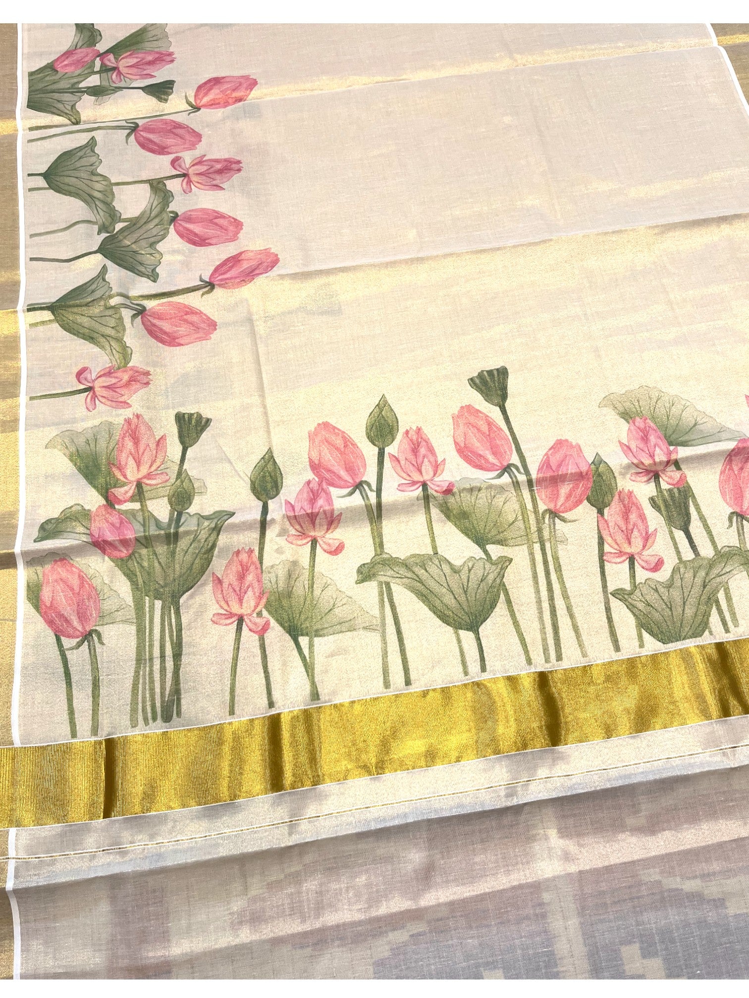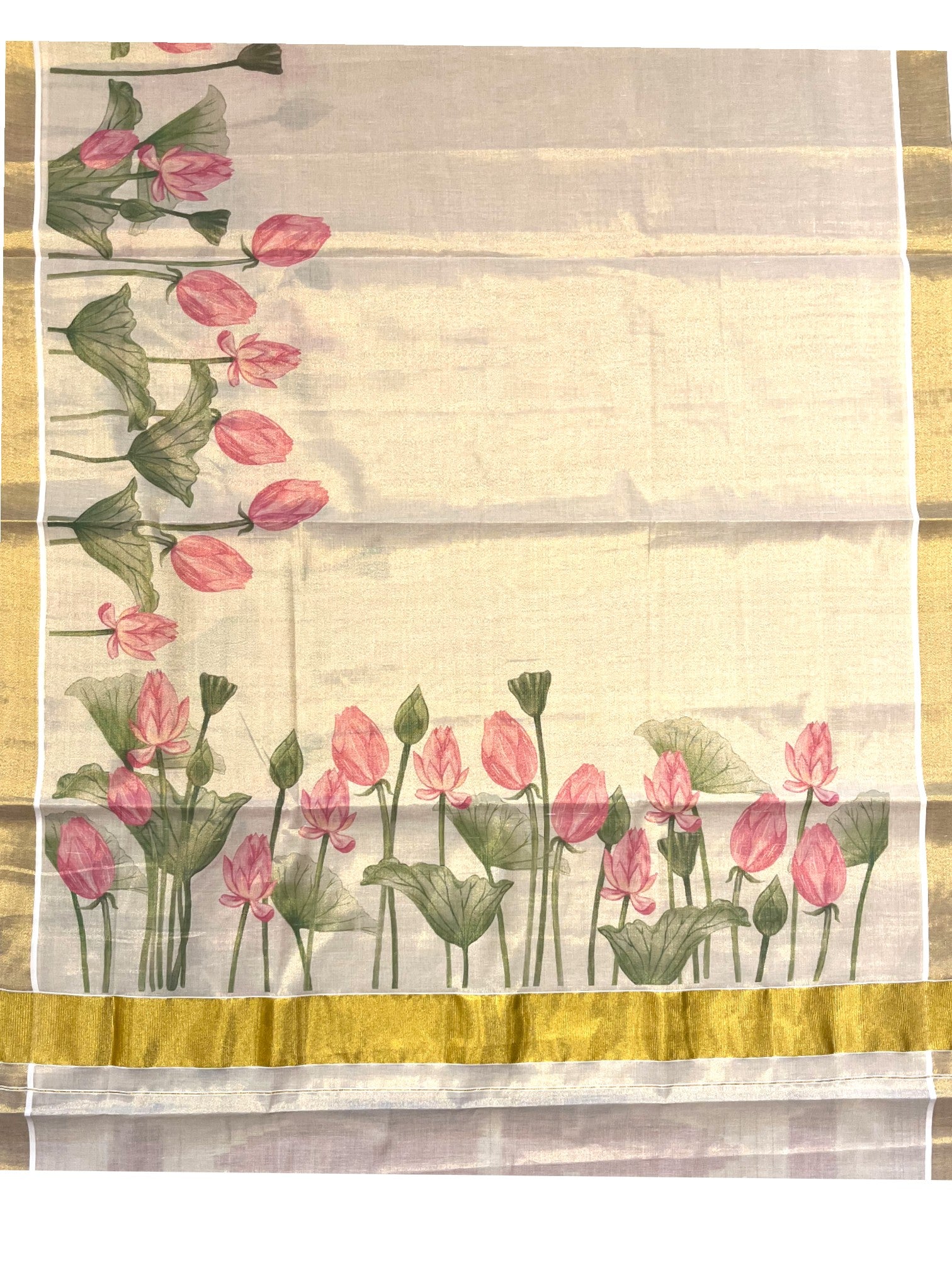 Southloom Kerala Tissue Kasavu Saree with Lotus Digital Prints on Border