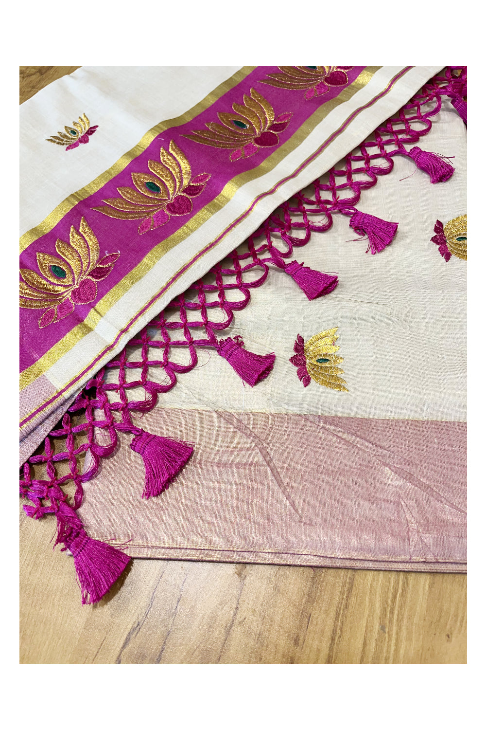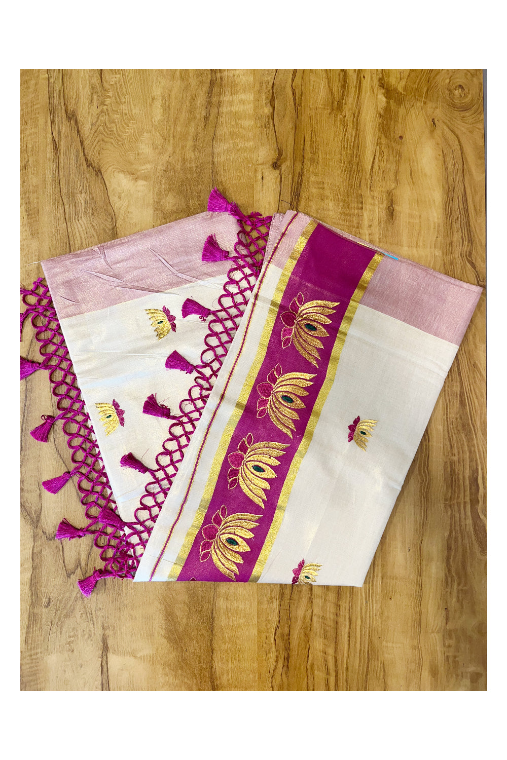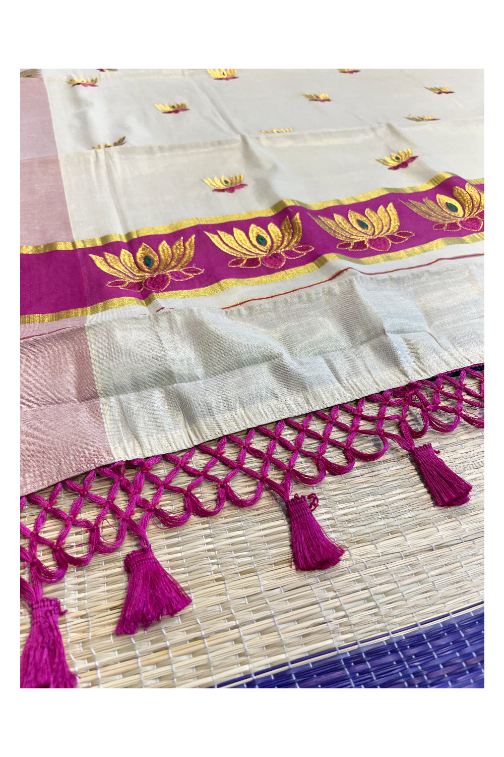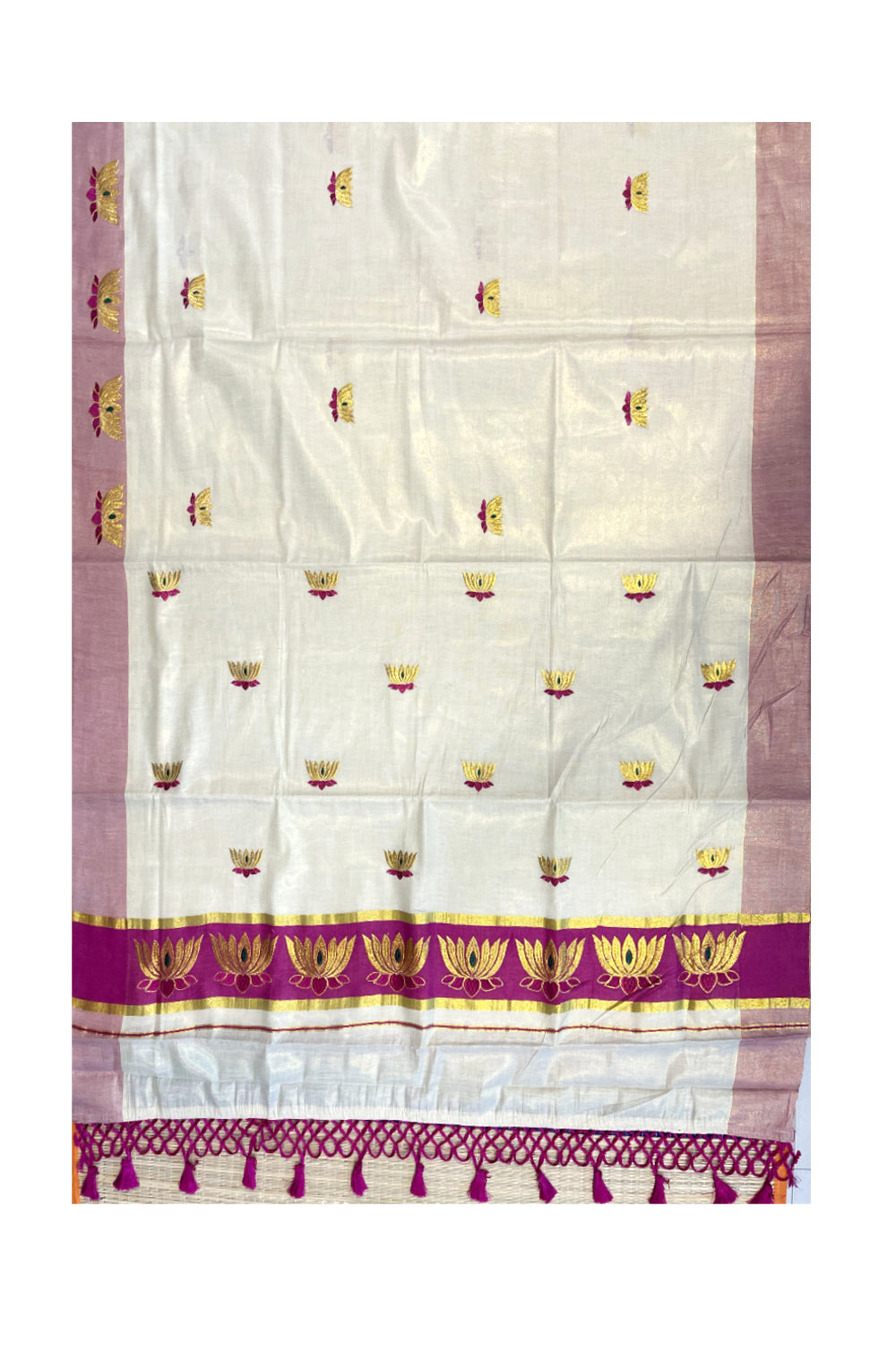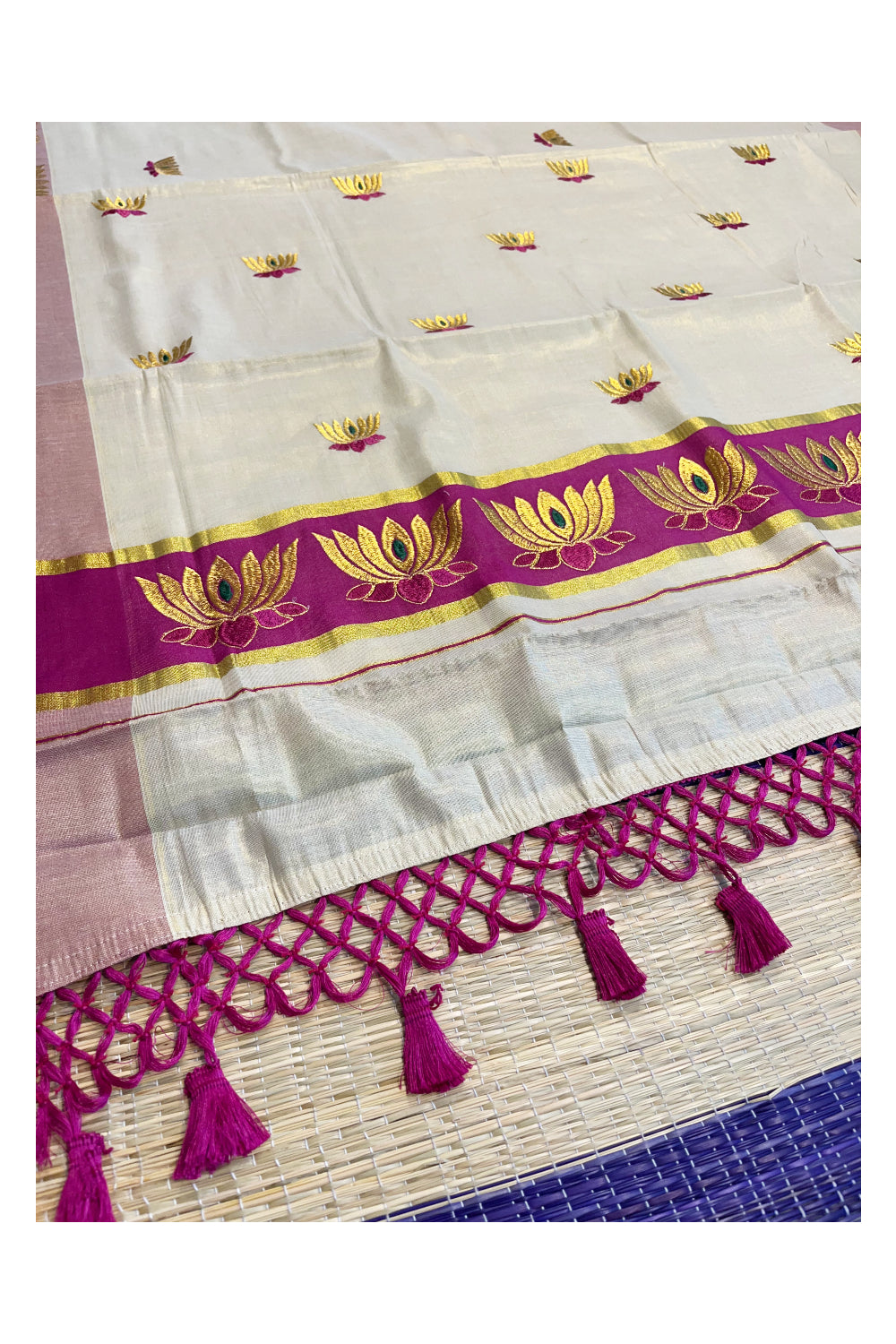 Southloom Kerala Tissue Kasavu Saree with Magenta And Golden Lotus Embroidary Works on Body