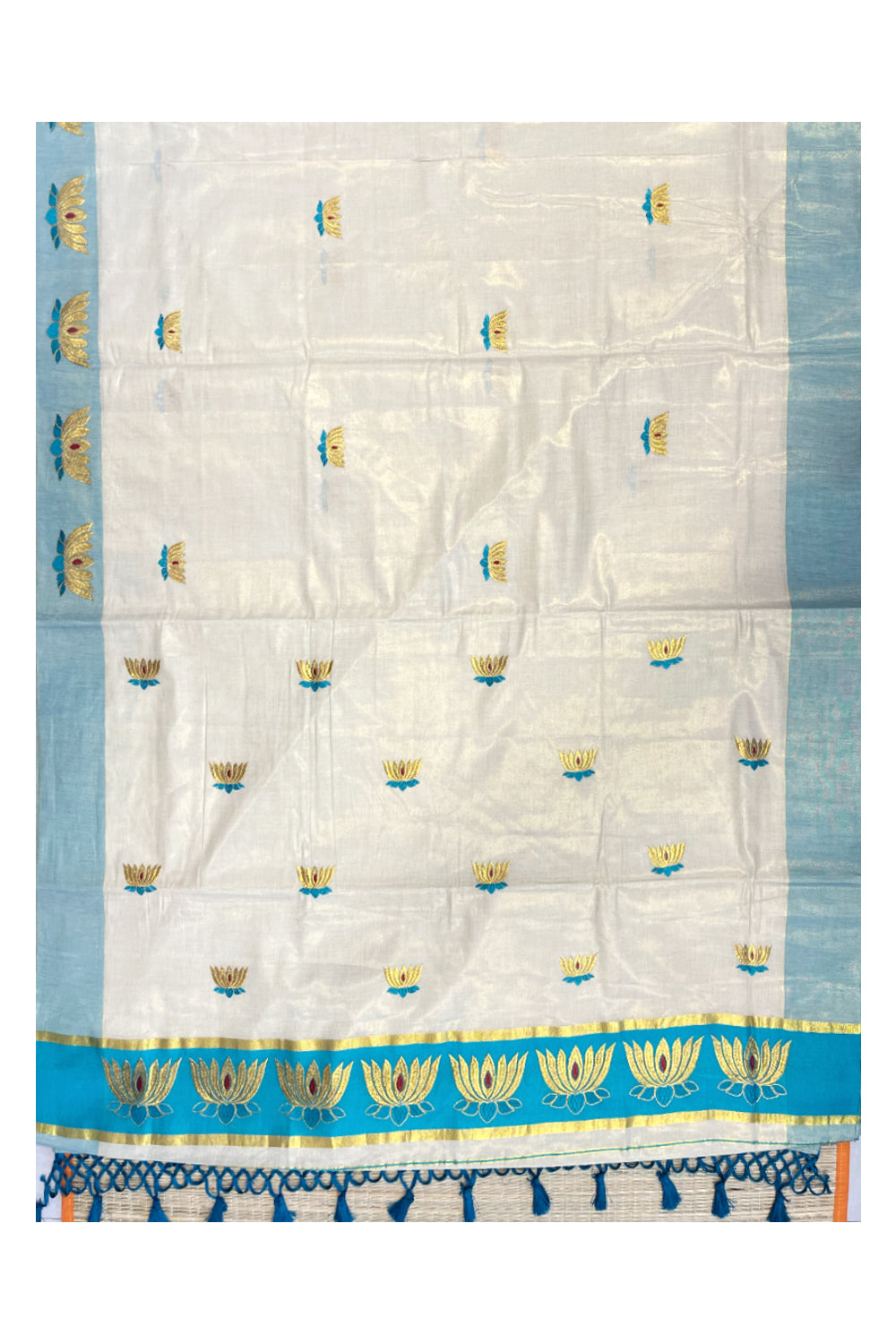 Southloom Kerala Tissue Kasavu Saree with Turquoise And Golden Lotus Embroidary Works on Body