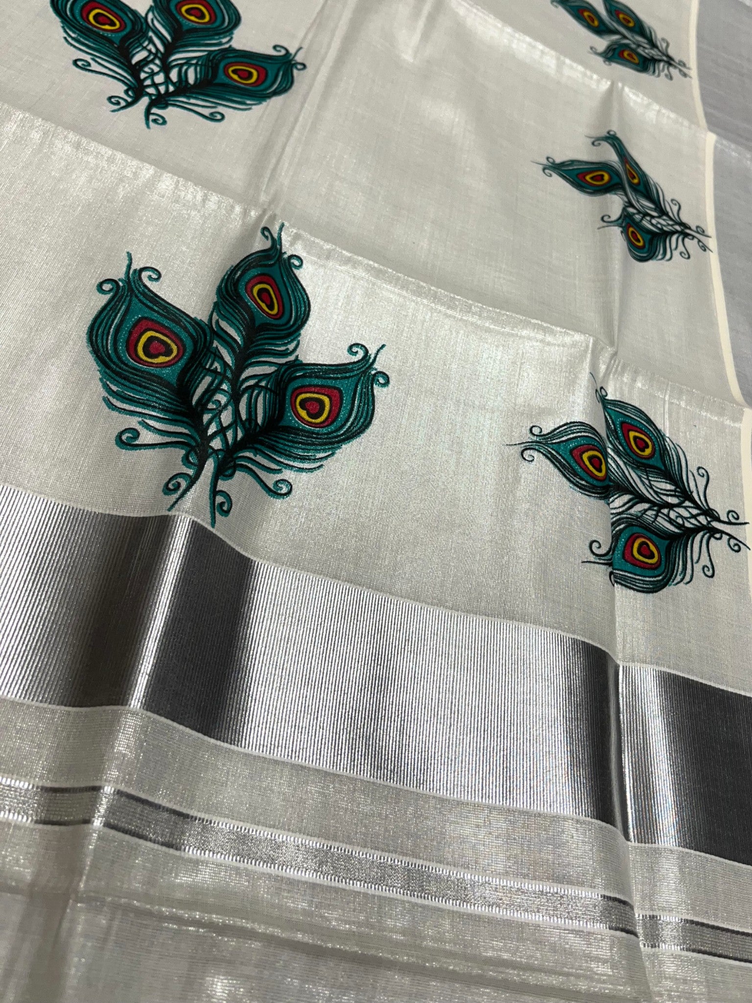 Southloom Kerala Tissue Silver Kasavu Saree with Peacock Feather Mural Print Across Body