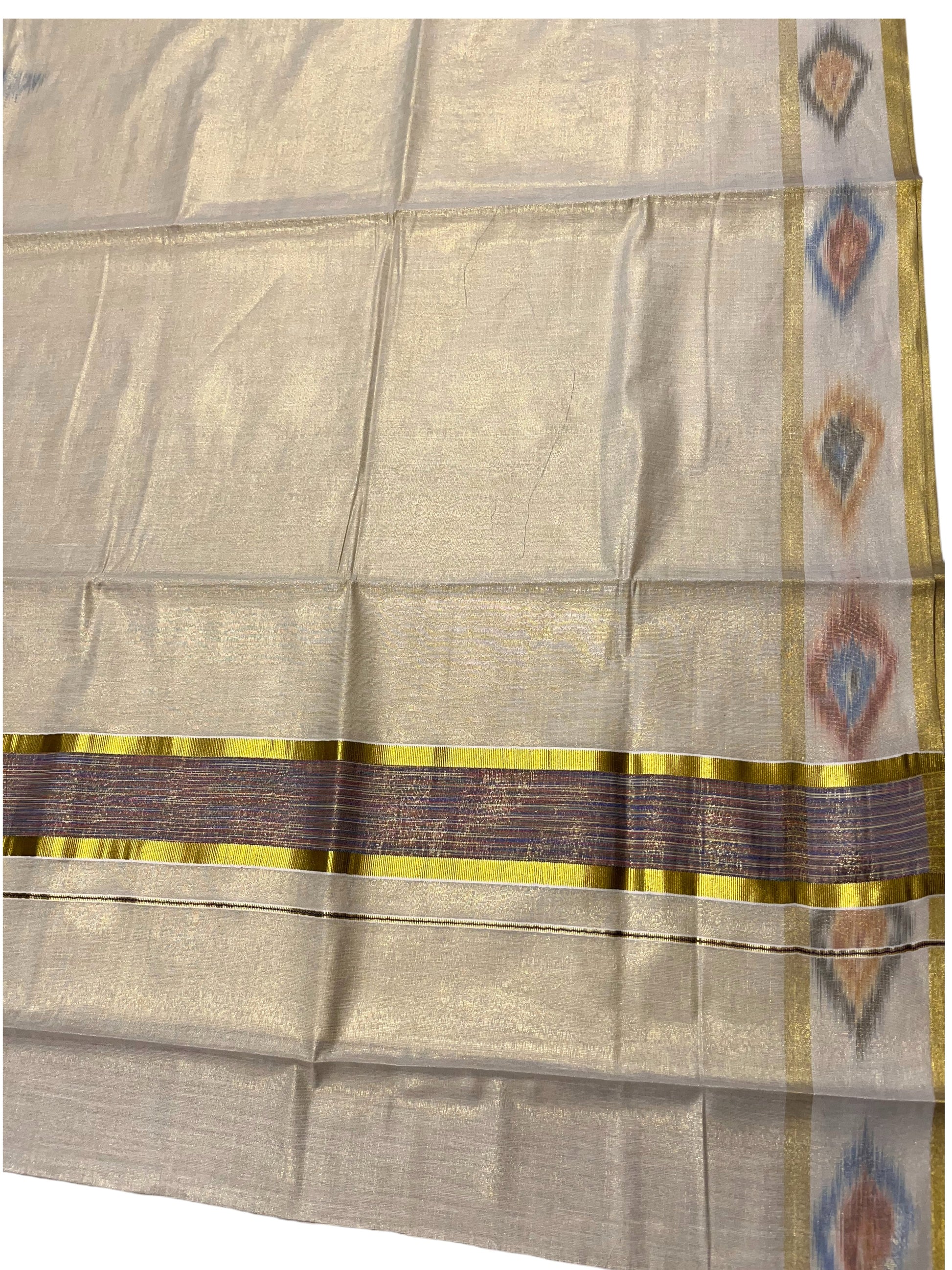 Southloom Kerala Tissue Kasavu Saree with Multi Colour Pochampally Design on Borders and Kara
