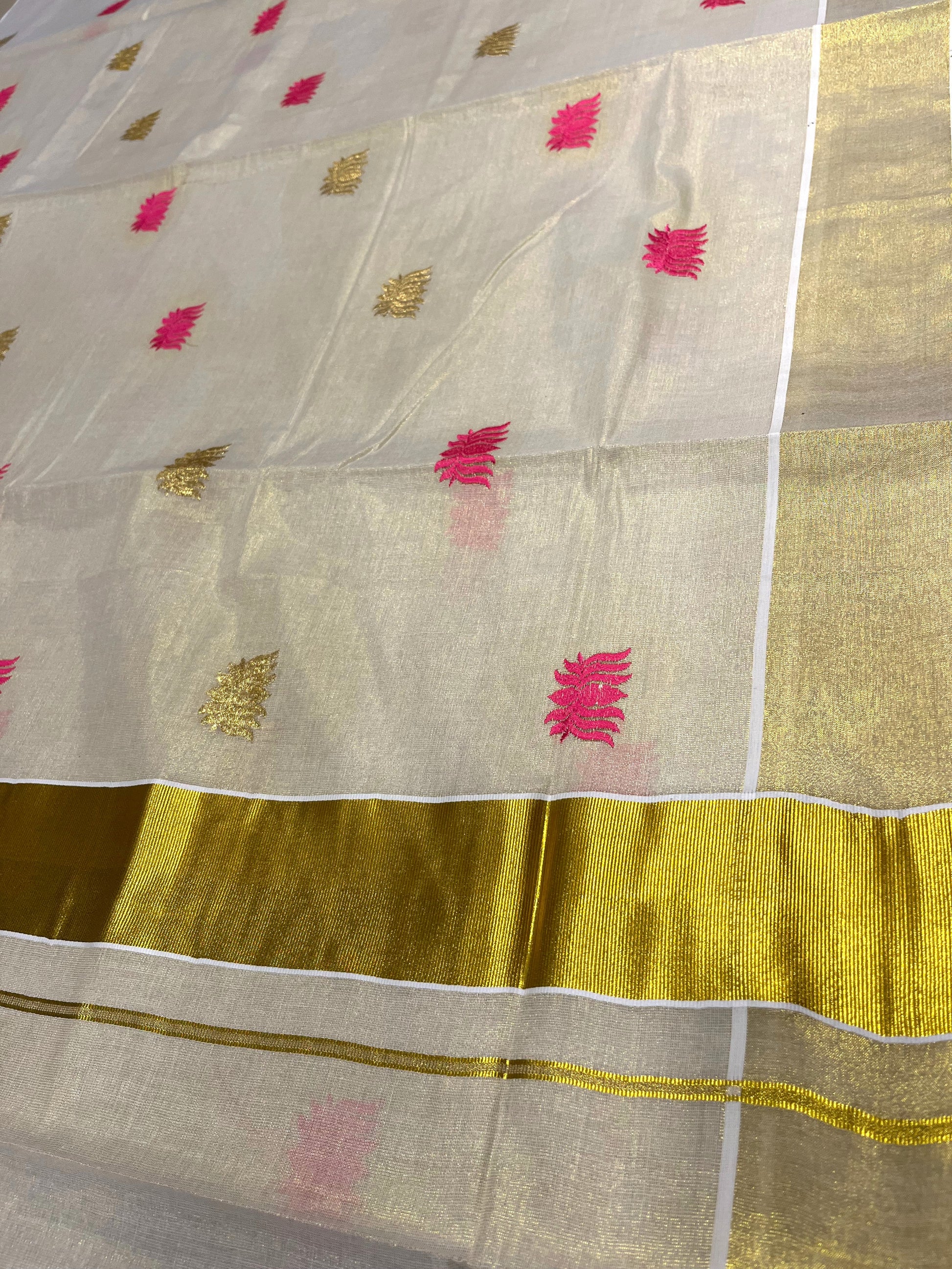 Southloom Kerala Tissue Plain Kasavu Saree with Pink And Gold Lotus Embroidery Works